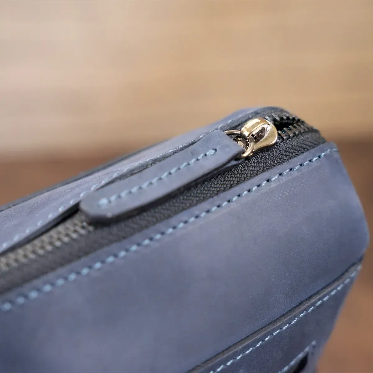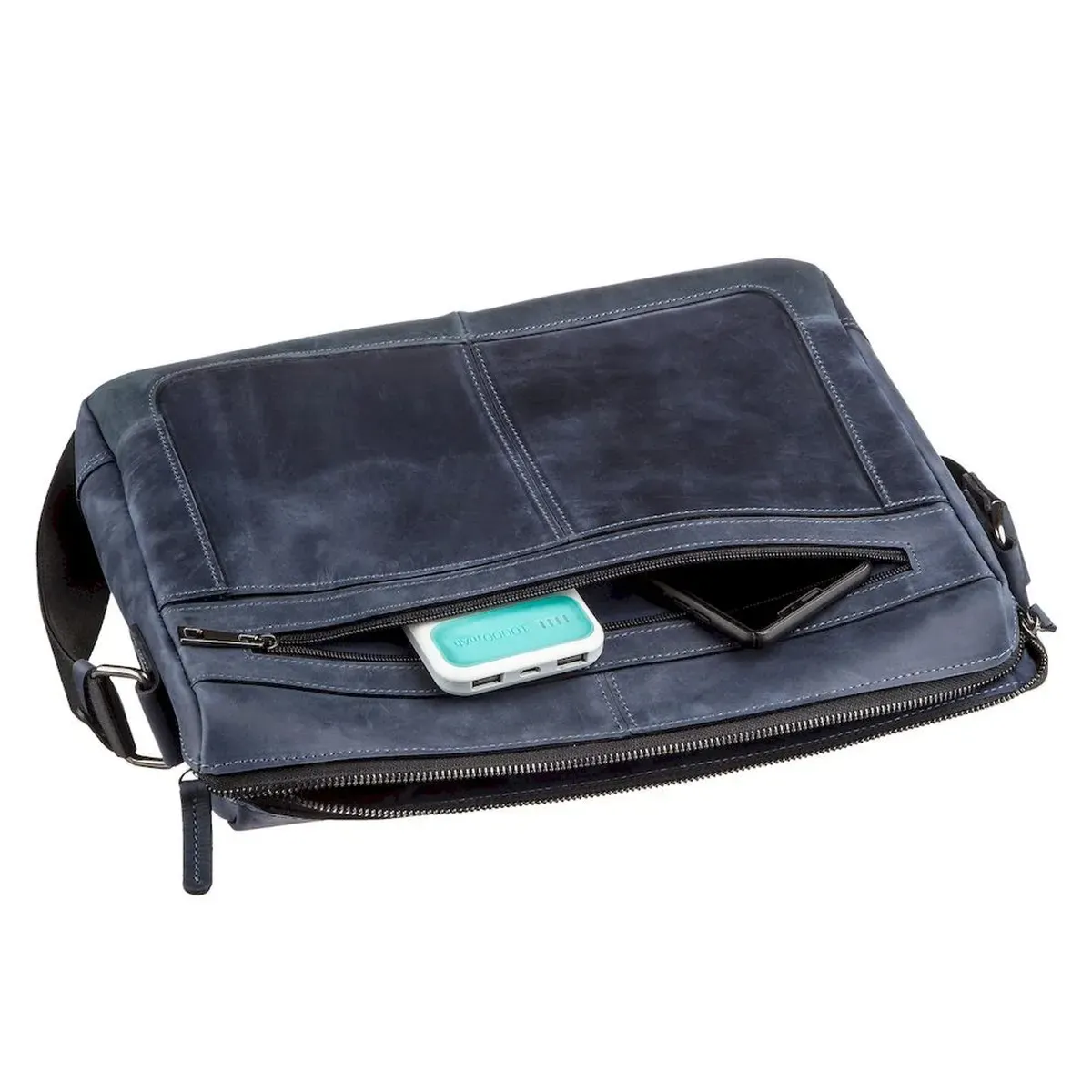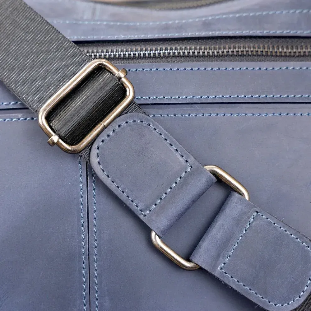 Ділова сумка з натуральної шкіри високої якості. Виріб популярного та оригінального синього кольору. Урожай шкіри виглядає дуже дорого і стильно. Дизайн сумки продуманий до дрібниць. Ви можете носити сумку на плечі. Всередині виробу якісна текстильна підкладка. Ручка сумки не знімається. На лицьовій та тильній стороні аксесуара кишені на блискавці. Модель упакована в тканинний мішок.