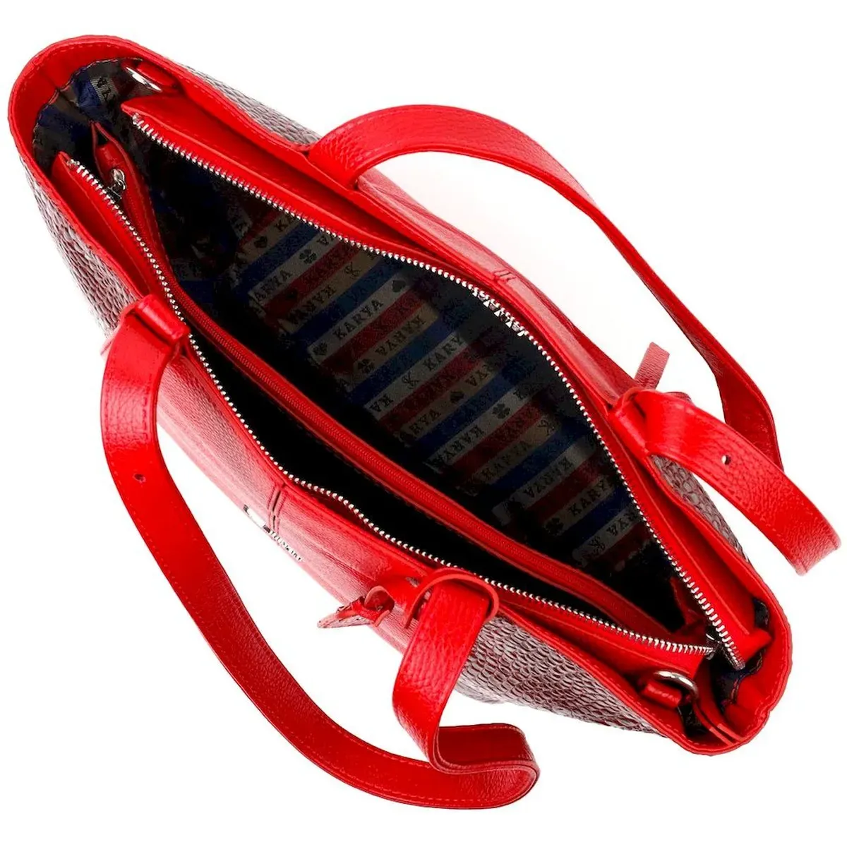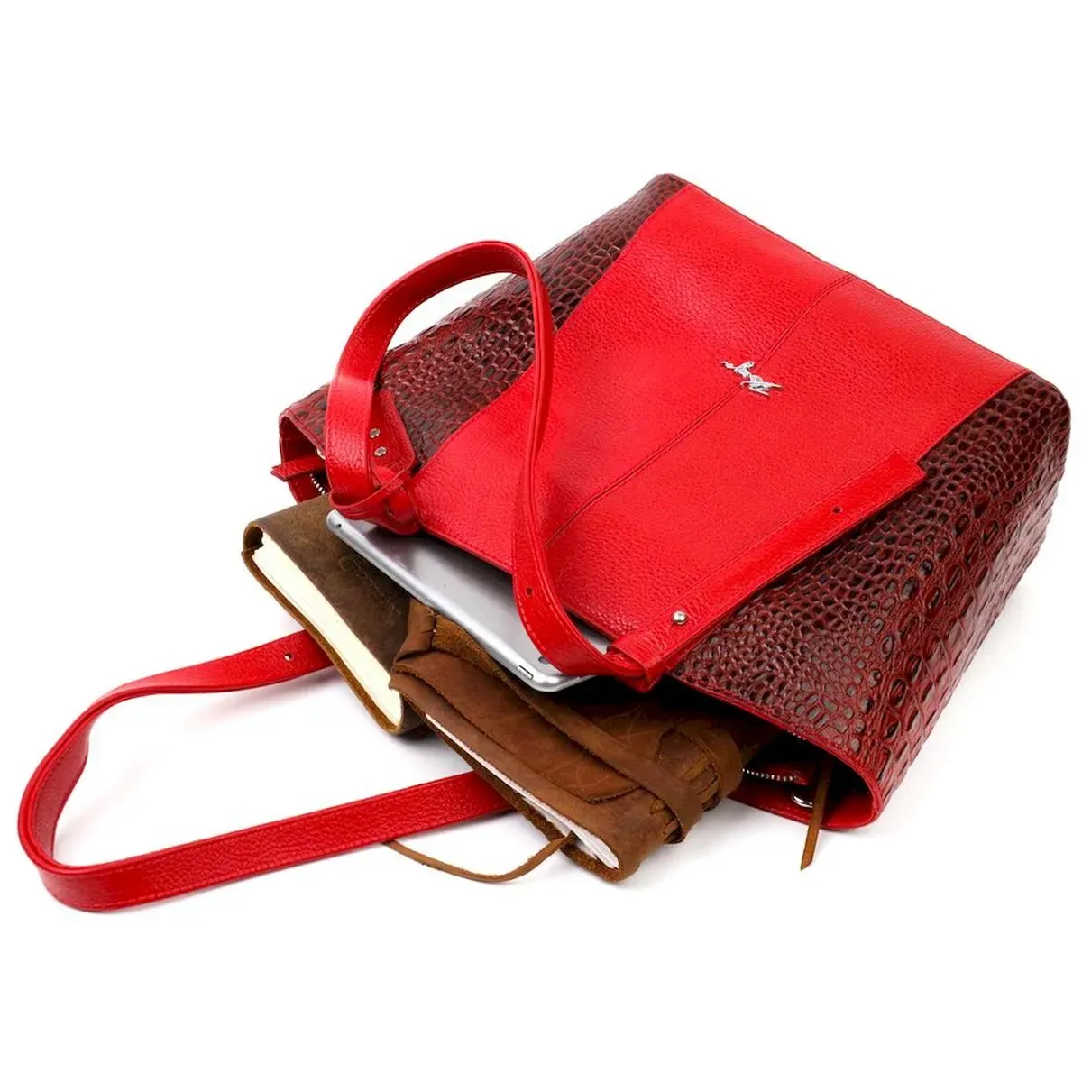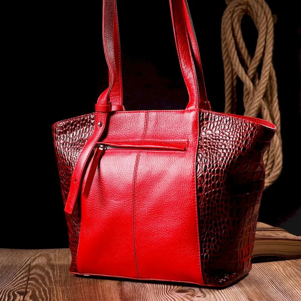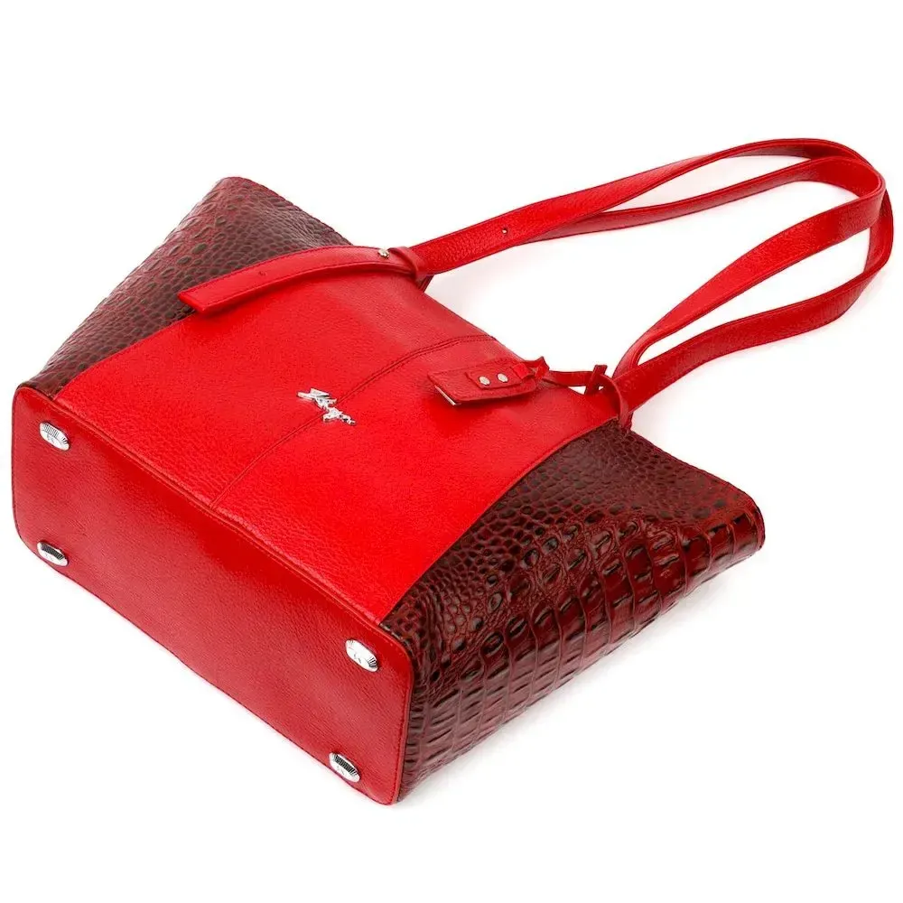 Жіноча сумка середнього розміру з натуральної шкіри з тисненням під крокодила та вставкою із зернистої шкіри, у червоному кольорі. Фурнітура срібного кольору. Сумку зручно носити в руці, на плечі або через плече. Сумка упакована у фірмовий текстильний чохол Karya. Сумка з натуральної шкіри завжди буде чудовим подарунком будь-якій жінці.