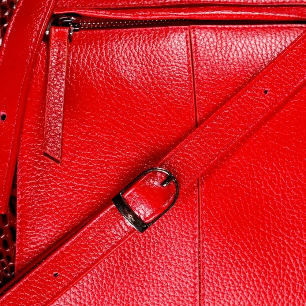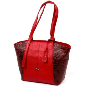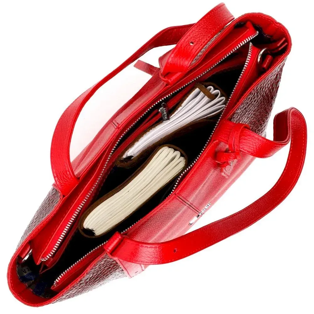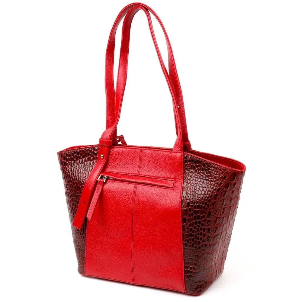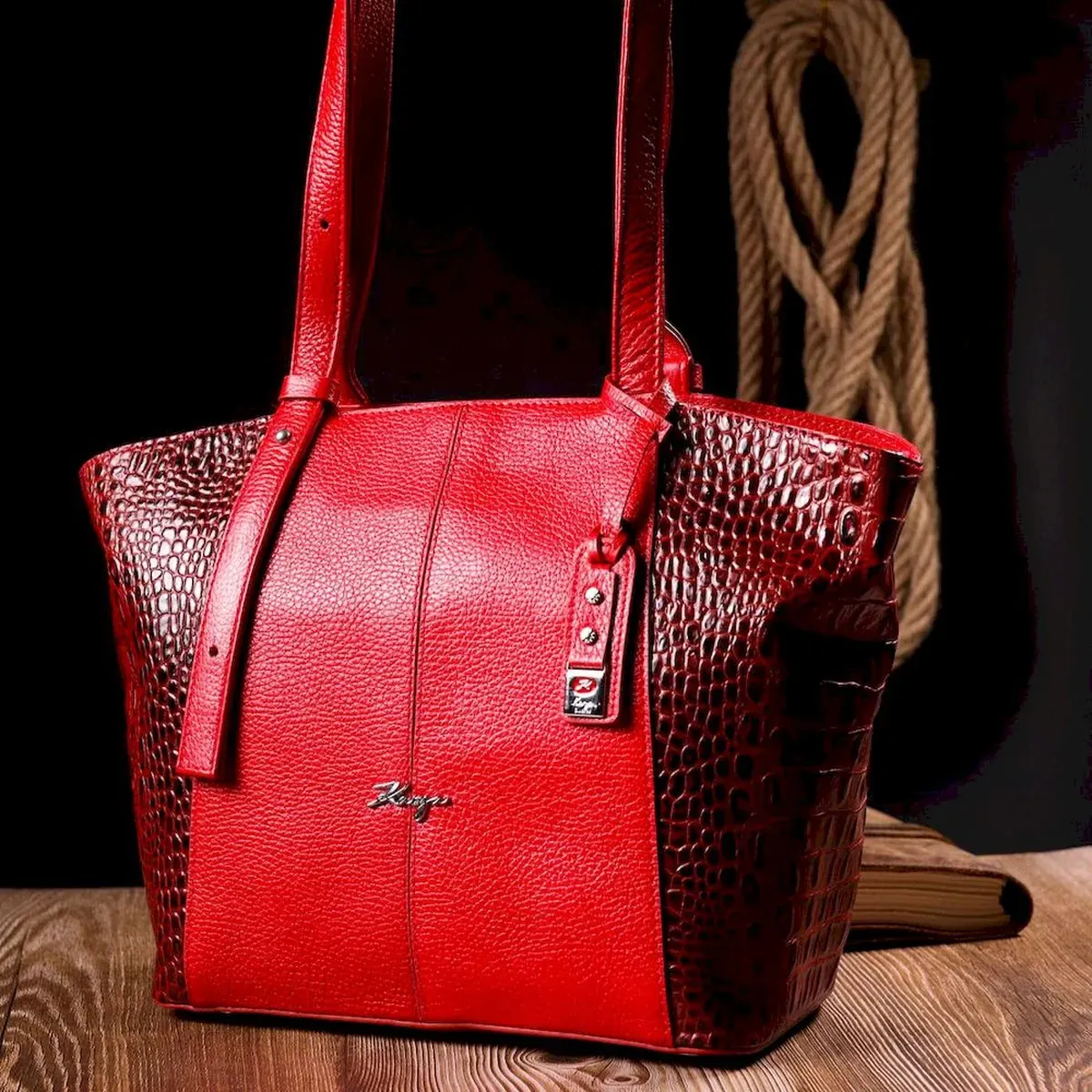 Жіноча сумка середнього розміру з натуральної шкіри з тисненням під крокодила та вставкою із зернистої шкіри, у червоному кольорі. Фурнітура срібного кольору. Сумку зручно носити в руці, на плечі або через плече. Сумка упакована у фірмовий текстильний чохол Karya. Сумка з натуральної шкіри завжди буде чудовим подарунком будь-якій жінці.