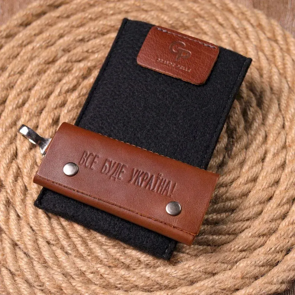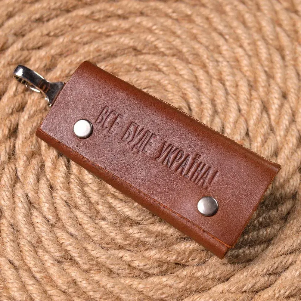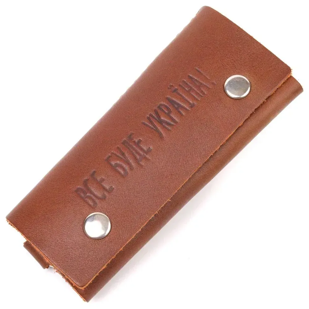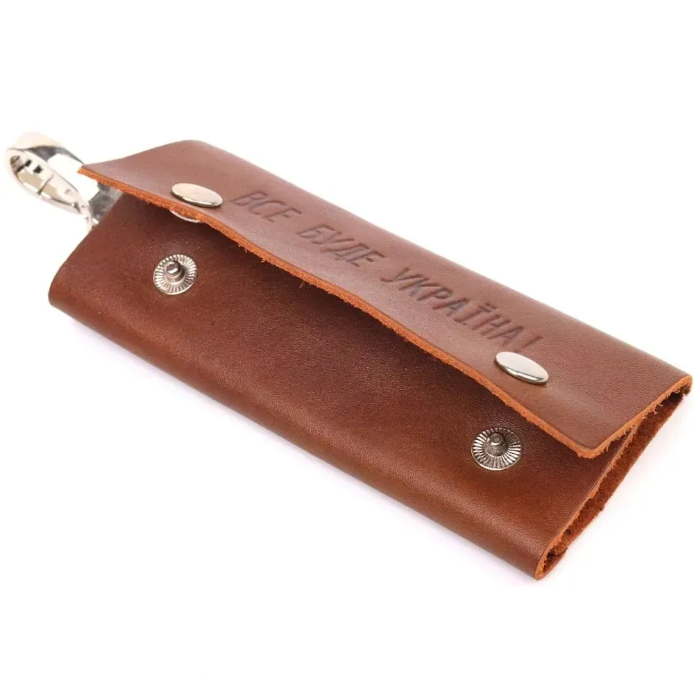 Добротна шкіряна ключниця на кнопках, з патріотичним тисненням на лицьовій стороні. Виріб пошитий з гладкої шкіри, з високими показниками зносостійкості. В аксесуарі використано надійну фурнітуру, кольори срібла. Вироби зі шкіри завжди вважалися відмінним подарунком, незалежно від статі та віку.