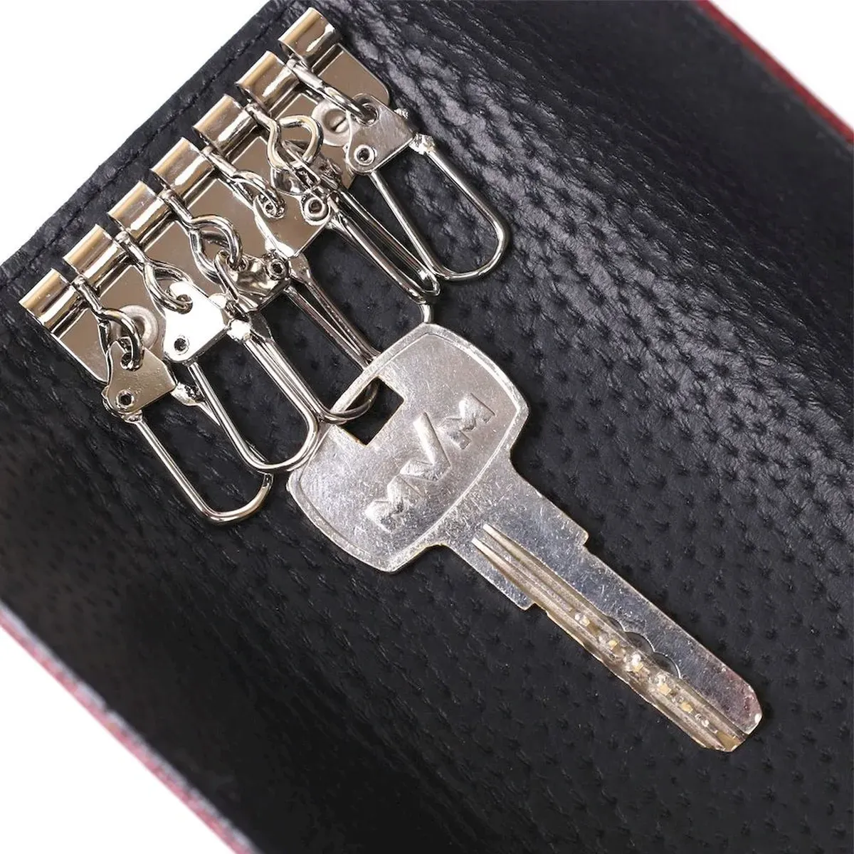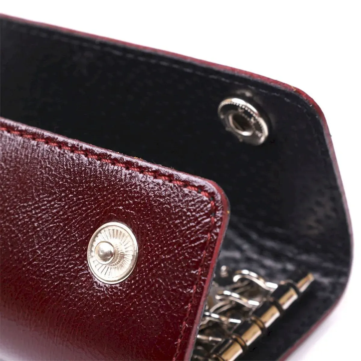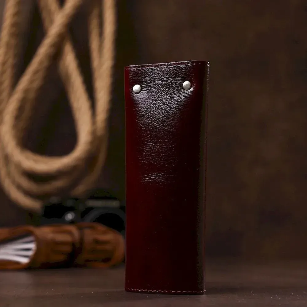 Добротна стильна ключниця в красивому насиченому бордовому кольорі від українського виробника. Виконано виріб з натуральної дуже щільної шкіри з відмінними показниками міцності. Усередині розташовано шість металевих карабінів для кріплення ключів. Закривається ключниця на дві кнопки, що дуже зручно.