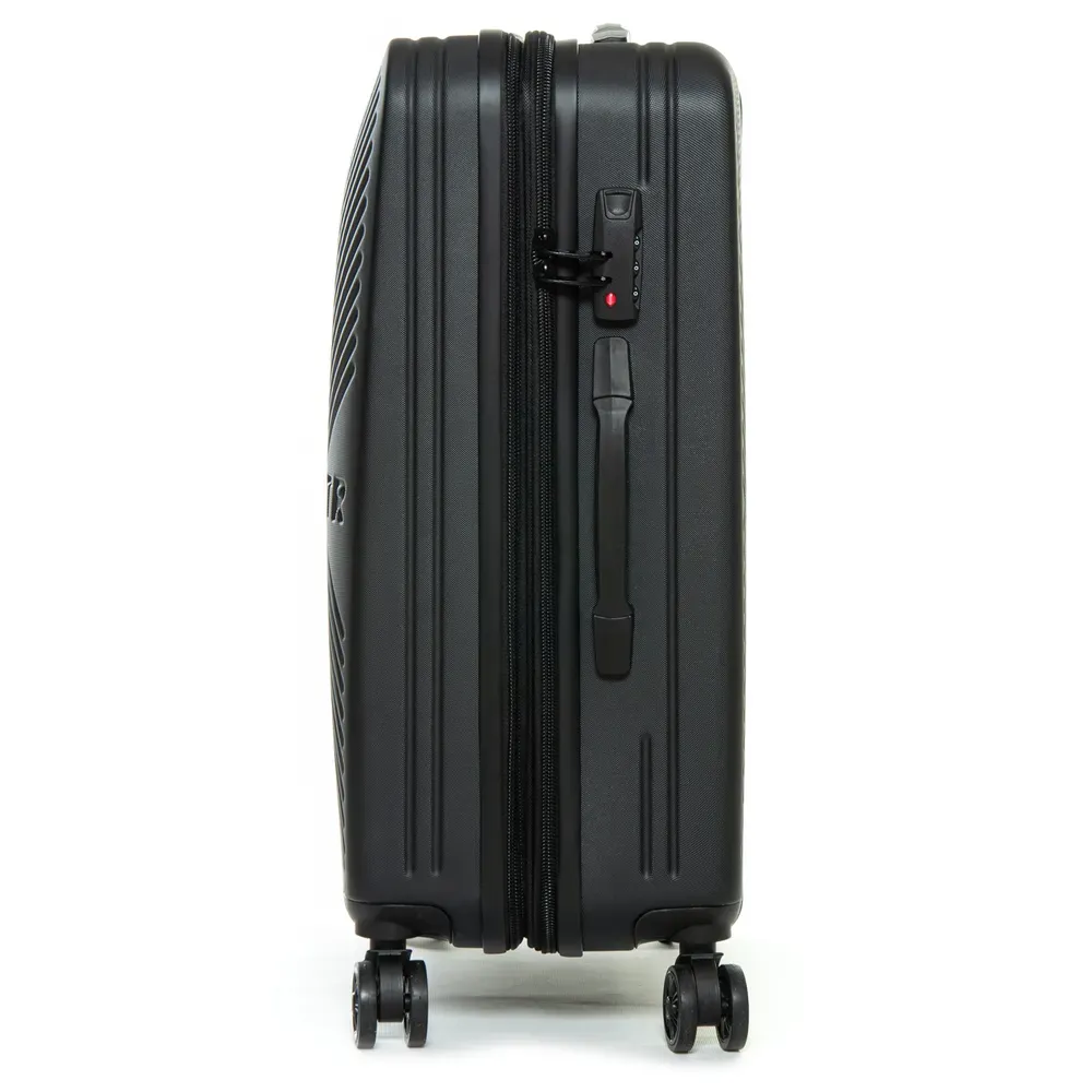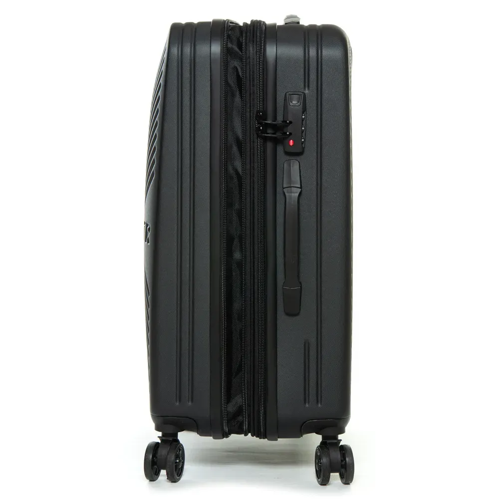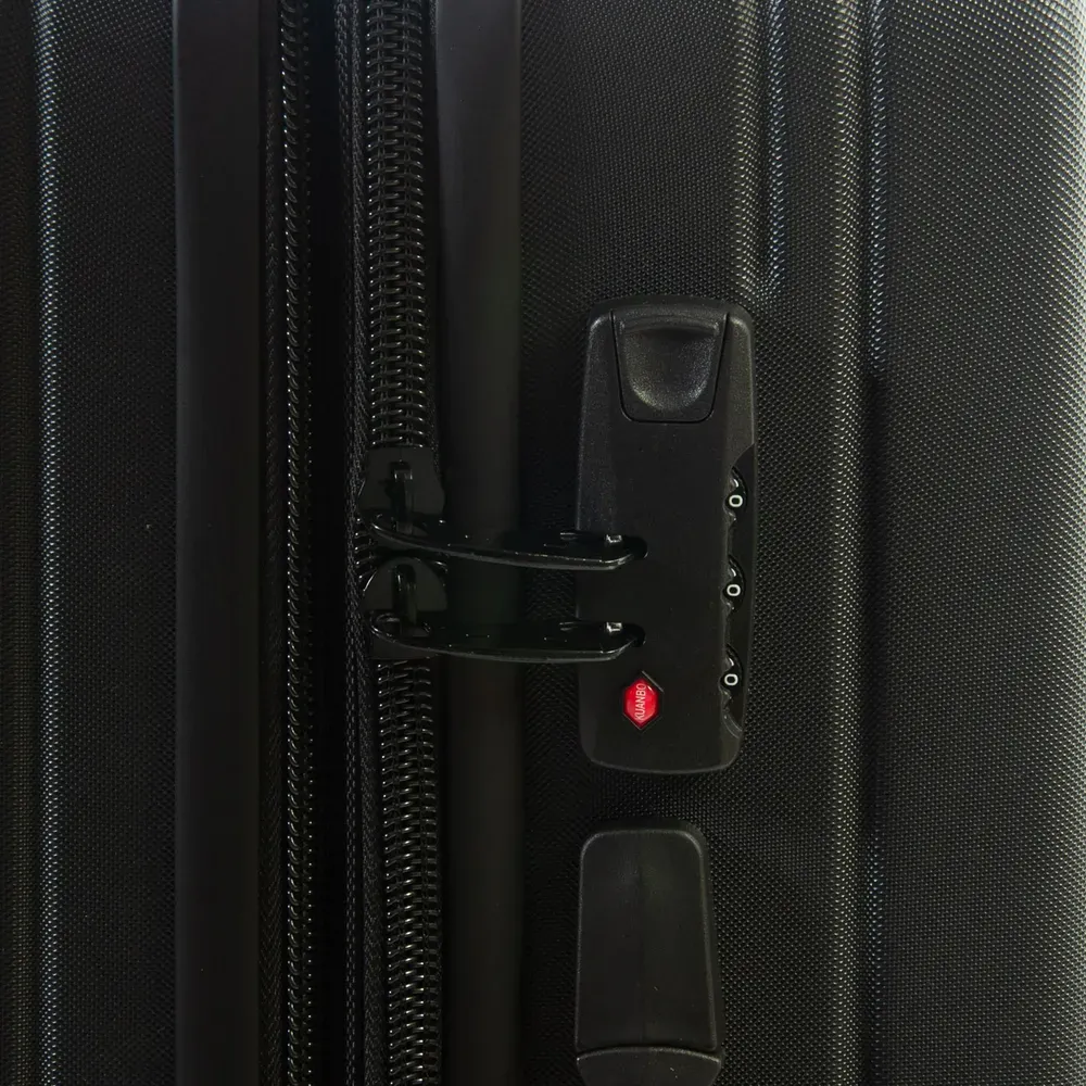 Пластиковый чемодан, выполненный из ударопрочного ABS пластика. Закрывается на молнию с кодовым замком. Объем чемодана можно увеличить используя молнию расширения (увеличивает глубину чемодана на 3см.). 4 полиуретановых двойных колеса. Внутри чемодана есть двойной отделение с карманом-перегородкой на молнии для мелких вещей и стяжки-резинки для фиксации багажа.