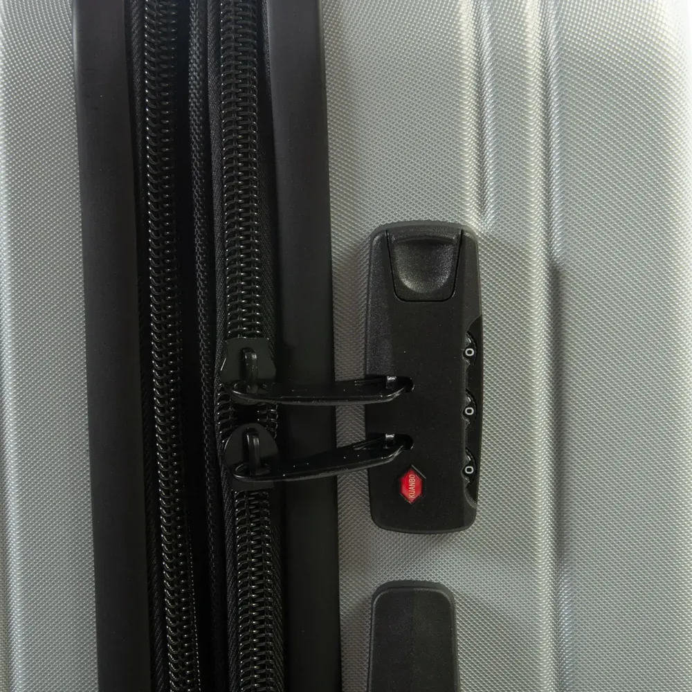 Пластиковый чемодан, выполненный из ударопрочного ABS пластика. Закрывается на молнию с кодовым замком. Объем чемодана можно увеличить используя молнию расширения (увеличивает глубину чемодана на 3см.). 4 полиуретановых двойных колеса. Внутри чемодана есть двойной отделение с карманом-перегородкой на молнии для мелких вещей и стяжки-резинки для фиксации багажа.