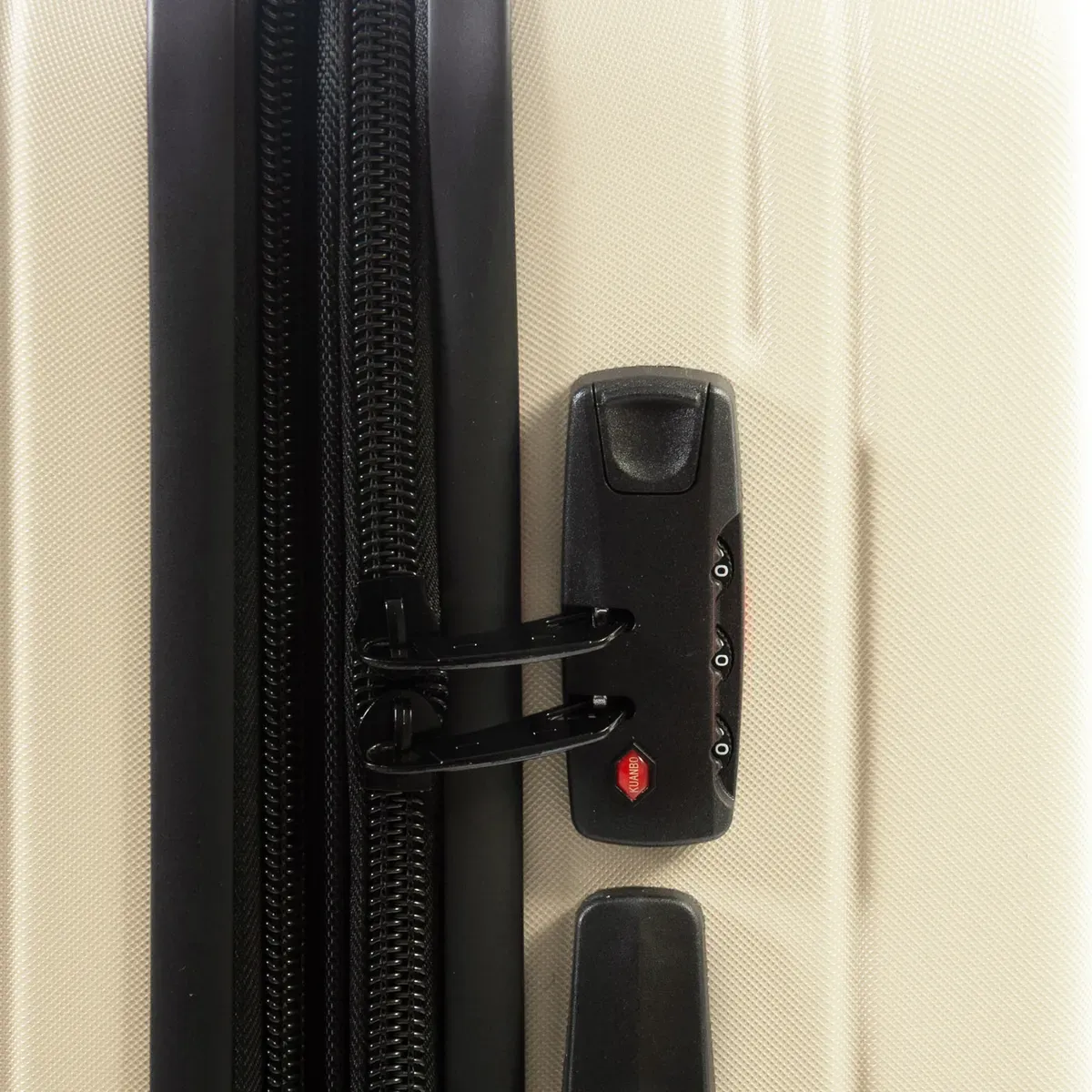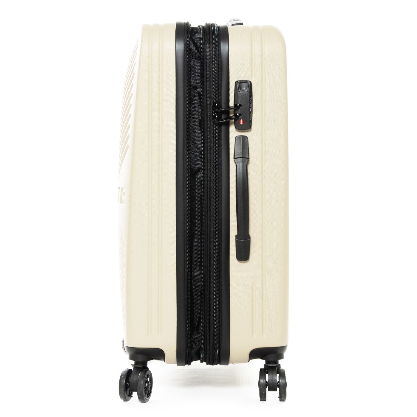 Пластиковый чемодан, выполненный из ударопрочного ABS пластика. Закрывается на молнию с кодовым замком. Объем чемодана можно увеличить используя молнию расширения (увеличивает глубину чемодана на 3см.). 4 полиуретановых двойных колеса. Внутри чемодана есть двойной отделение с карманом-перегородкой на молнии для мелких вещей и стяжки-резинки для фиксации багажа.