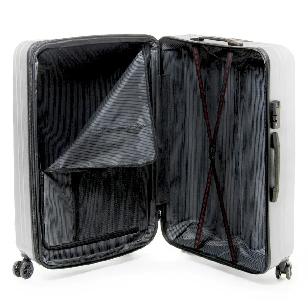 Пластикова валіза, виконана з удароміцного ABS пластику. Закривається на блискавку із кодовим замком. Об'єм валізи можна збільшити використовуючи блискавку розширення (збільшує глибину валізи на 3см). 4 поліуретанові подвійні колеса. Усередині валізи є подвійне відділення з кишенею-перегородкою на блискавці для дрібних речей та стяжки-гумки для фіксації багажу.