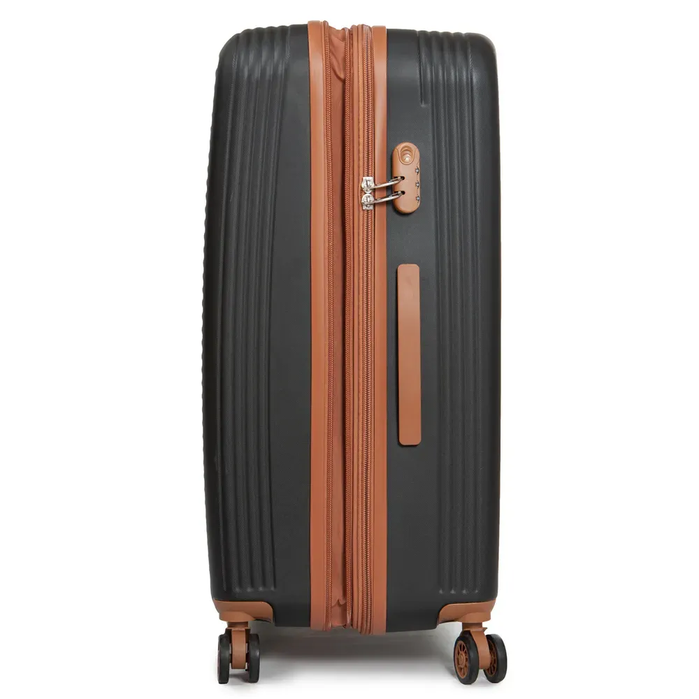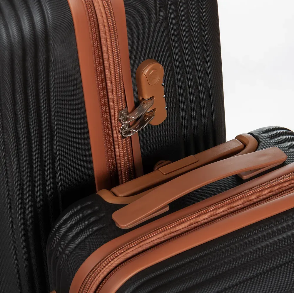 Пластиковый чемодан, выполненный из ударопрочного ABS пластика. Закрывается на молнию с кодовым замком. Объем чемодана можно увеличить используя молнию расширения (увеличивает глубину чемодана на 3см.). 4 полиуретановых двойных колеса. Внутри чемодана есть двойной отделение с карманом-перегородкой на молнии для мелких вещей и стяжки-резинки для фиксации багажа.