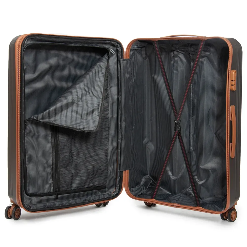 Пластиковый чемодан, выполненный из ударопрочного ABS пластика. Закрывается на молнию с кодовым замком. Объем чемодана можно увеличить используя молнию расширения (увеличивает глубину чемодана на 3см.). 4 полиуретановых двойных колеса. Внутри чемодана есть двойной отделение с карманом-перегородкой на молнии для мелких вещей и стяжки-резинки для фиксации багажа.
