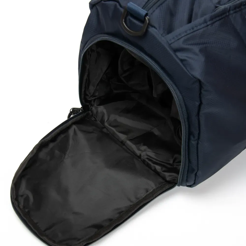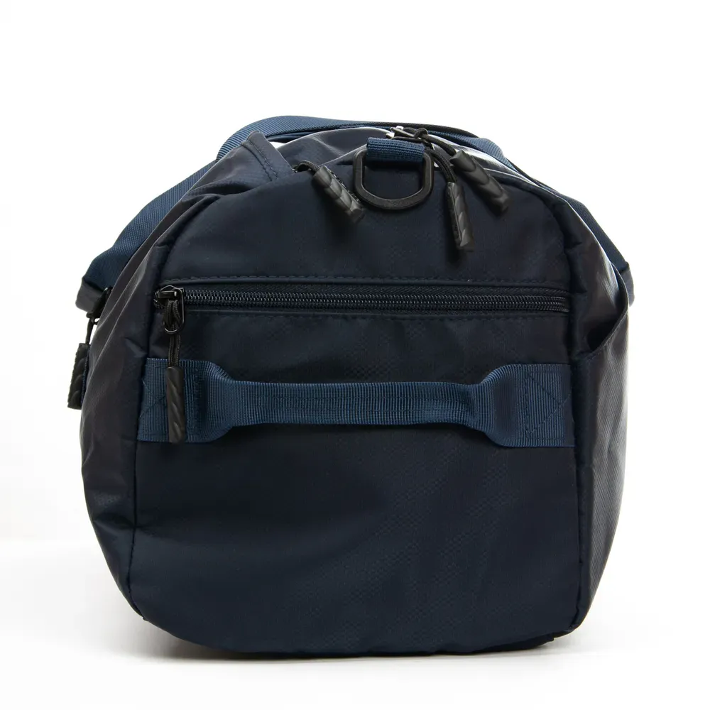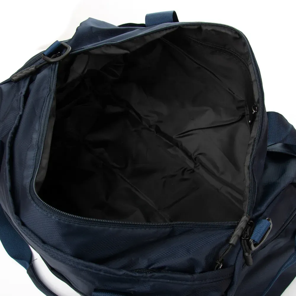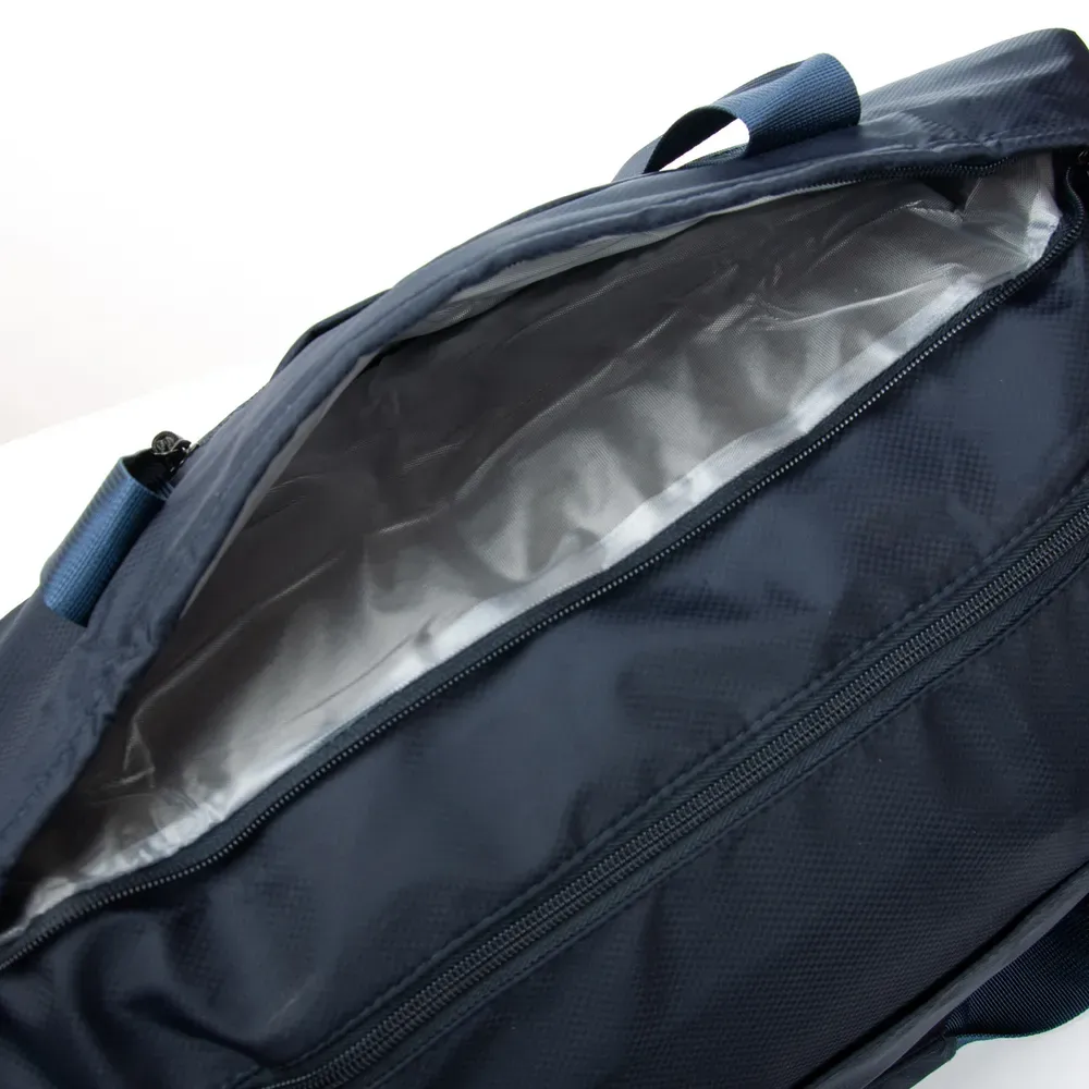 Одно отделение, закрывается на молнию. Внутри отделения есть большой боковой карман на молнии. Снаружи также расположен большой карман-отделение на молнии с герметичной подкладкой. На фасаде находятся три открытых кармана. На обратной стороне расположен карман на молнии и крепление на ручку чемодана. На торцах сумки есть два кармана на молнии, один из которых предназначен для обуви.