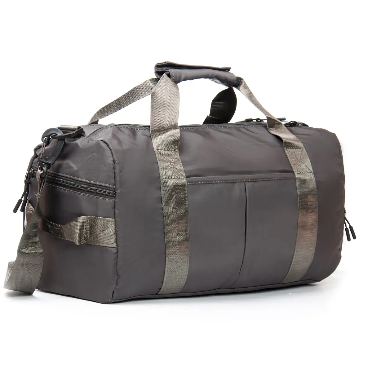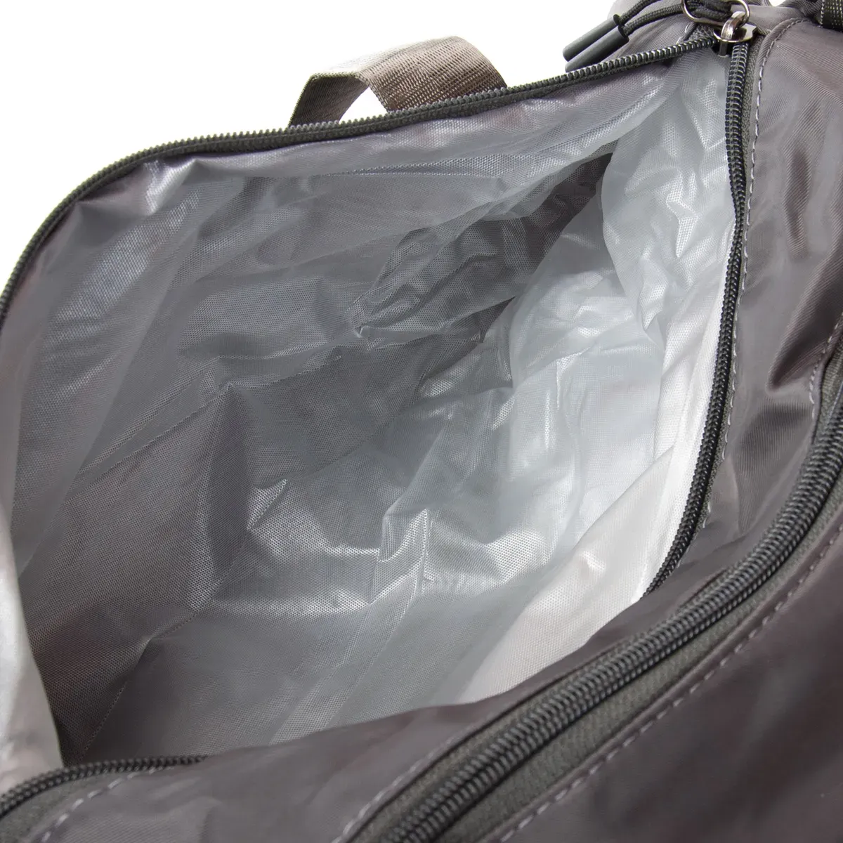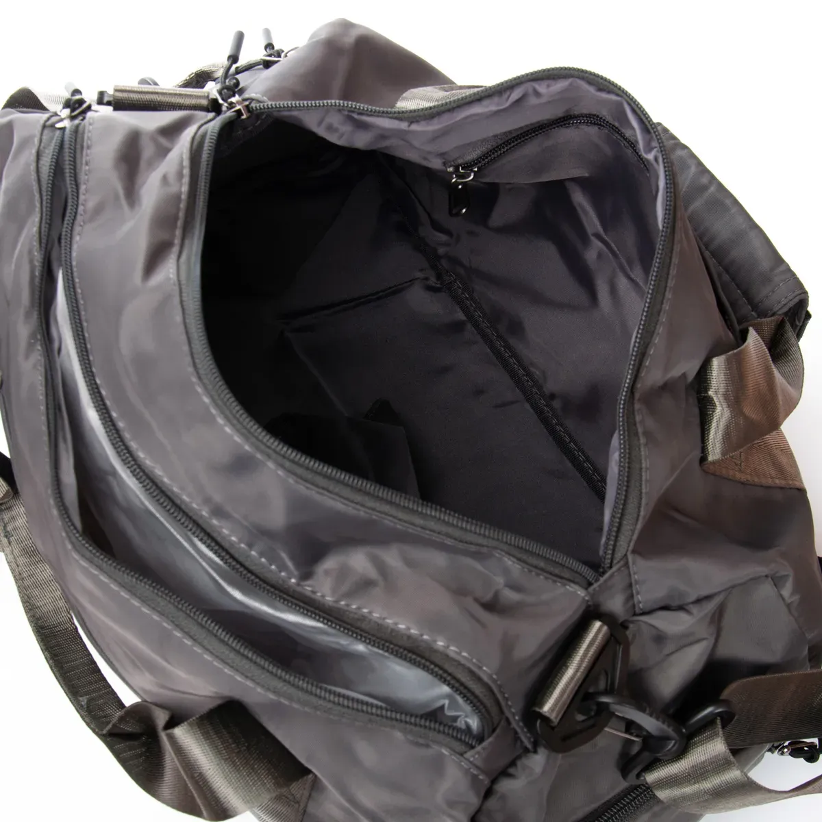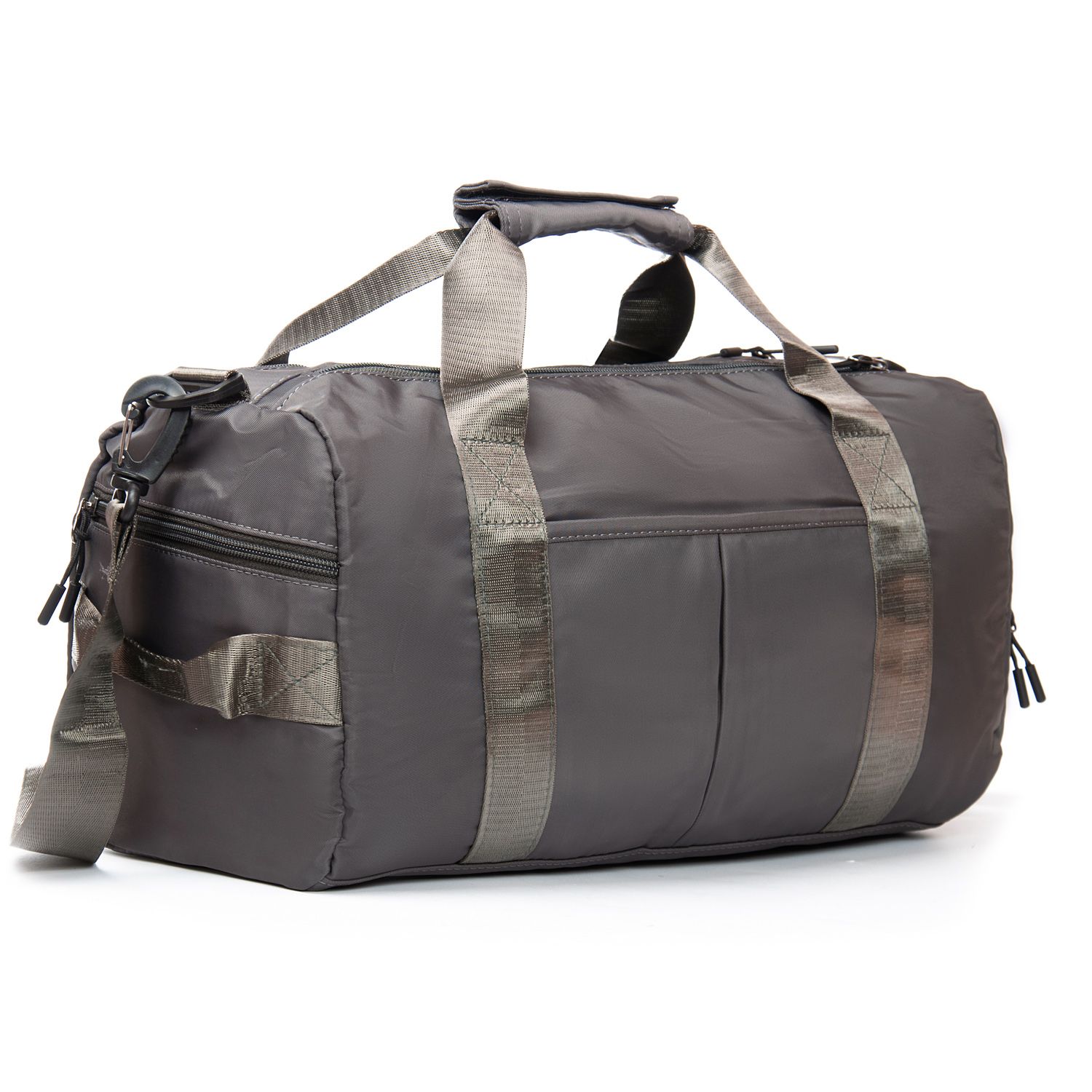 Одно отделение, закрывается на молнию. Внутри отделения есть большой боковой карман на молнии. Снаружи также расположен большой карман-отделение на молнии с герметичной подкладкой. На фасаде находится один открытый карман. На обратной стороне есть крепление на ручку чемодана. На торцах сумки есть два кармана на молнии, один из которых предназначен для обуви.
