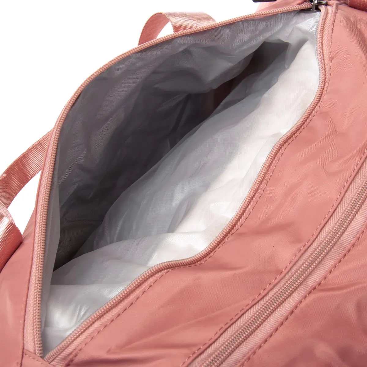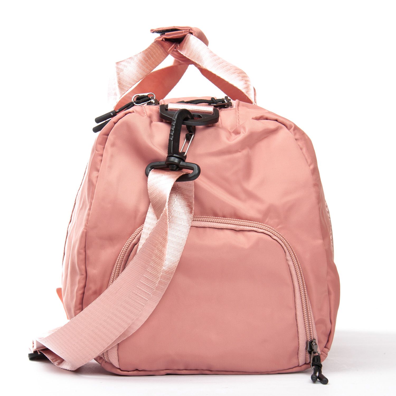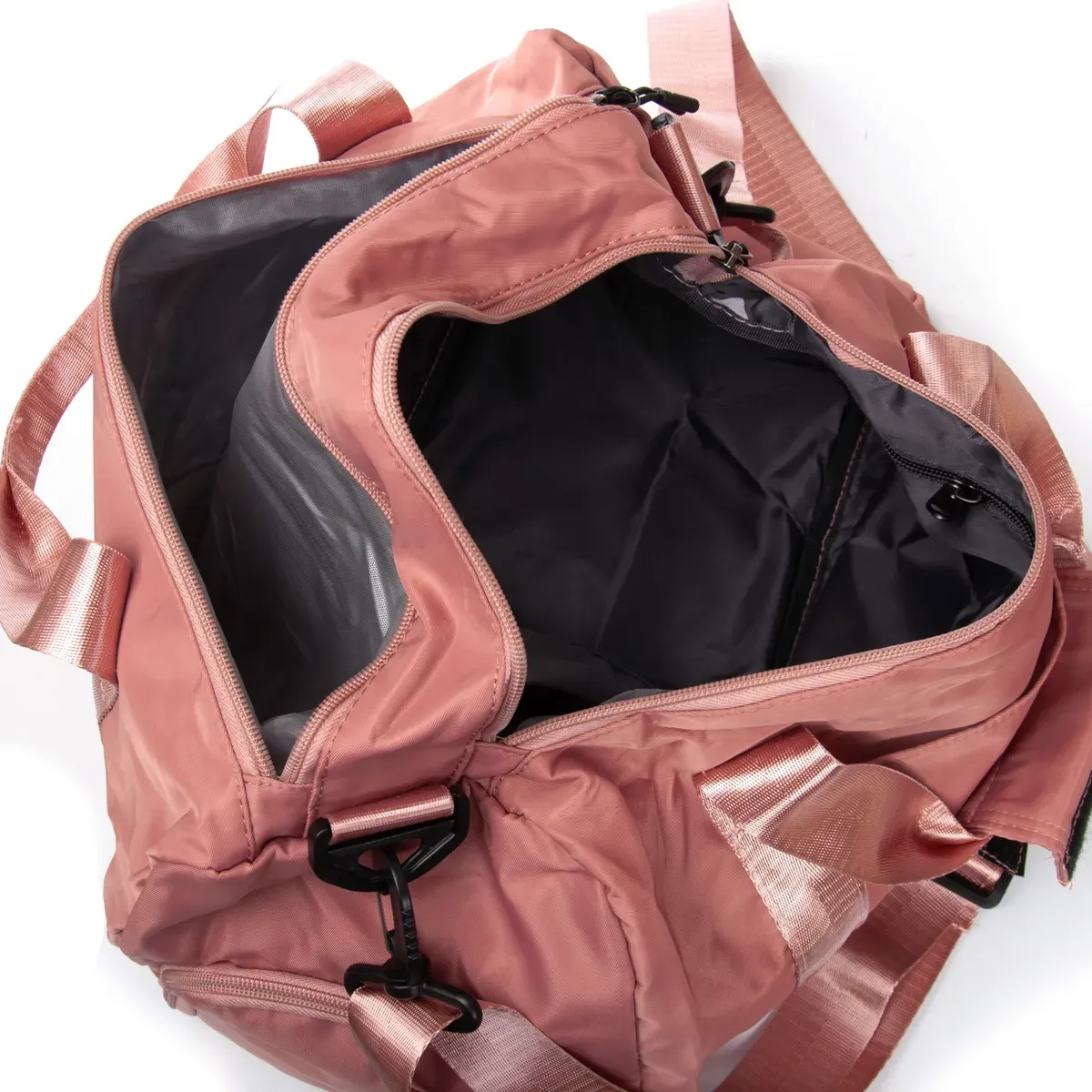 Одно отделение, закрывается на молнию. Внутри отделения есть большой боковой карман на молнии. Снаружи также расположен большой карман-отделение на молнии с герметичной подкладкой. На фасаде находится один открытый карман. На обратной стороне есть крепление на ручку чемодана. На торцах сумки есть два кармана на молнии, один из которых предназначен для обуви.