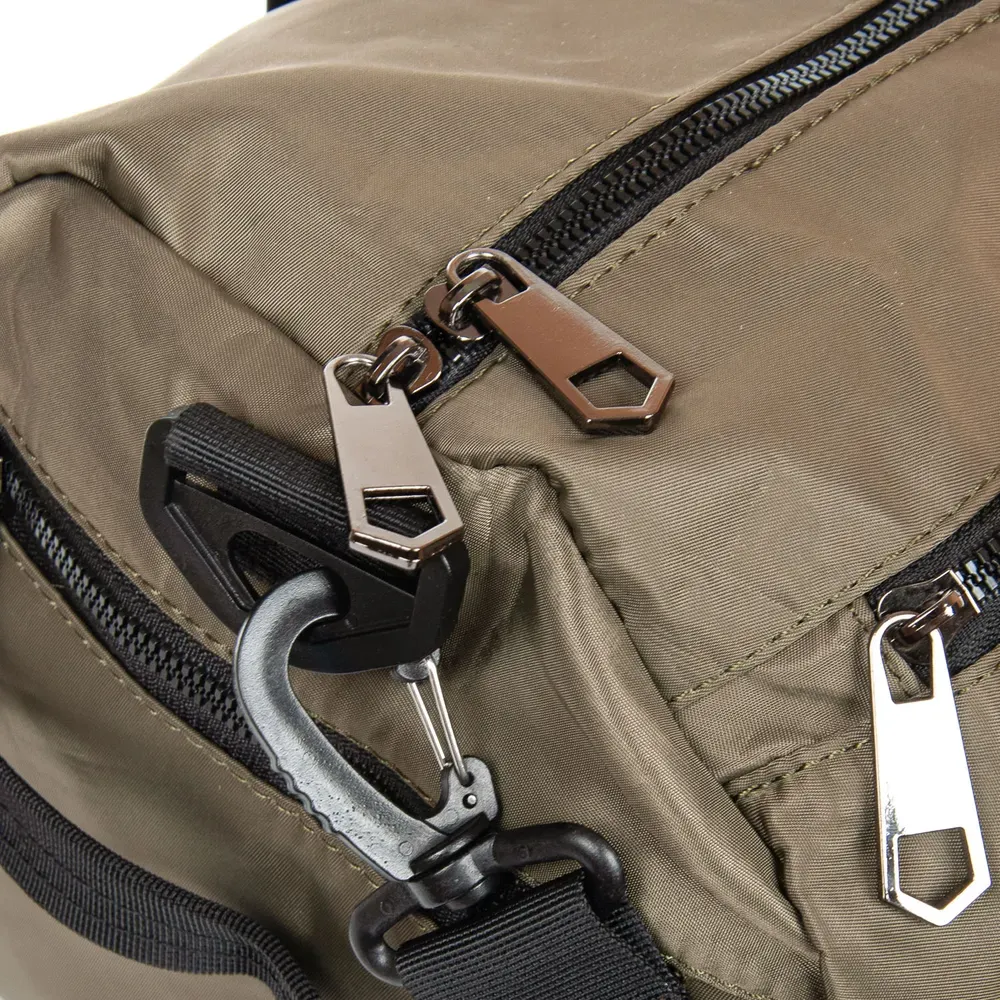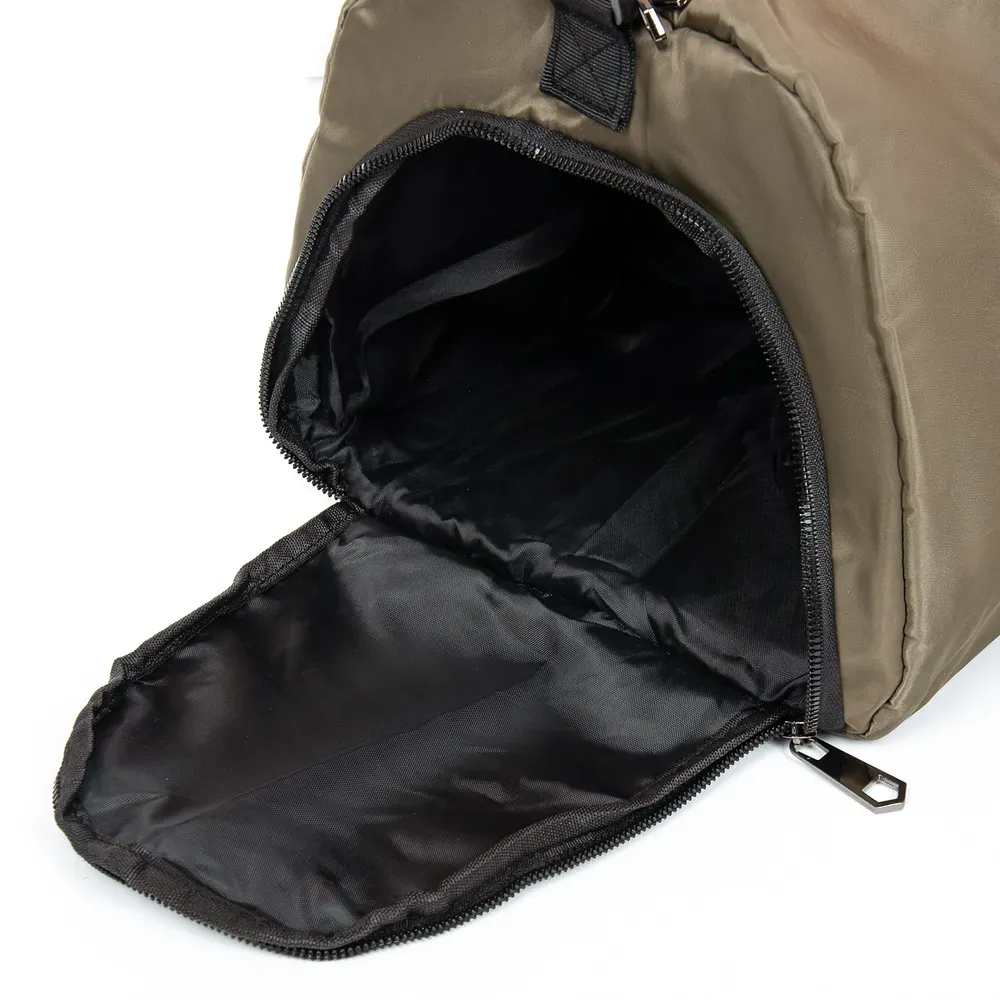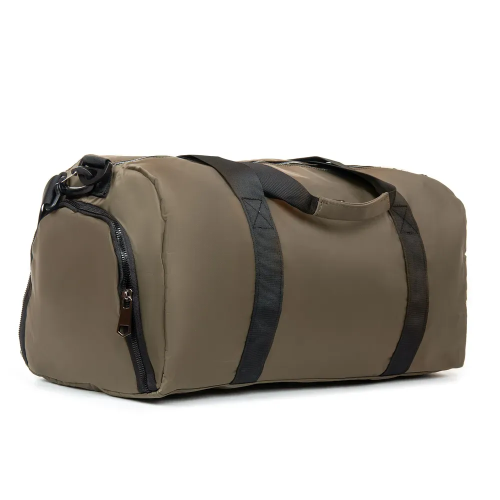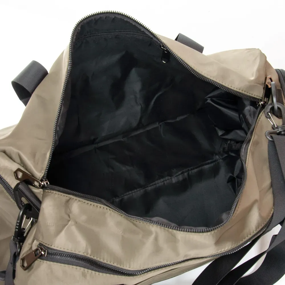 Одно основное отделение, закрывается на молнию. Внутри отделения есть боковой карман на молнии. Дополнительное отделение с герметичной подкладкой предназначено для влажных вещей. На торцах сумки расположены карманы на молнии, один из них предназначен для обуви. На обратной стороне сумки есть крепление на ручку чемодана и карман на молнии.