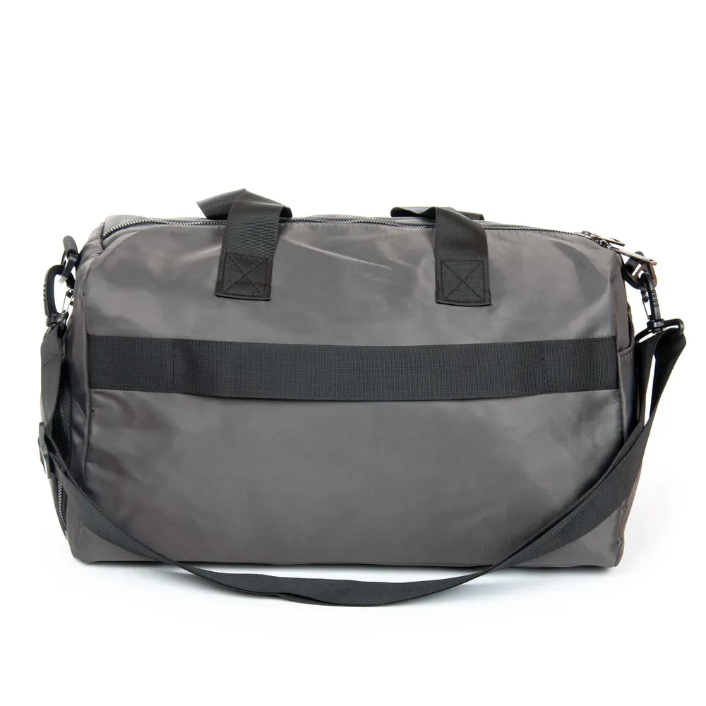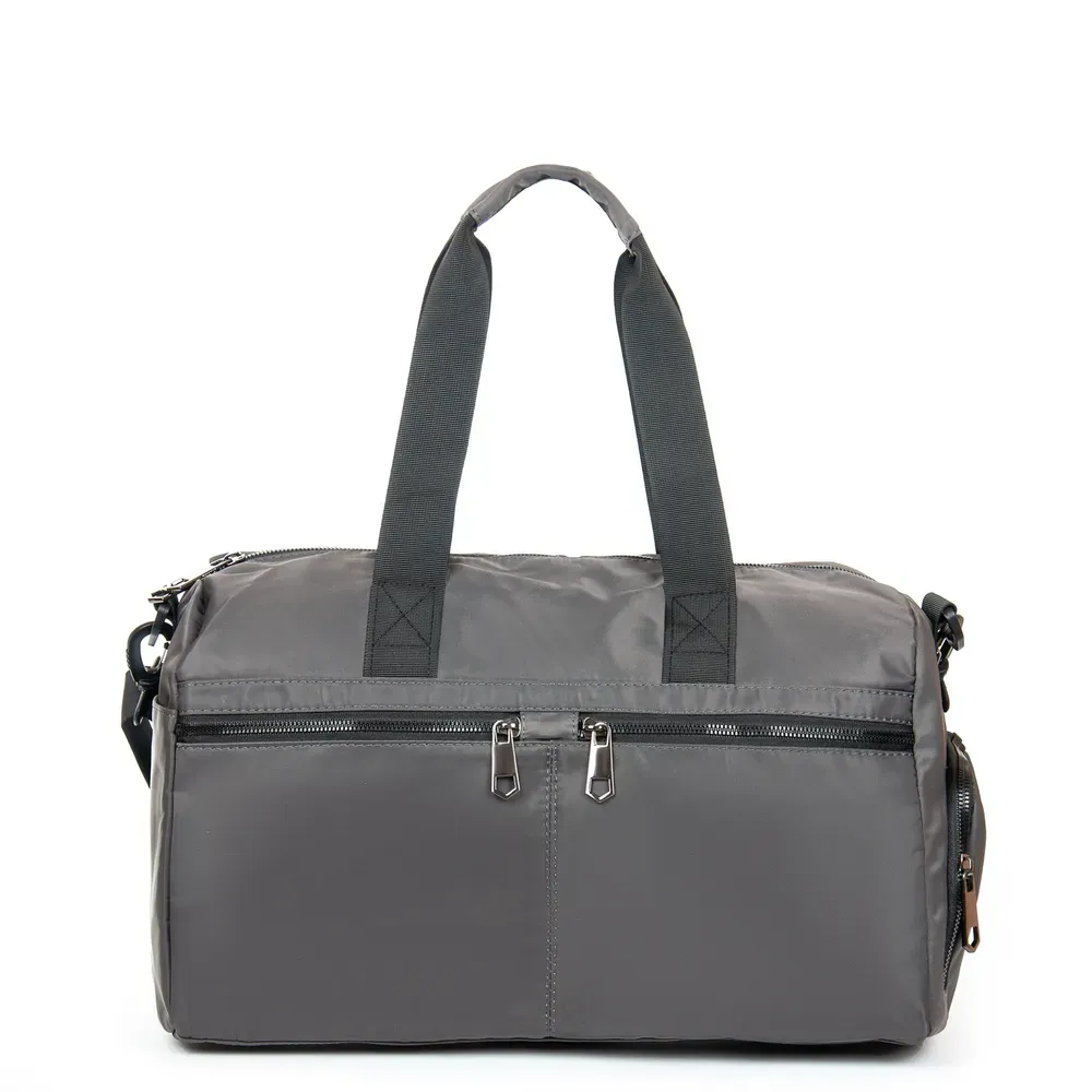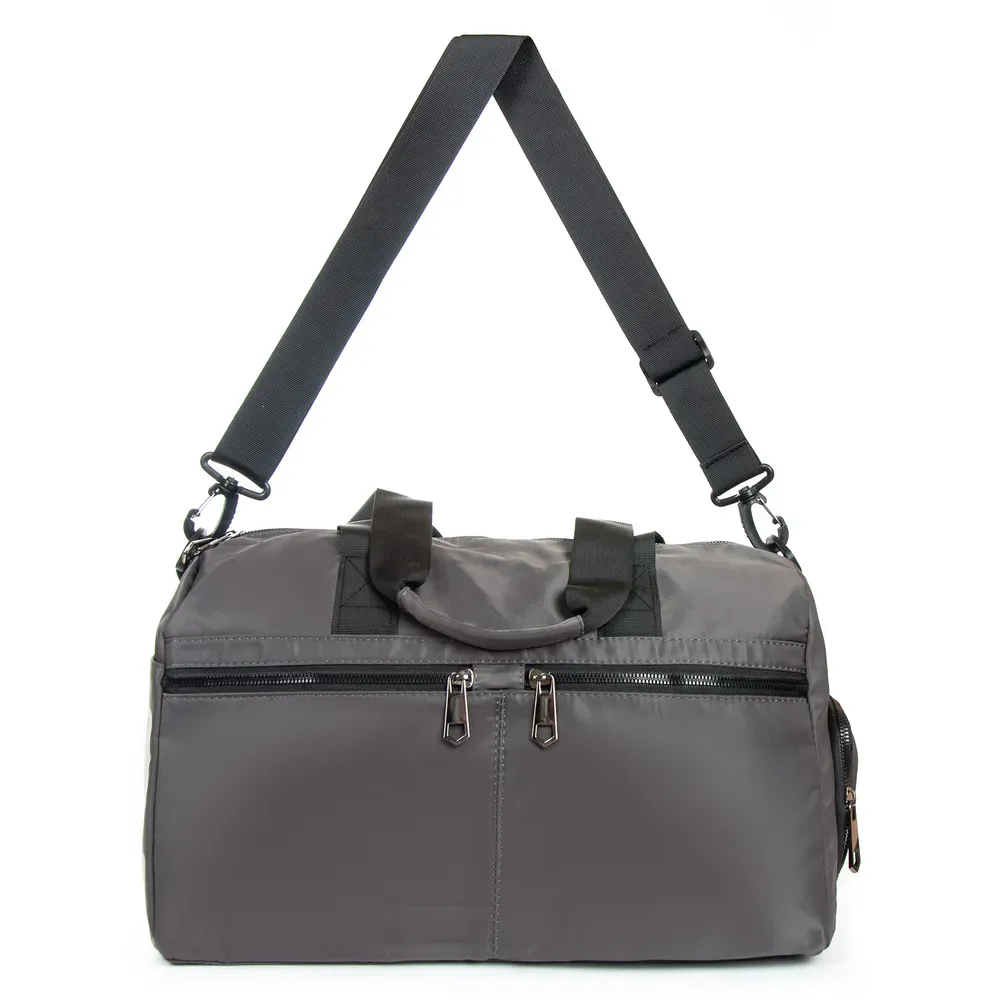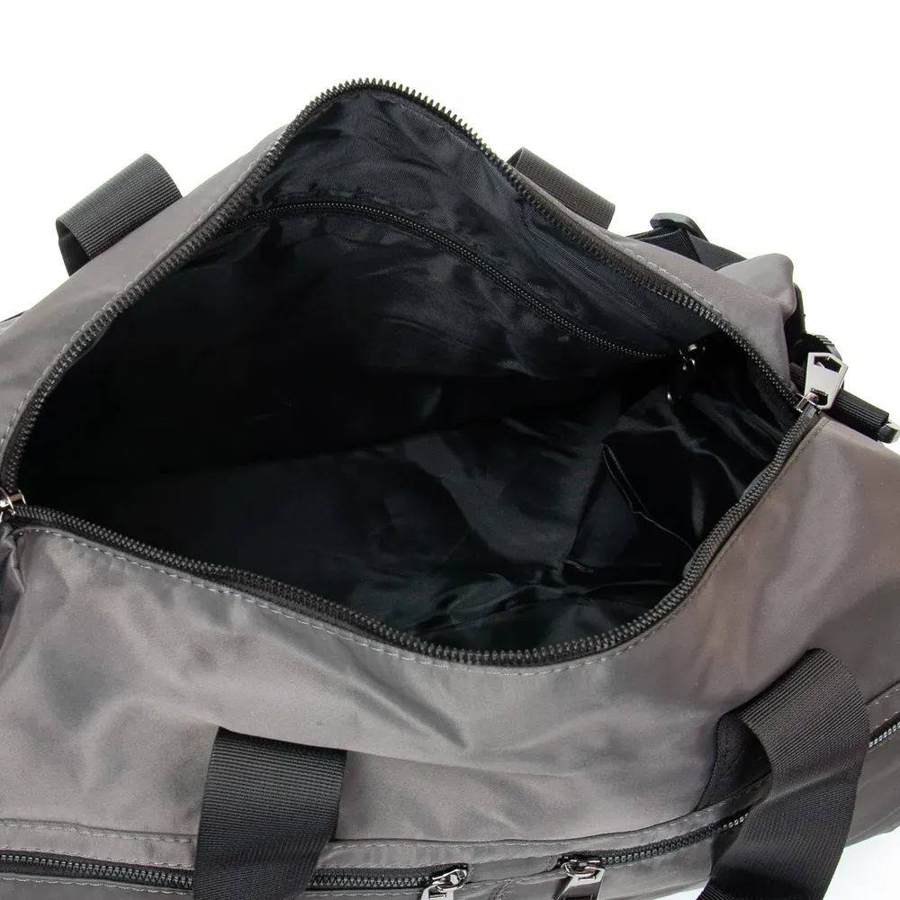 Одно основное отделение, закрывается на молнию. Внутри отделения есть боковой карман на молнии и открытый двойной карман. На торцах сумки расположены карманы: один на молнии для обуви и второй открытый плоский. На фасаде есть два вместительных кармана на молнии. На обратной стороне сумки есть крепление на ручку чемодана.