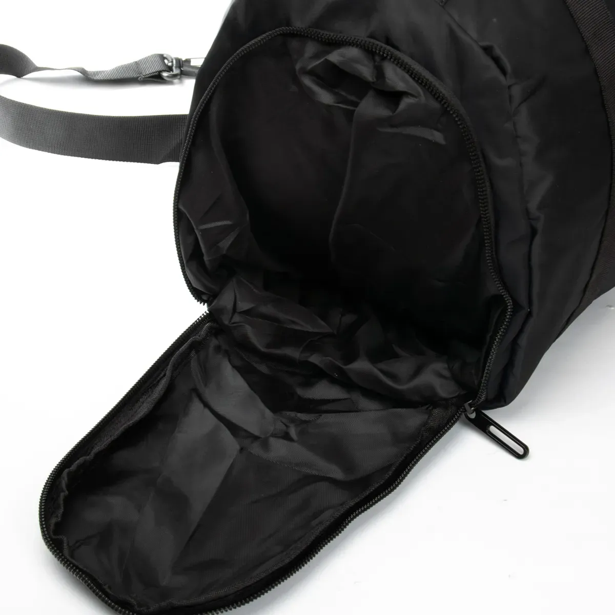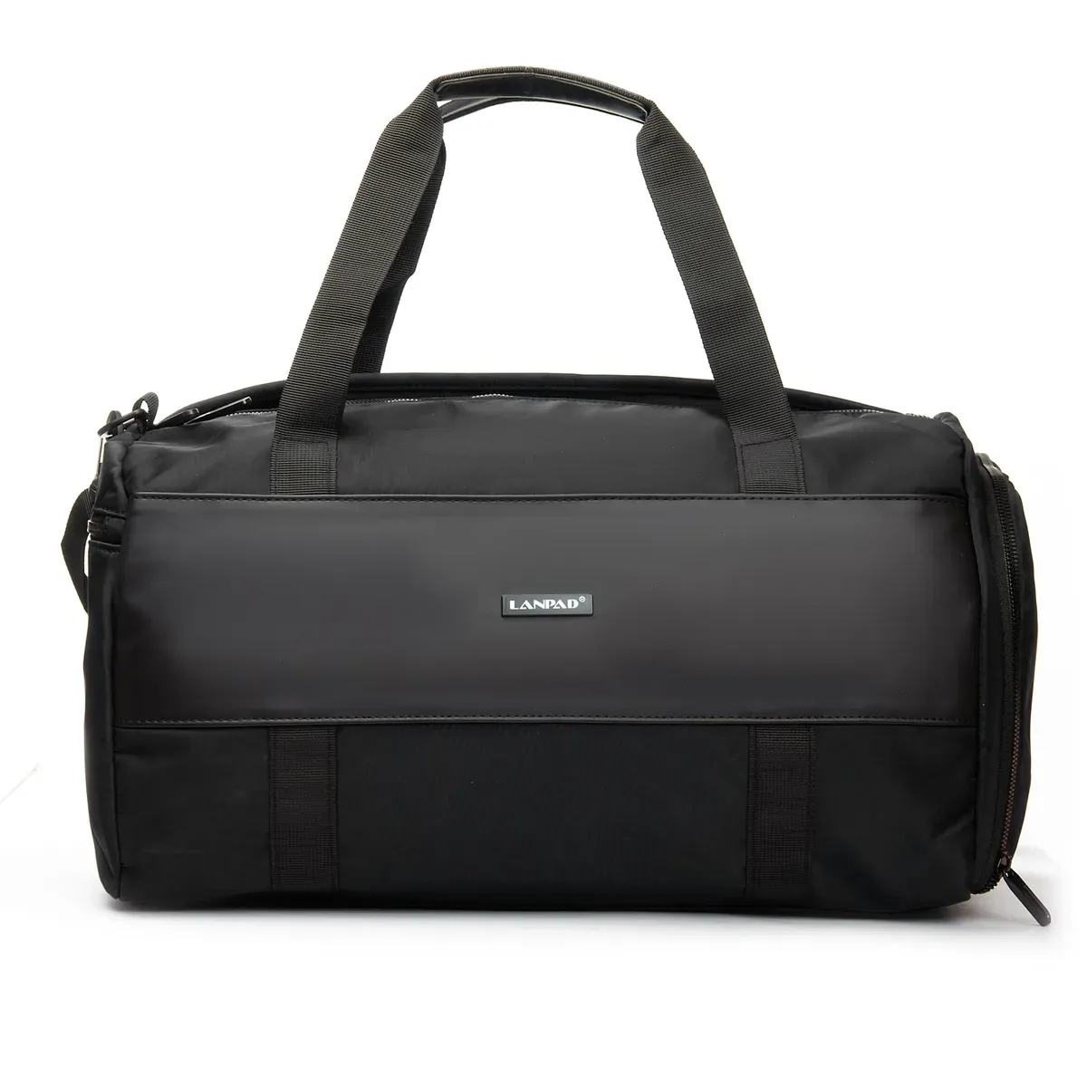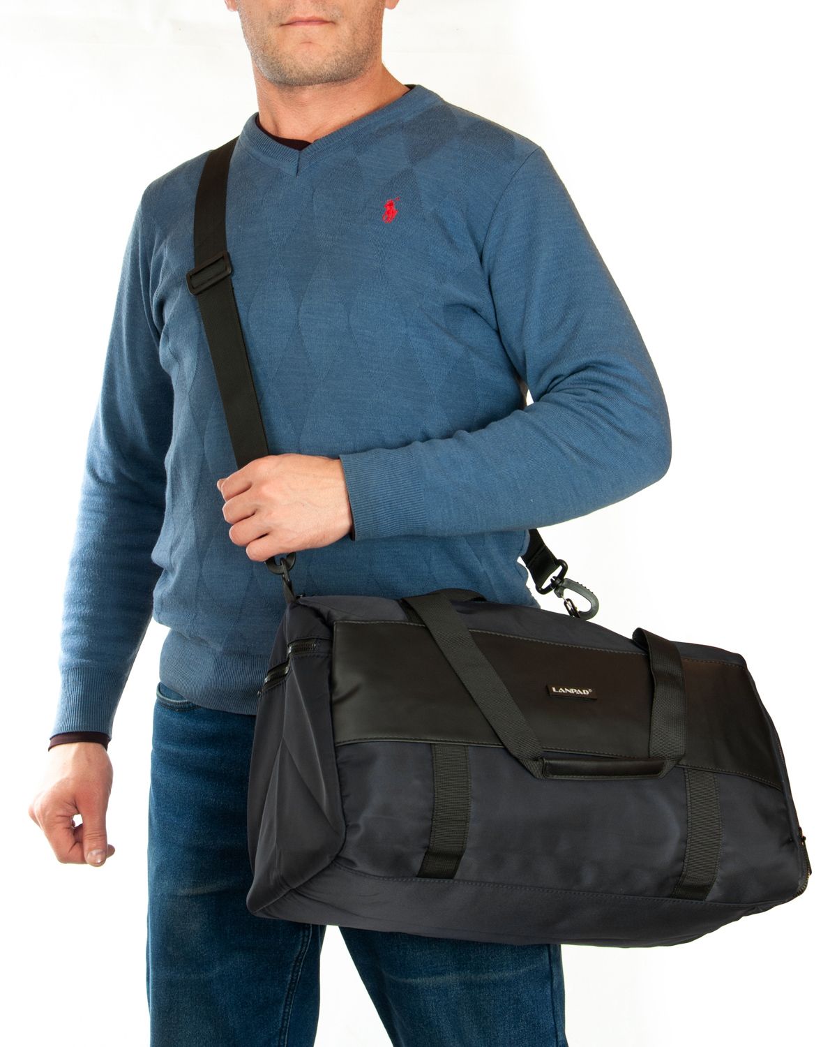 Мужская дорожная/спортивная сумка Lanpad. Одно отделение, закрывается на молнию. Внутри отделения есть карман на молнии и двойной открытый карман. На обратной стороне расположен большой карман на молнии с герметичной подкладкой. На торцах сумки находятся карман для обуви и карман на молнии для вещей.