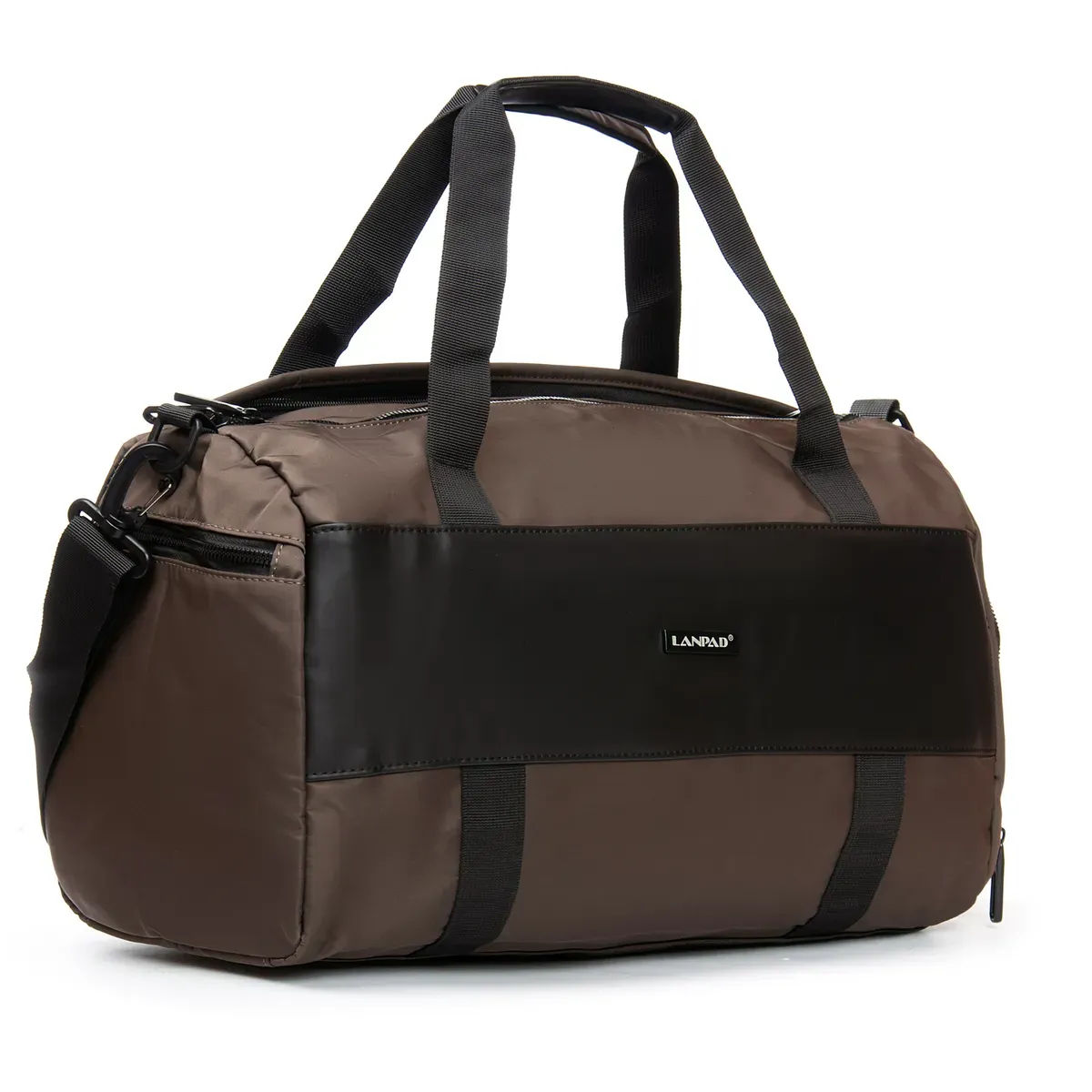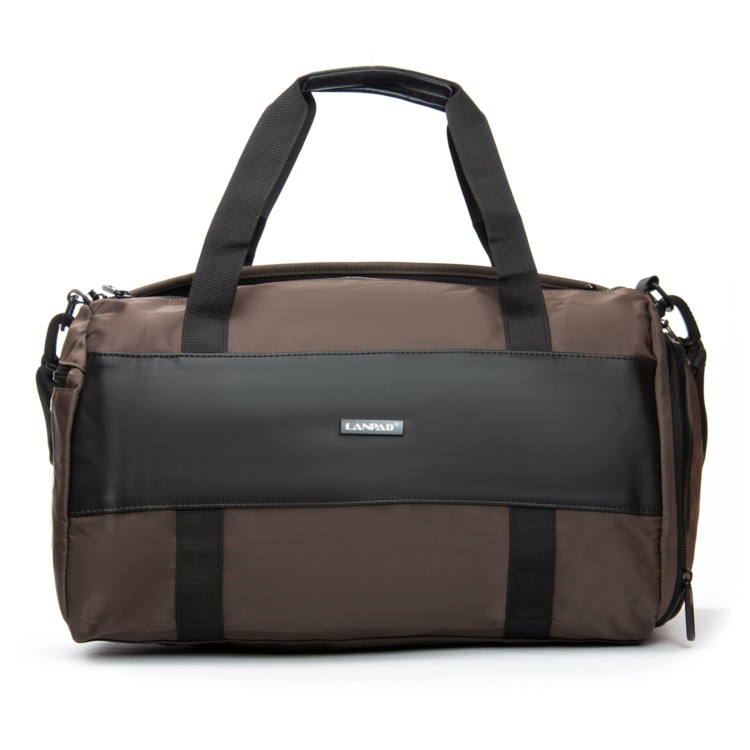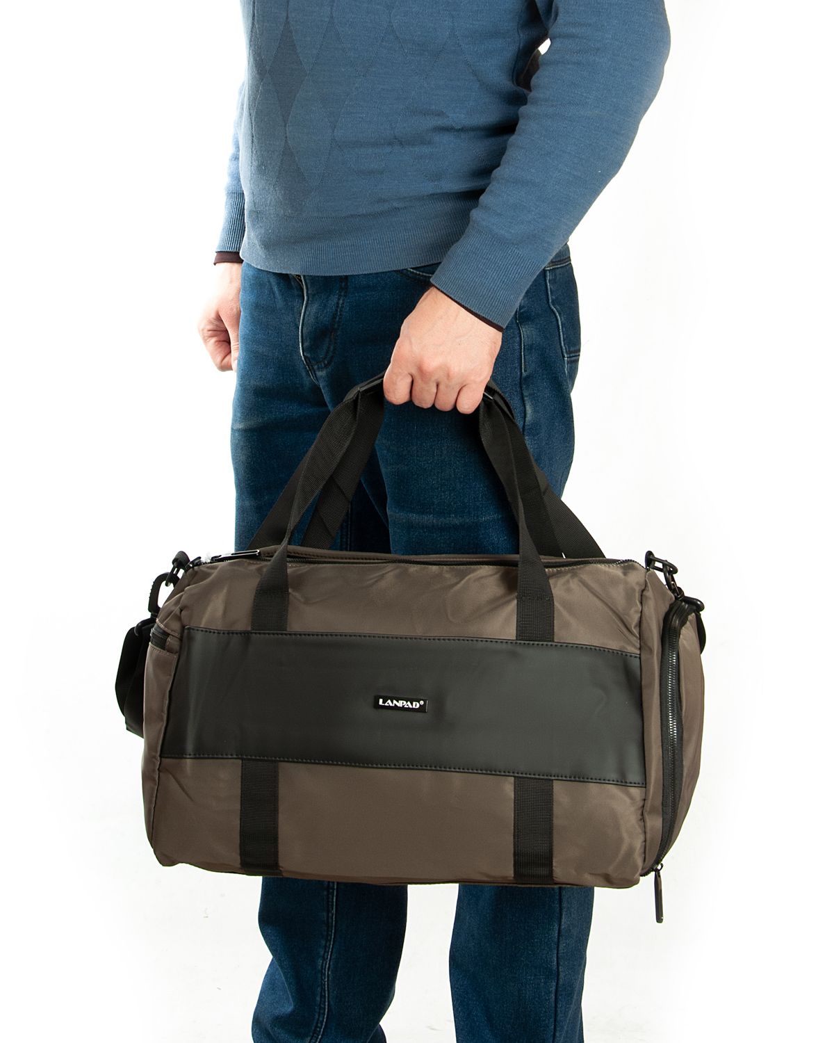 Мужская дорожная/спортивная сумка Lanpad. Одно отделение, закрывается на молнию. Внутри отделения есть карман на молнии и двойной открытый карман. На обратной стороне расположен большой карман на молнии с герметичной подкладкой. На торцах сумки находятся карман для обуви и карман на молнии для вещей.