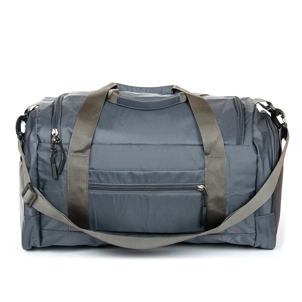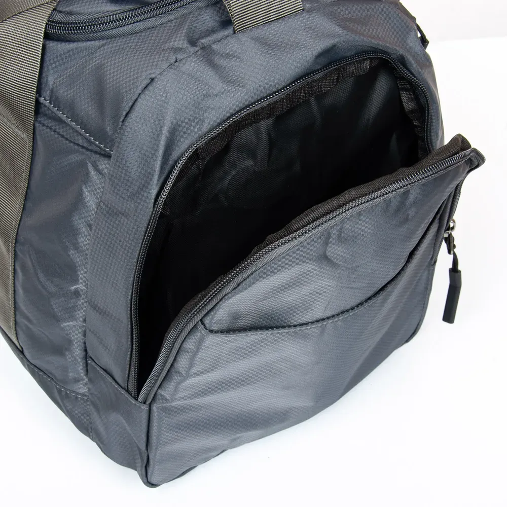 Одно отделение, закрывается на молнию. Внутри отделения есть боковой карман на молнии, открытый карман-сетка и еще один большой карман-сетка расположенный в верхней части и закрывающийся на молнию. На фасаде и обратной стороне находятся два вместительных кармана на молнии. На торцах сумки также расположены карманы на молнии, один из них предназначен для обуви. На торцах еще есть плоские открытые карманы. На обратной стороне есть крепление на ручку чемодана.