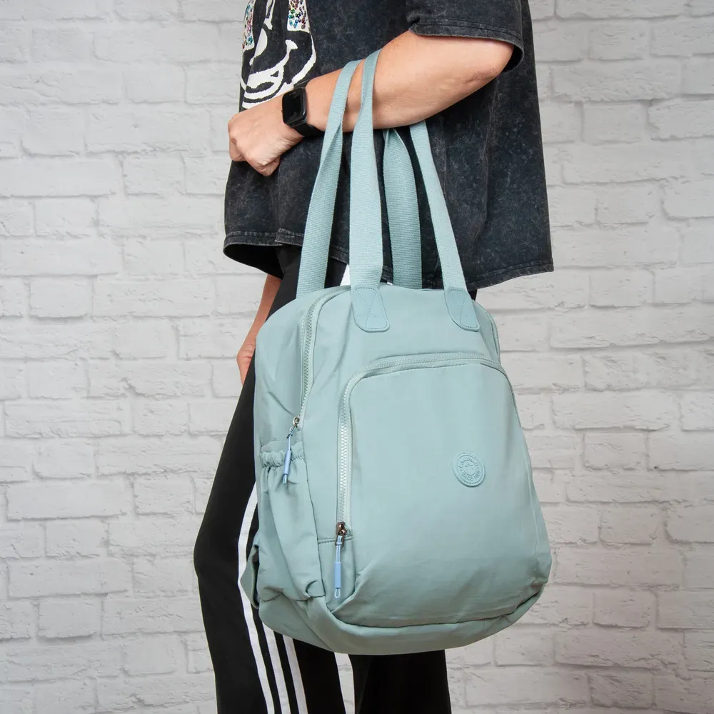 Можно носить как сумку за ручки, на плече или как рюкзак на спине.
