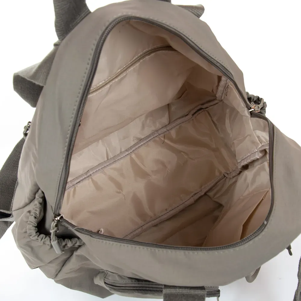 Одно отделение, закрывается на молнию. Внутри отделения есть большой карман на молнии и открытый карман. Снаружи сумки на торцах расположены два кармана для бутылок воды 0,5л. На фасаде и на обратной стороне находятся вместительные карманы на молнии. На фасаде также расположены два кармана для мелких вещей: один закрывается на молнию, а второй клапаном на магнитной кнопке.