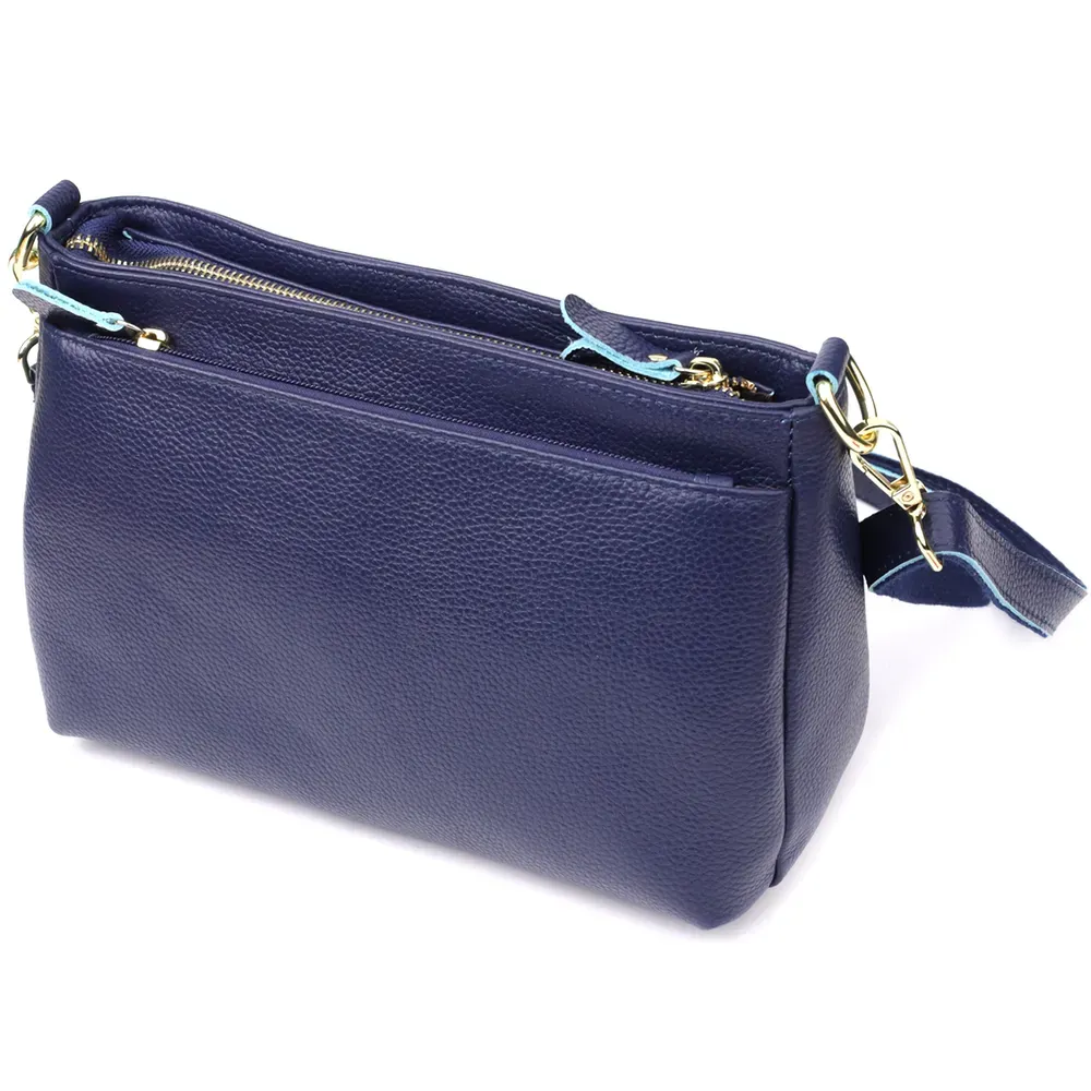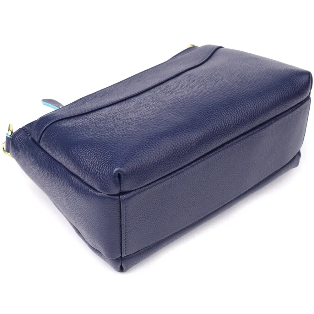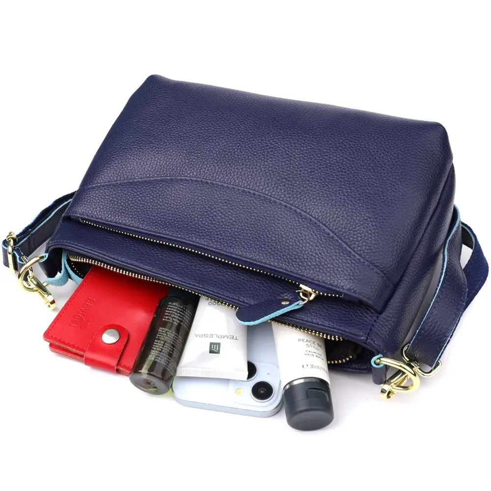Ця синя шкіряна сумка з формостійким дном — чудовий вибір для сучасної жінки, яка цінує поєднання якості, дизайну та зручності.