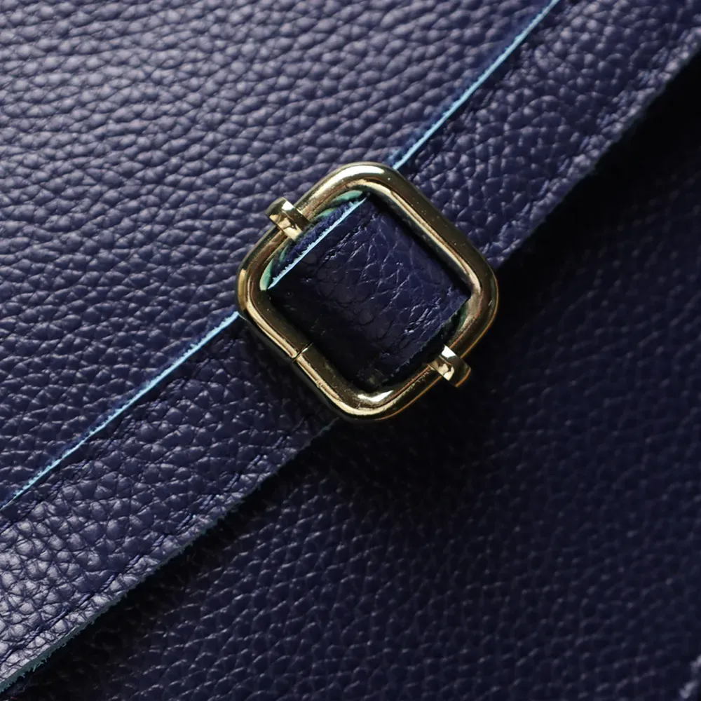 Фурнітура виконана в кольорі жовтого золота, яка створює витончений контраст із насиченим синім кольором шкіри, додаючи моделі шляхетності та стилю.