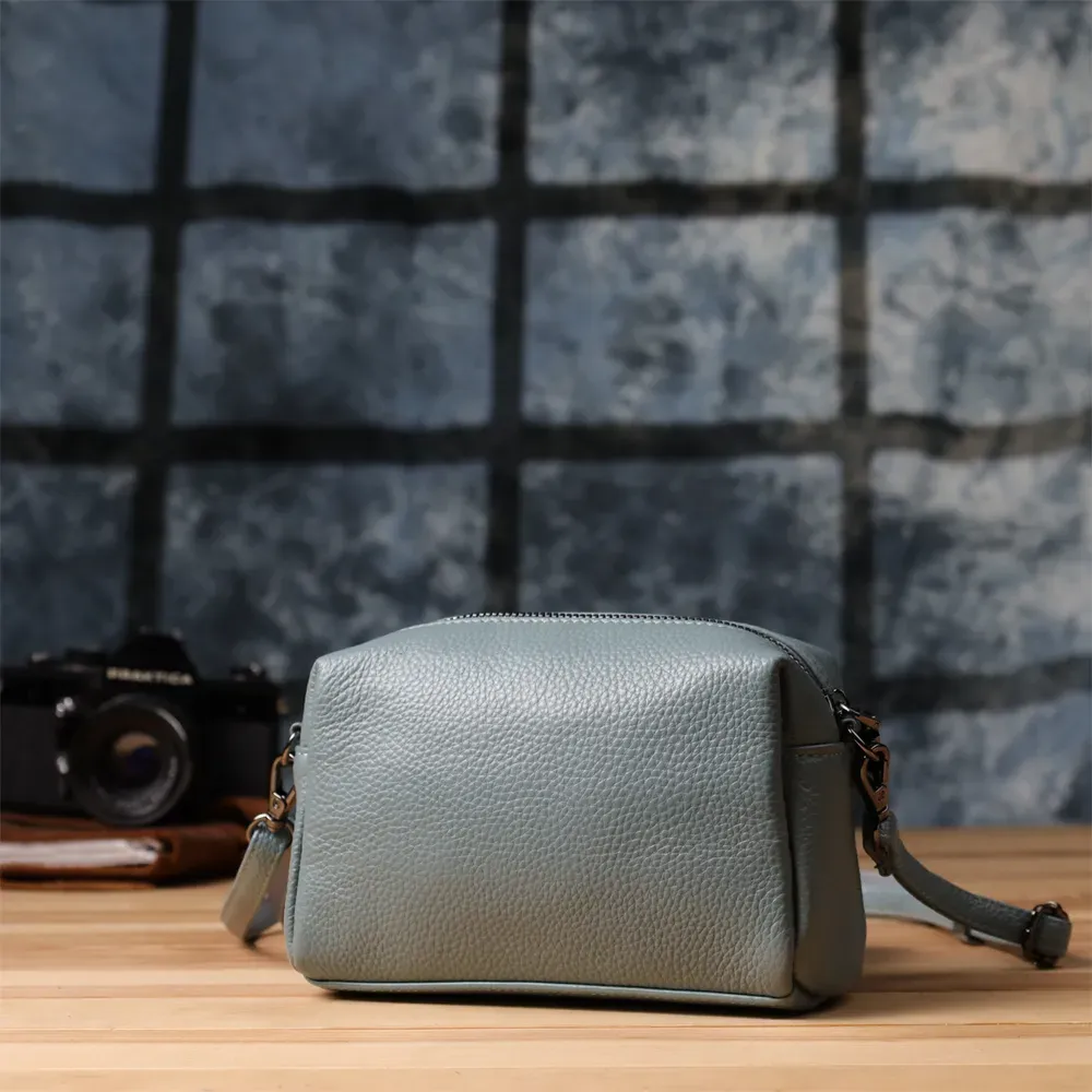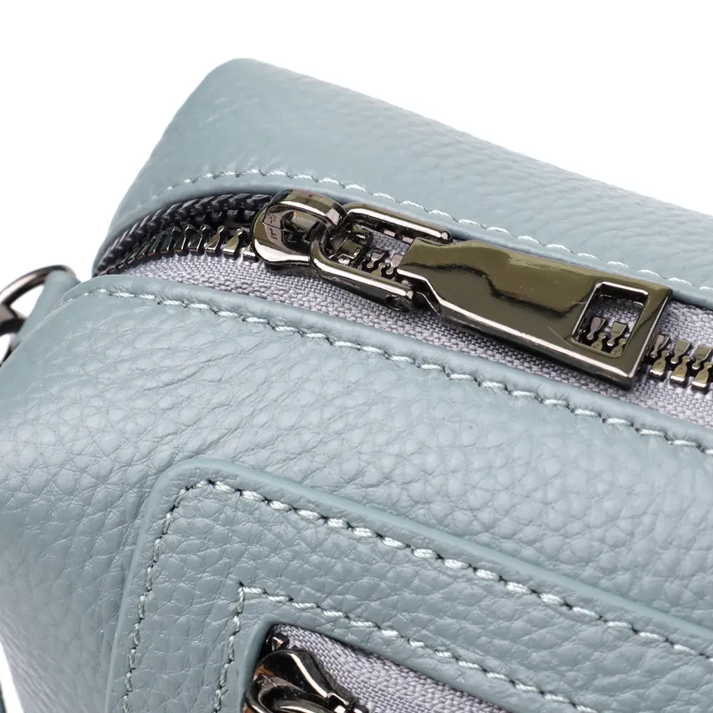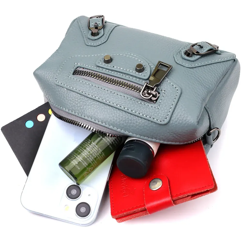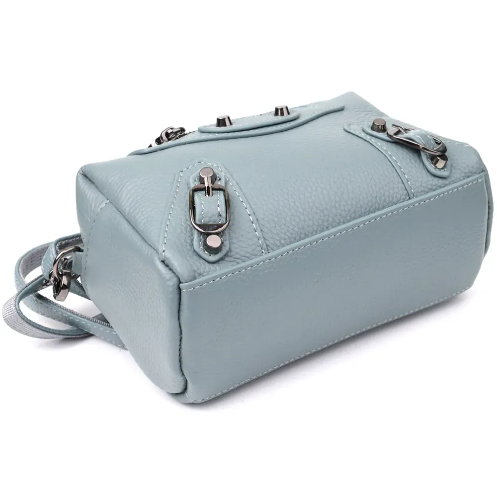 Невелика жіноча шкіряна сумка у блакитному кольорі з декоративною фурнітурою – свіжий акцент із характером. Ця компактна модель виконана з натуральної шкіри в ніжному блакитному відтінку, який надає образу легкість та витонченість. Основна увага в дизайні приділена декоративним деталям: металеві заклепки, ремінці та фігурний рядок на лицьовій стороні додають стилю динаміки та оригінальності.