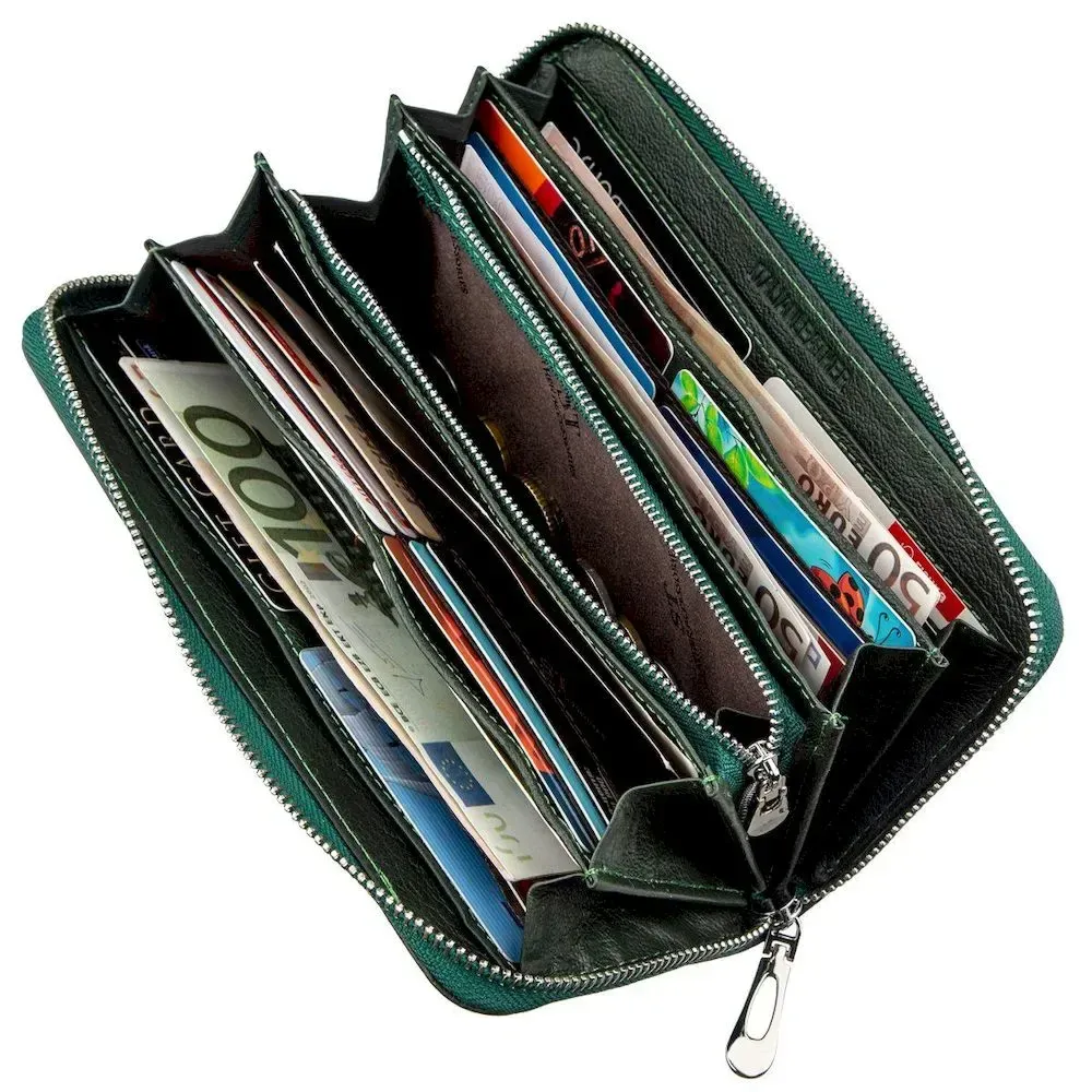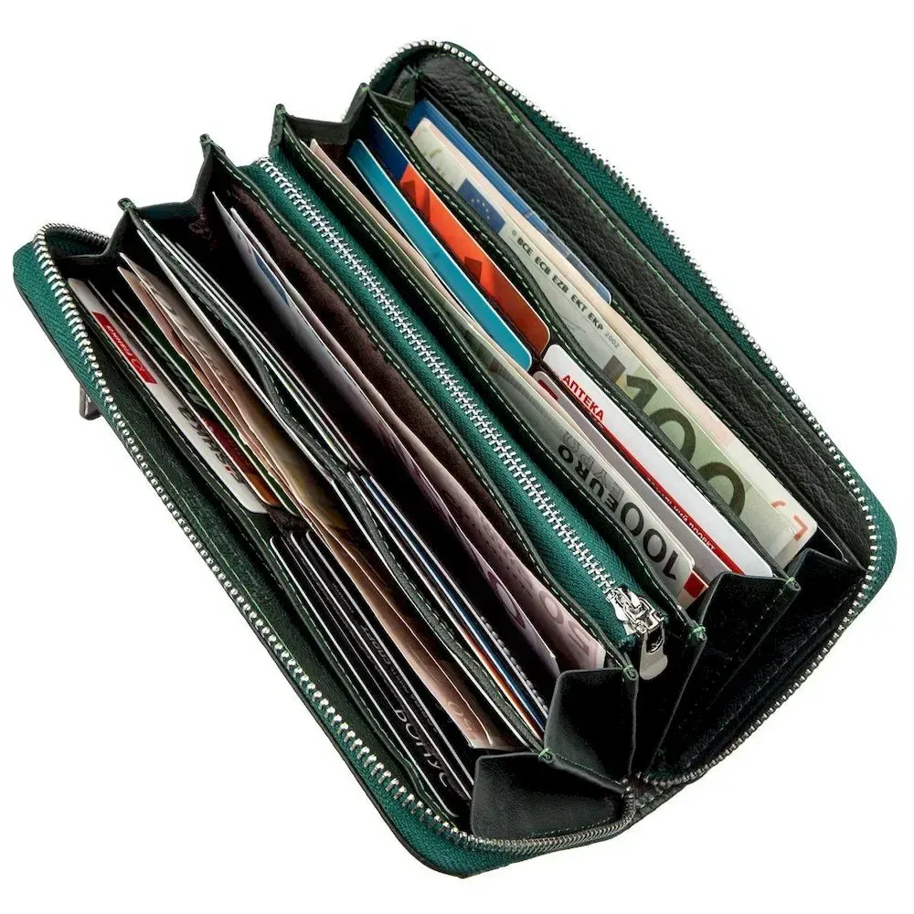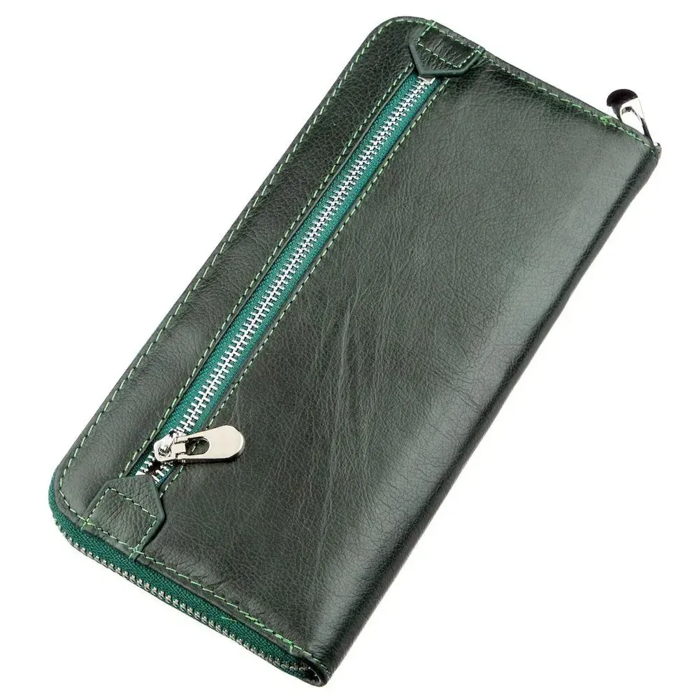 Елегантний жіночий гаманець-клатч, зроблений з натуральної шкіри з м'якою зернистою фактурою. Клатч має неординарний зелений колір, що дуже виграшно виглядає на тлі інших гаманців. З ним Ви завжди виділятиметеся з загального натовпу посередностей. Цей аксесуар є дуже функціональним і має достатню кількість необхідних відділень для купюр та інших цінностей. Ну, а якщо Вам набридло вічно шукати ту чи іншу картку чи візитку серед купи інших, то в даному клатчі Ви зможете красиво розкласти їх по спеціальних кишеньках, адже тут їх аж тридцять шість штук. Якщо спробувати охарактеризувати цей клатч одним словом, то це звичайно «міні-сумочка». Все найцінніше завжди буде з Вами! Запаковано цей виріб у щільну картонну коробку.