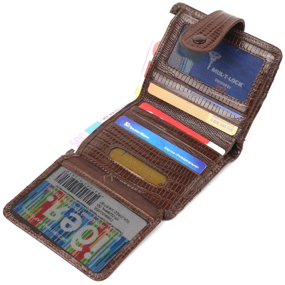 Надійний чоловічий гаманець-картхолдер з натуральної фактурної шкіри. Аксесуар має відділення для купюр, приховану кишеню та п'ятнадцять відсіків для карток, два з них під сіточкою. Закривається аксесуар у дві додавання хлястиком на кнопку. Якісний шкіряний аксесуар завжди вважався показником смаку та достатку, саме такі вироби представлені у нашому магазині, у нас кожен знайде щось для себе.