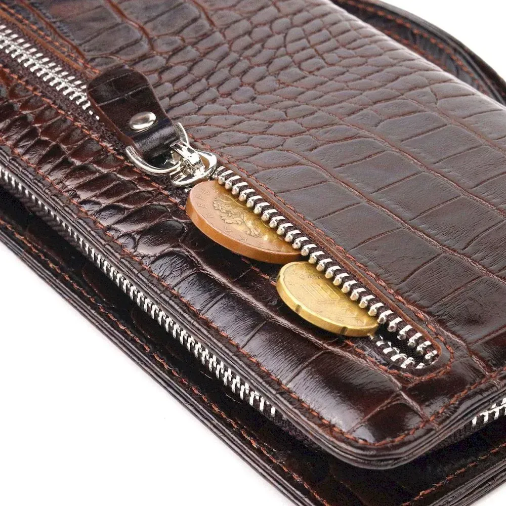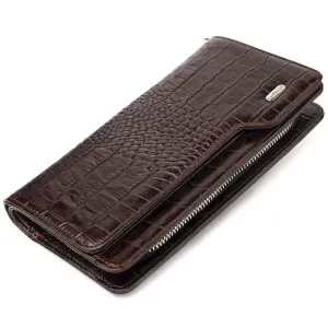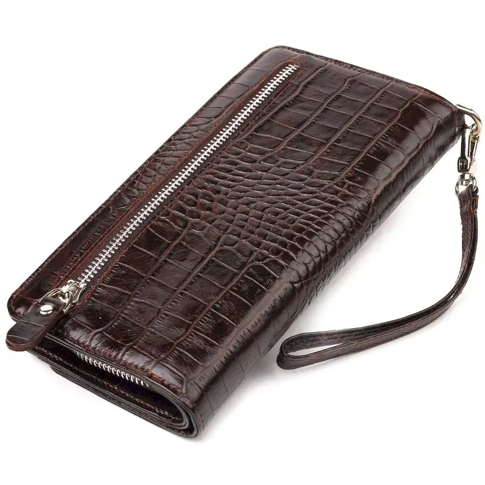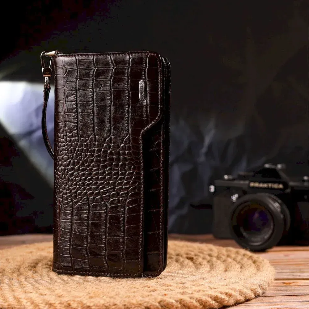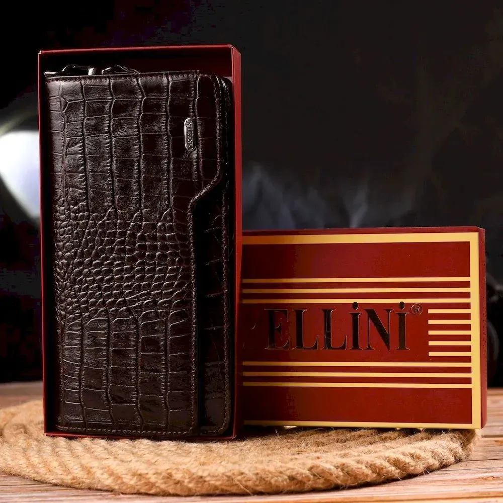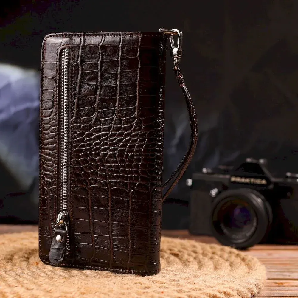 - гаманець упакований у фірмову коробочку. Стильний гаманець-клатч, з натуральної фактурної шкіри, з тисненням під крокодила. Аксесуар має одне основне відділення, в яке поміщаються купюри всіх номіналів, дванадцять кишень для карток, один з яких під сіточкою, блок для карт із зовнішнього боку, дві кишеньки на блискавці, знімний кистьовий ремінь. Закривається аксесуар на блискавку, а блок для карток закривається на кнопки. Колір фурнітури – срібло. Шкіряний гаманець є дивовижним подарунком на всі випадки життя.