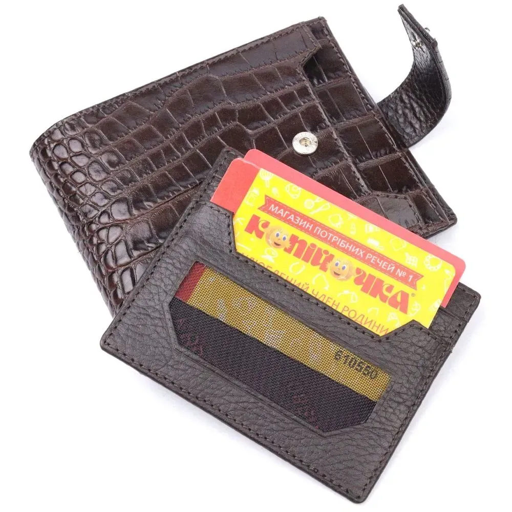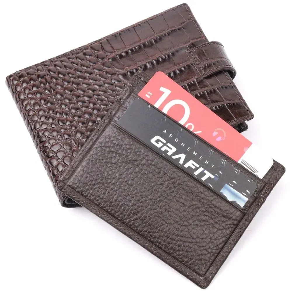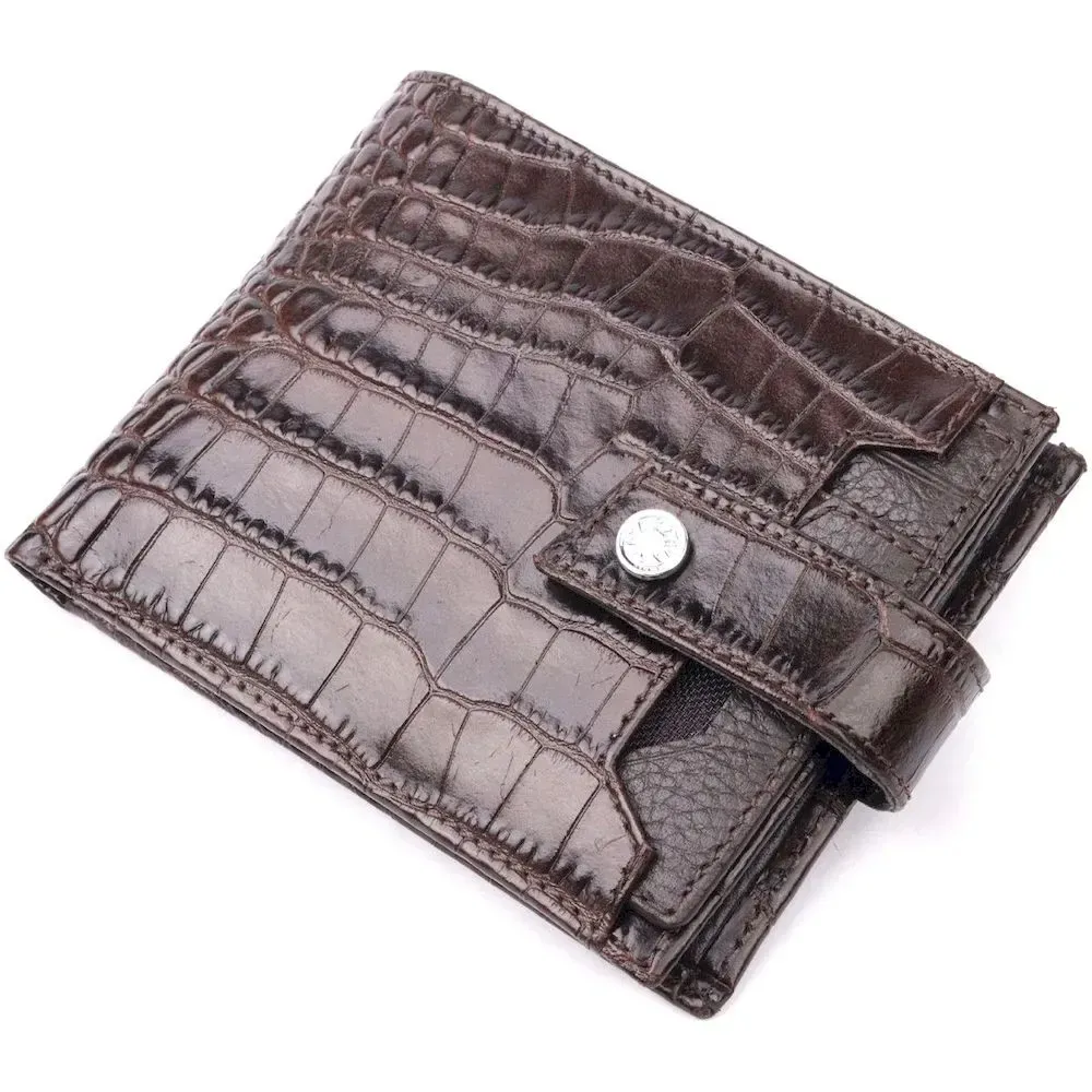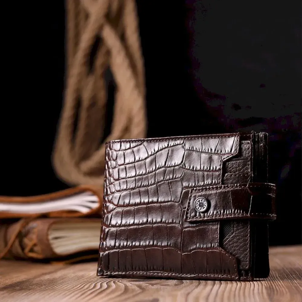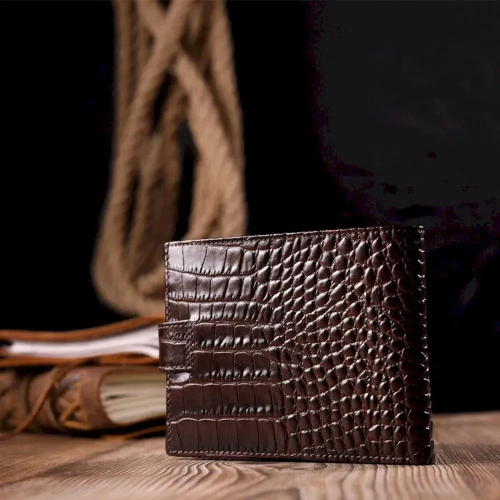 Гарний чоловічий гаманець з натуральної шкіри, в класичному коричневому кольорі. Портмоне пошито з комбінації двох видів шкіри: фактурної шкіри під крокодила – зовні та зернистої шкіри – усередині. Із зовнішнього боку знаходиться кишеня з блоком під картки та документи. Закривається гаманець хлястиком із кнопкою. Має стандартний горизонтальний формат, поміщається в кишеню. Вироби з натуральної шкіри завжди будуть чудовим подарунком для близької людини.