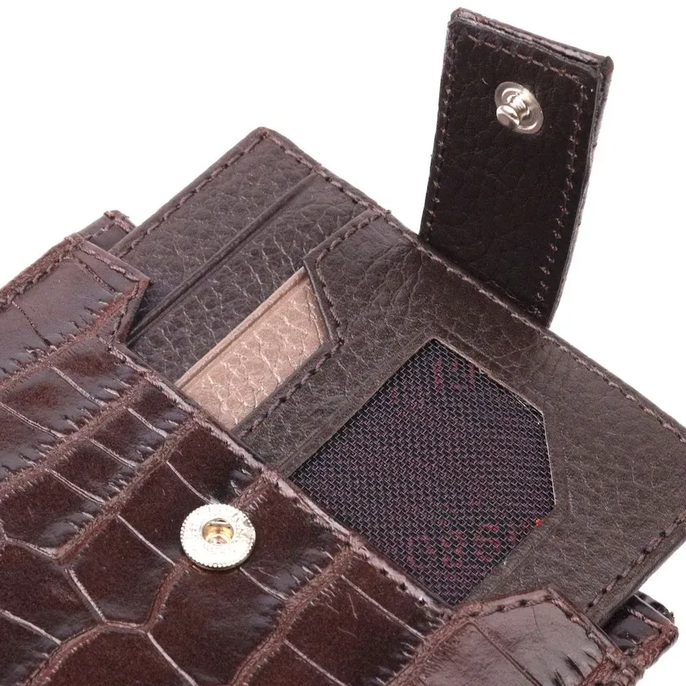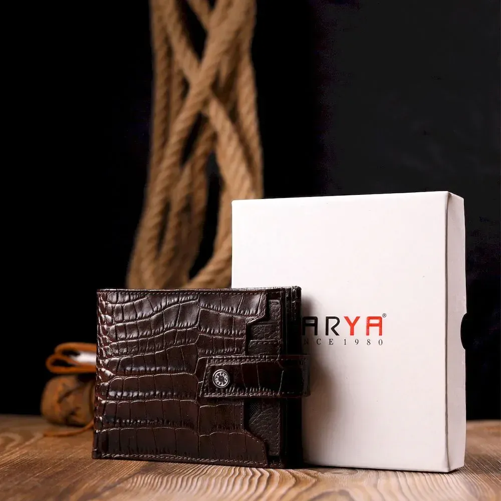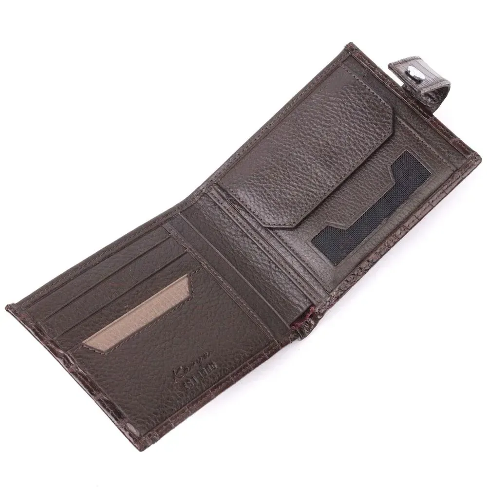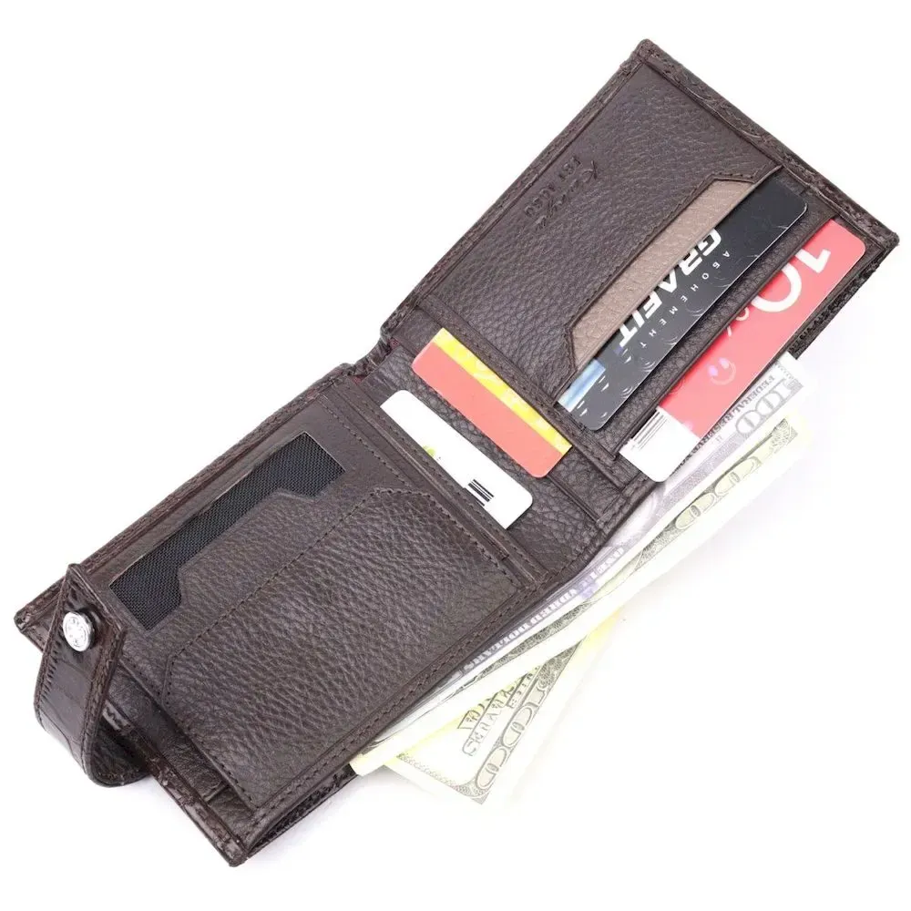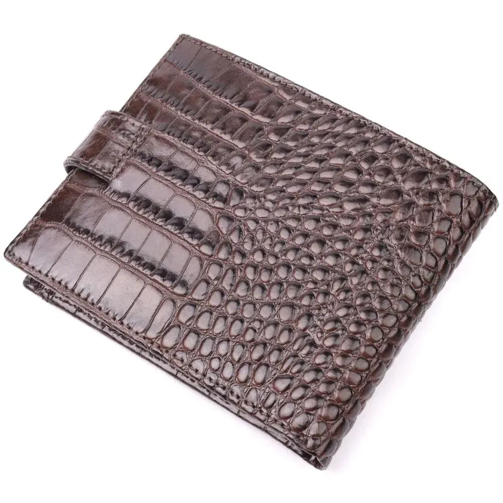 Гарний чоловічий гаманець з натуральної шкіри, в класичному коричневому кольорі. Портмоне пошито з комбінації двох видів шкіри: фактурної шкіри під крокодила – зовні та зернистої шкіри – усередині. Із зовнішнього боку знаходиться кишеня з блоком під картки та документи. Закривається гаманець хлястиком із кнопкою. Має стандартний горизонтальний формат, поміщається в кишеню. Вироби з натуральної шкіри завжди будуть чудовим подарунком для близької людини.