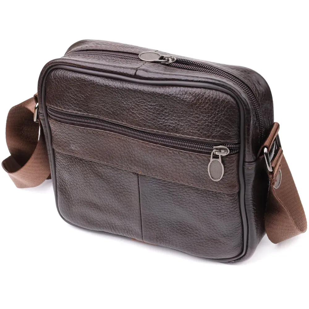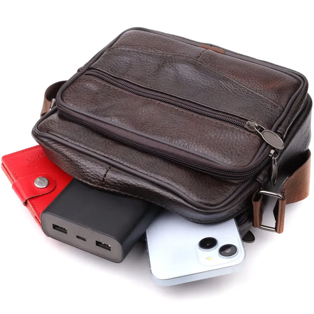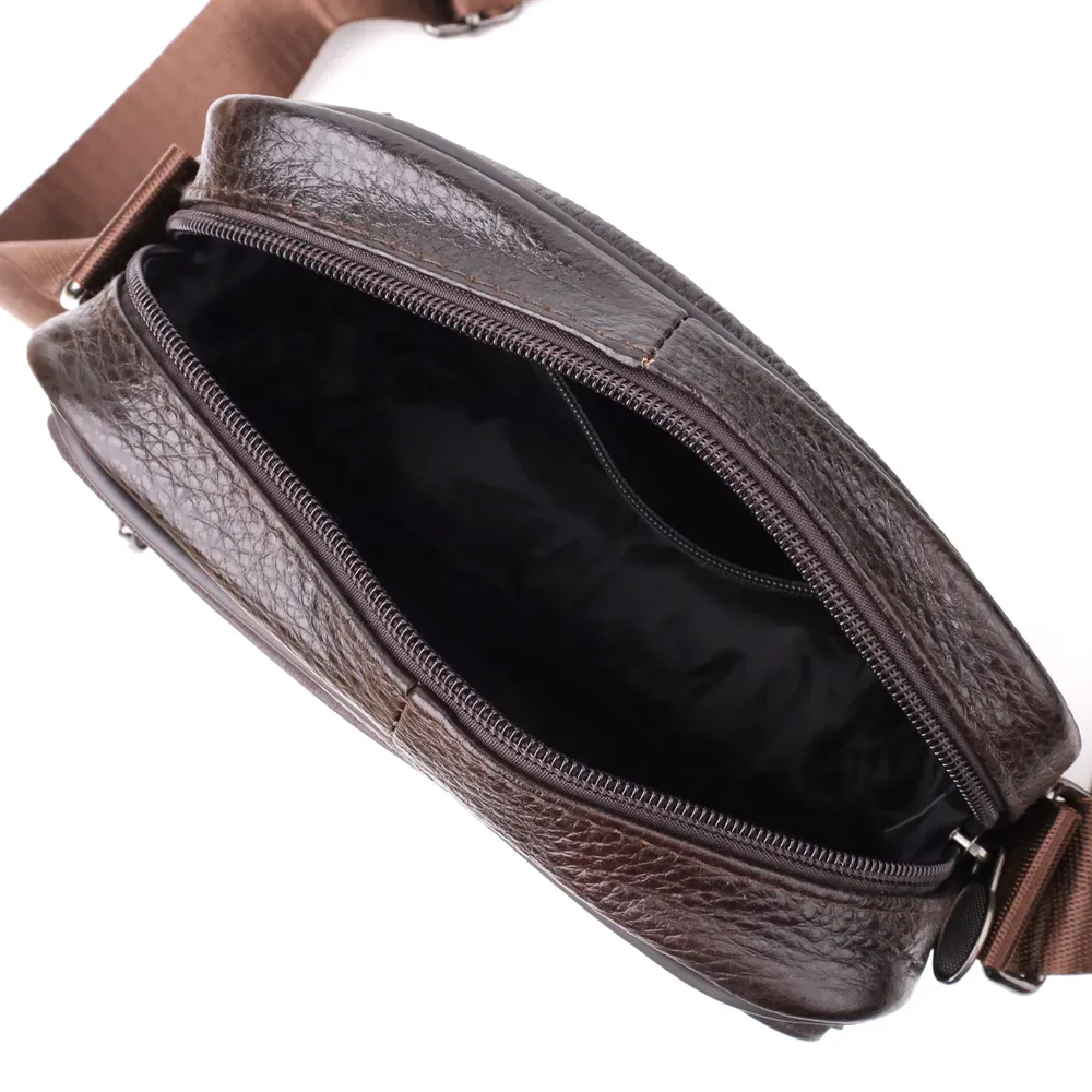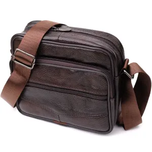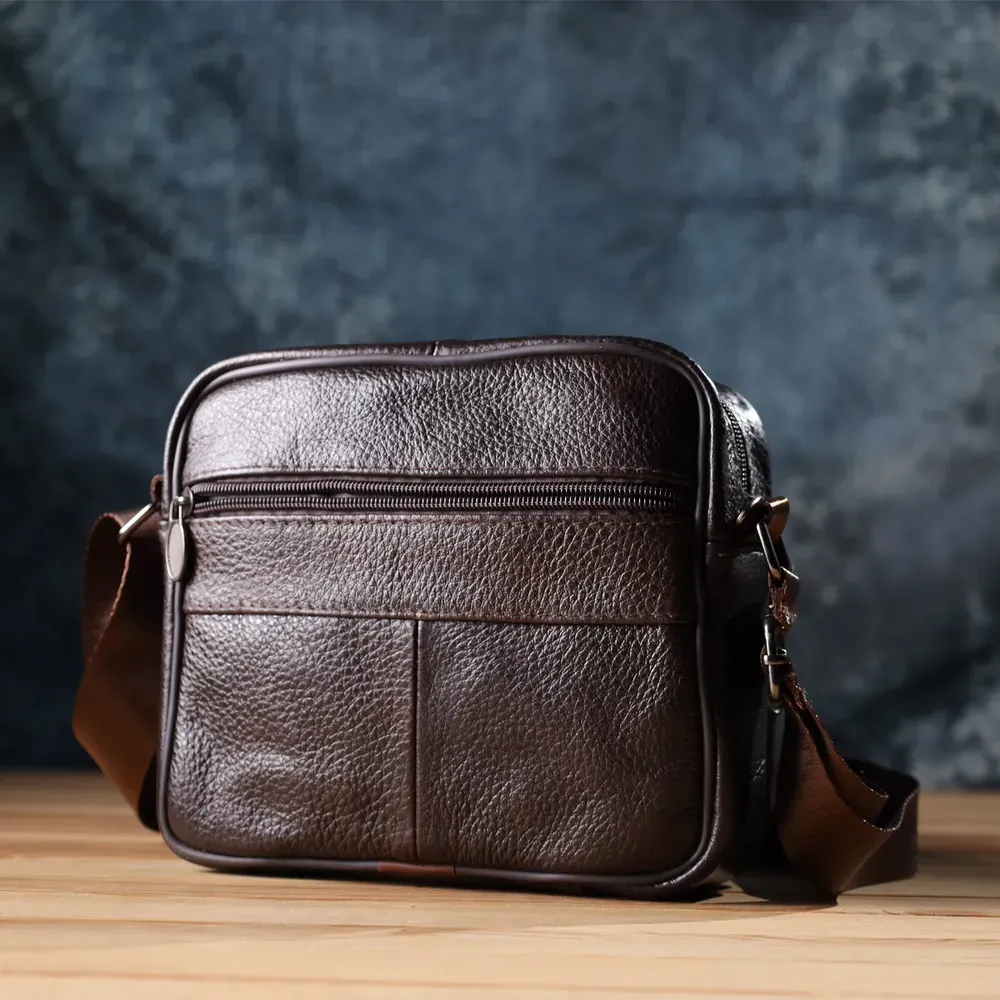 Стильна чоловіча сумка з високоякісної натуральної шкіри, стійка до пошкоджень та зношування. Ефектний та практичний аксесуар з одним основним відділенням та трьома додатковими кишенями для зберігання аксесуарів, телефону та інших дрібниць. Ремінь сумки виконаний із міцного текстилю та регулюється по довжині, що забезпечує зручність при носінні. Благородний коричневий колір моделі робить її універсальною та ідеально придатною як для повсякденного використання, так і для ділових зустрічей. Ця сумка стане чудовим вибором для чоловіка, що цінує комфорт та стиль у кожній деталі.
