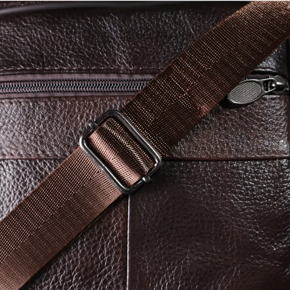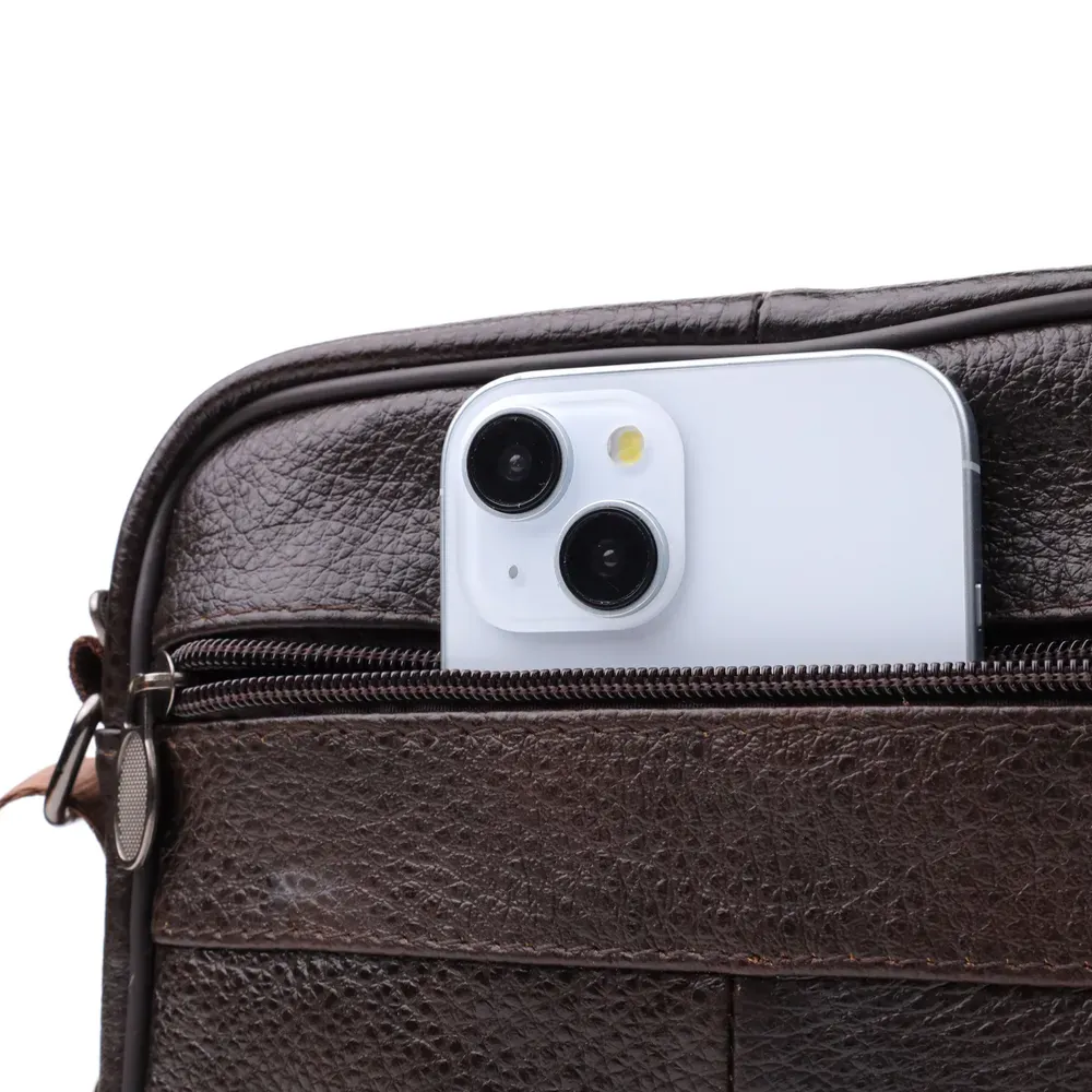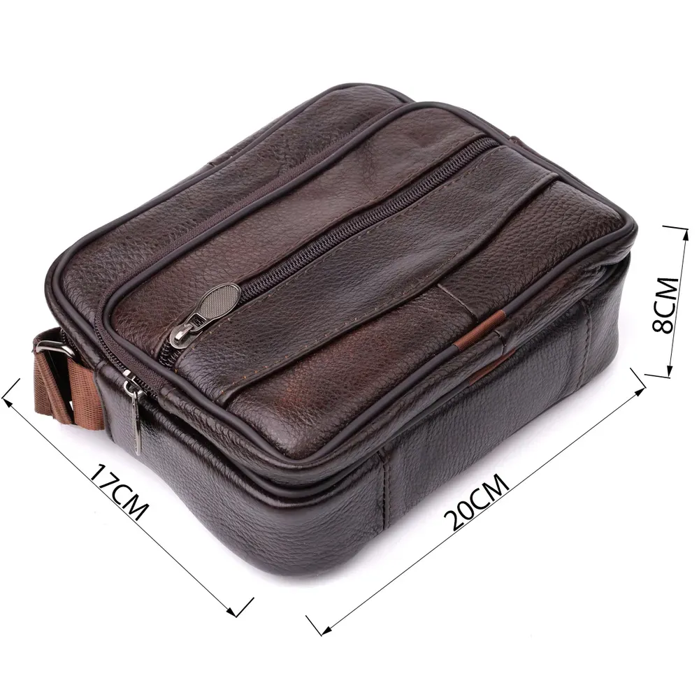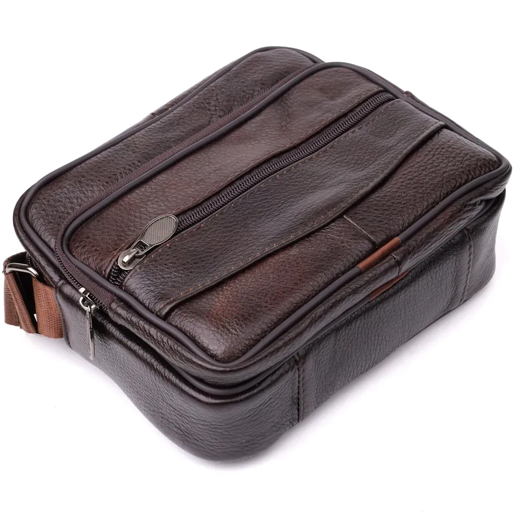 Стильна чоловіча сумка з високоякісної натуральної шкіри, стійка до пошкоджень та зношування. Ефектний та практичний аксесуар з одним основним відділенням та трьома додатковими кишенями для зберігання аксесуарів, телефону та інших дрібниць. Ремінь сумки виконаний із міцного текстилю та регулюється по довжині, що забезпечує зручність при носінні. Благородний коричневий колір моделі робить її універсальною та ідеально придатною як для повсякденного використання, так і для ділових зустрічей. Ця сумка стане чудовим вибором для чоловіка, що цінує комфорт та стиль у кожній деталі.