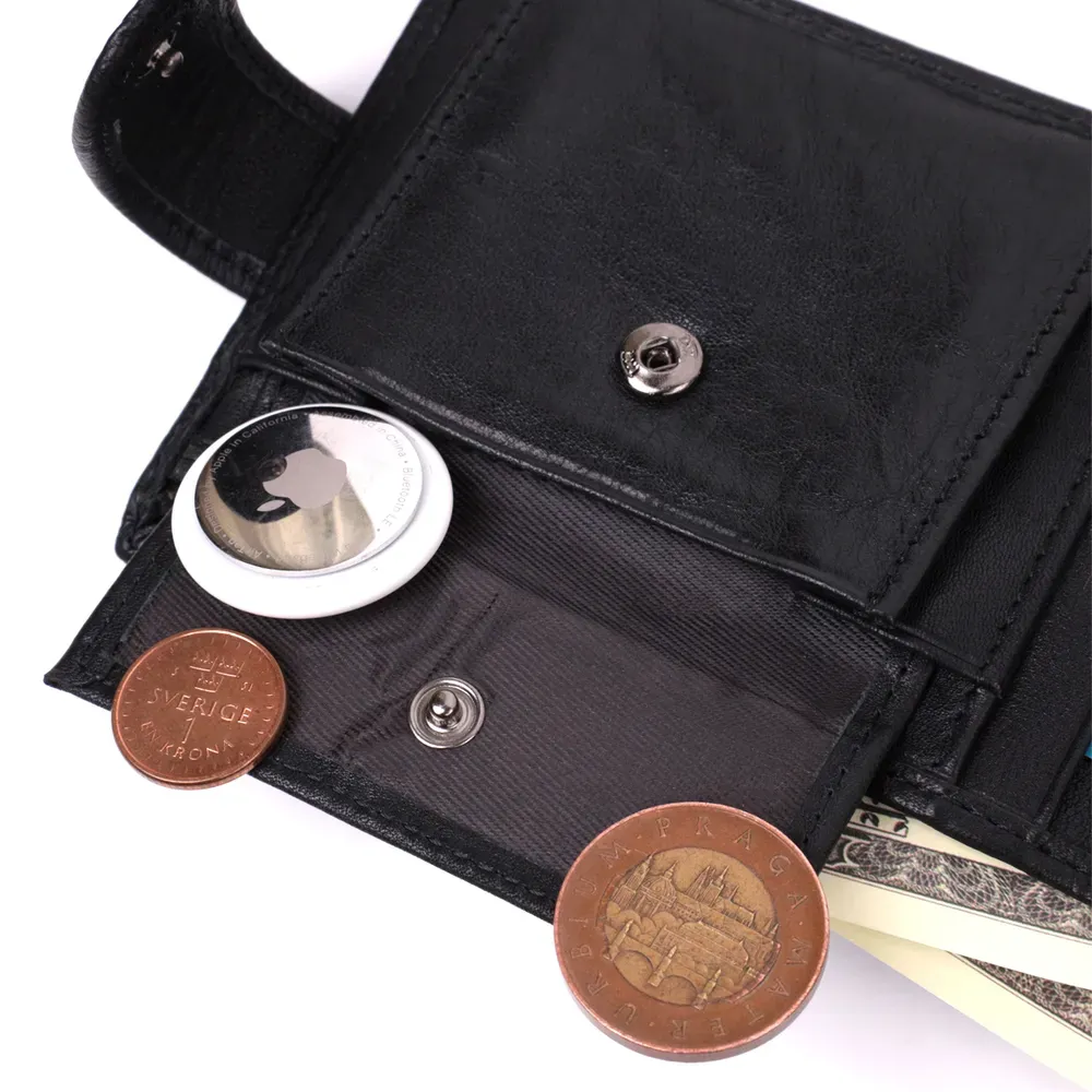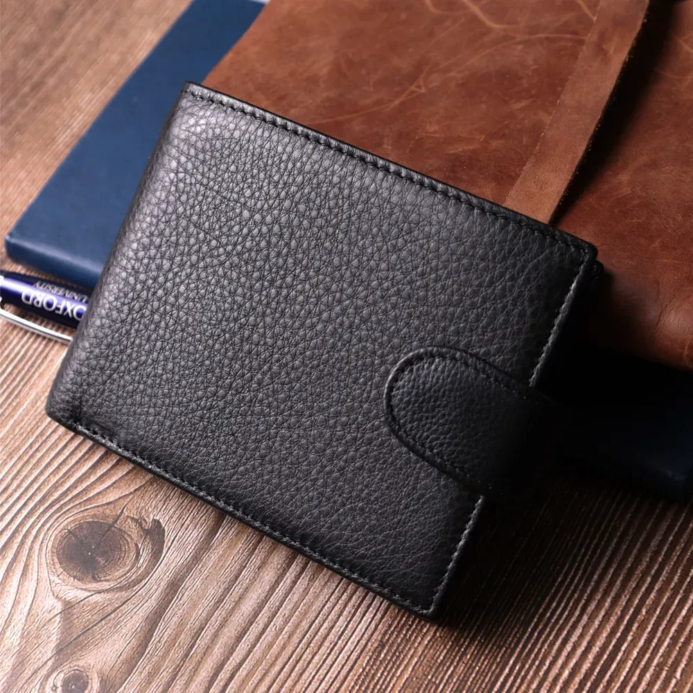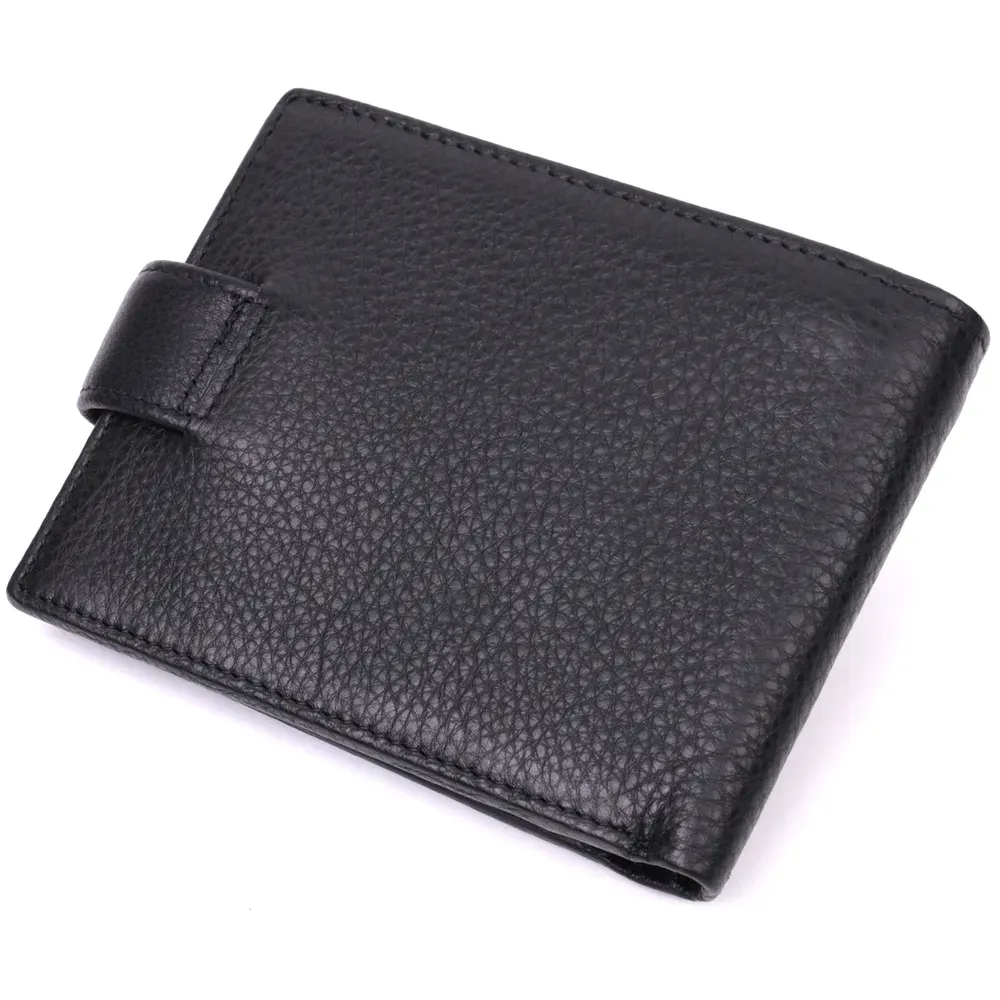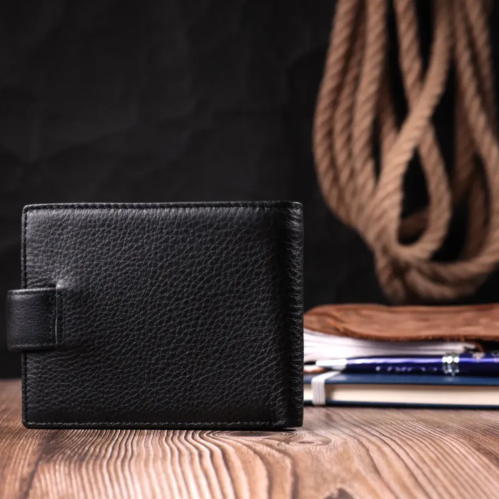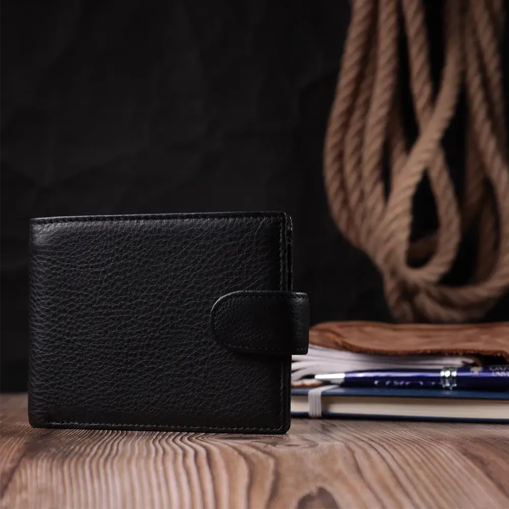 - чоловічий гаманець із натуральної шкіри, що закривається хлястиком на кнопку;
