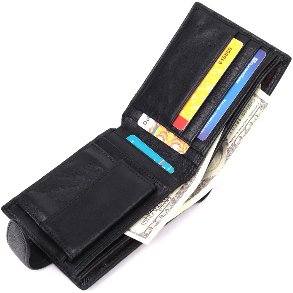 Зручний чоловічий гаманець чорного кольору великого розміру із натуральної шкіри. Це відмінний варіант, якщо Ви любите великі та практичні гаманці. Гаманець має різні відділення та багато кишень для візиток та кредиток. Відмінний варіант на подарунок, щоб порадувати рідних та близьких.