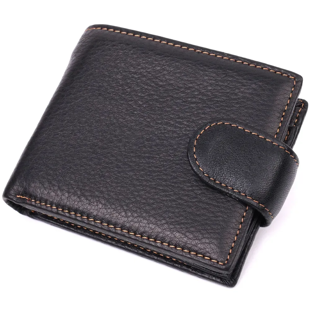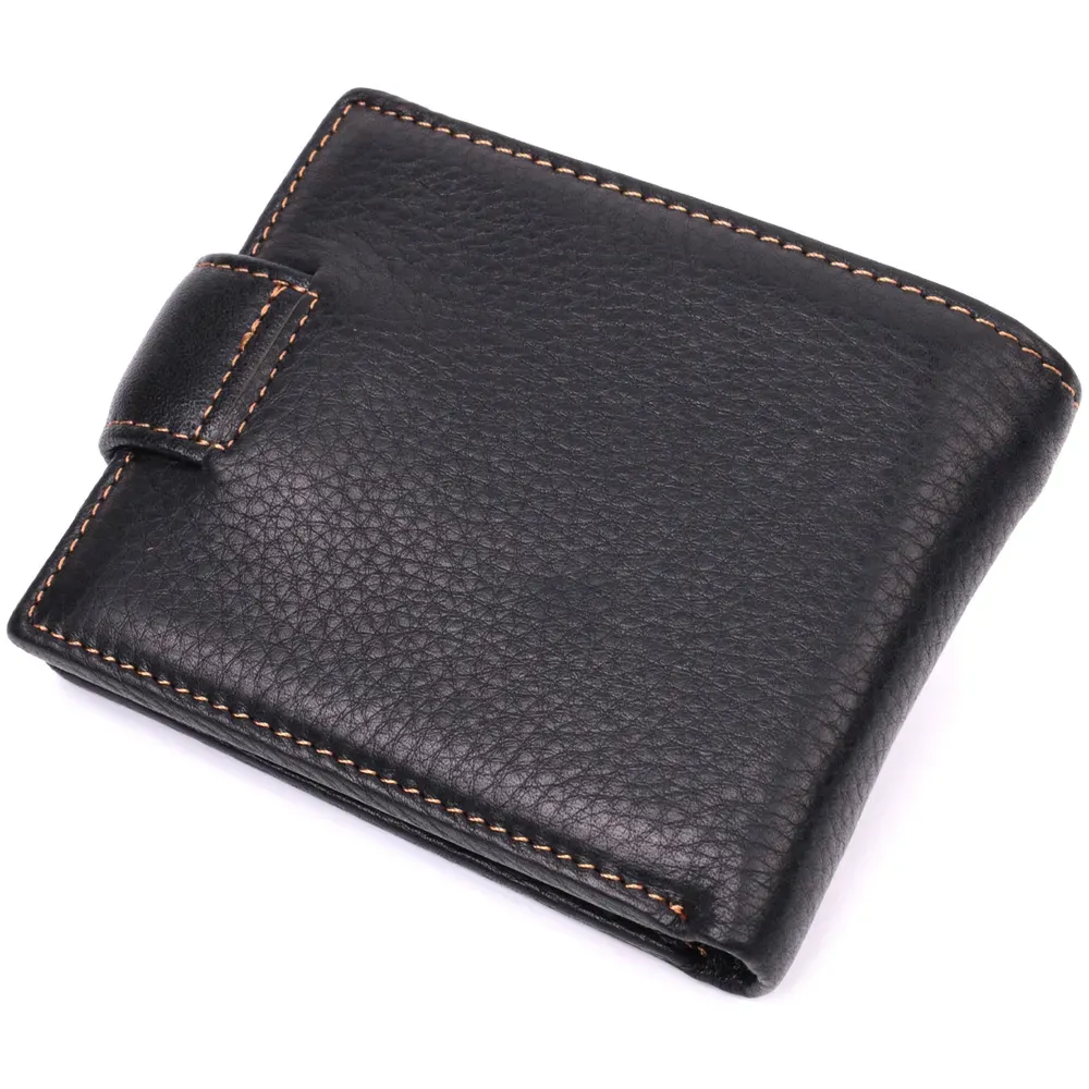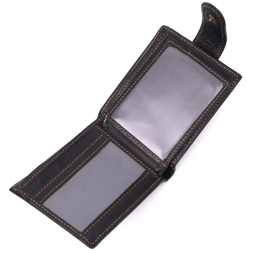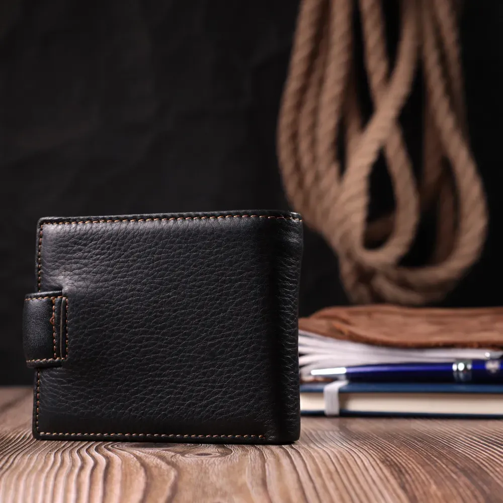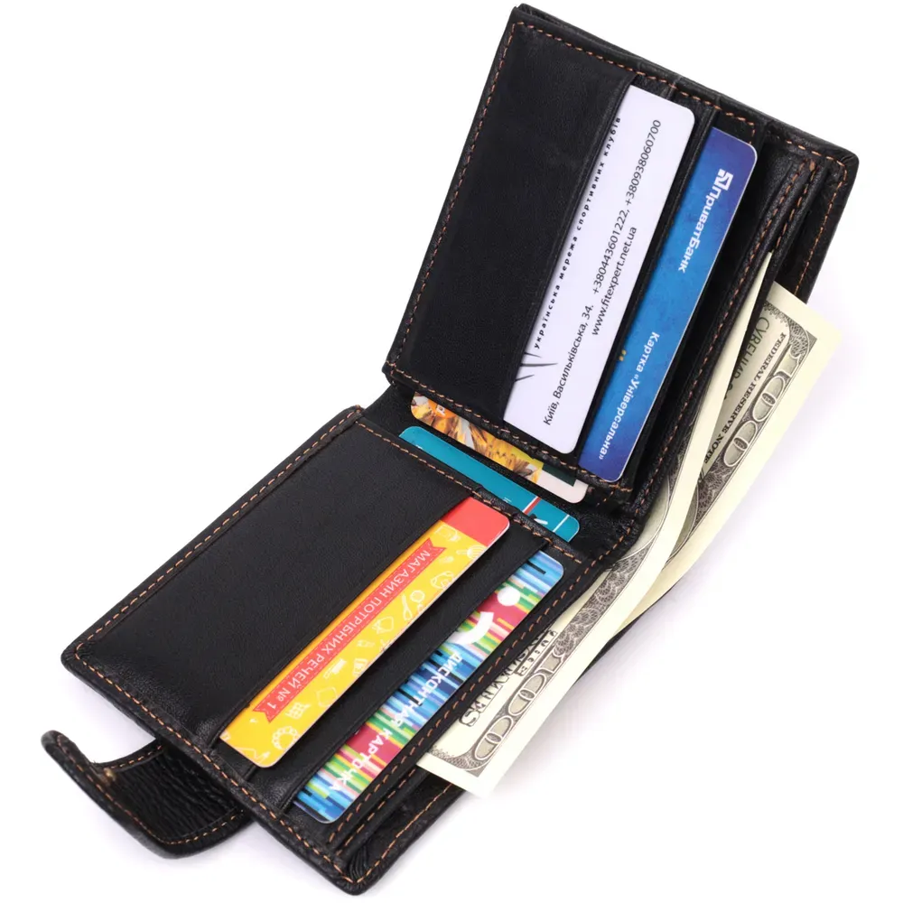Компактний чоловічий гаманець чорного кольору із натуральної шкіри. Аксесуар прошитий рівним рядком коричневого кольору. Гаманець має різні відділення та багато кишень для візиток та кредиток. Відмінний варіант на подарунок, щоб порадувати рідних та близьких.