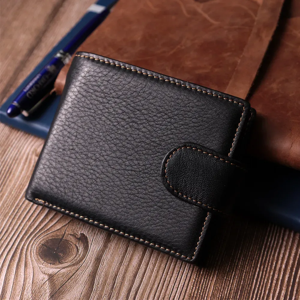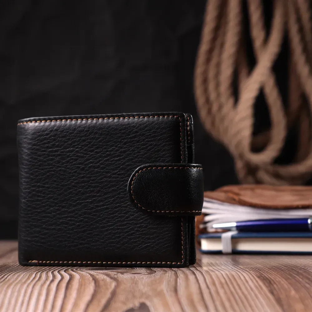 - чоловічий гаманець із натуральної шкіри, що закривається хлястиком на кнопку;