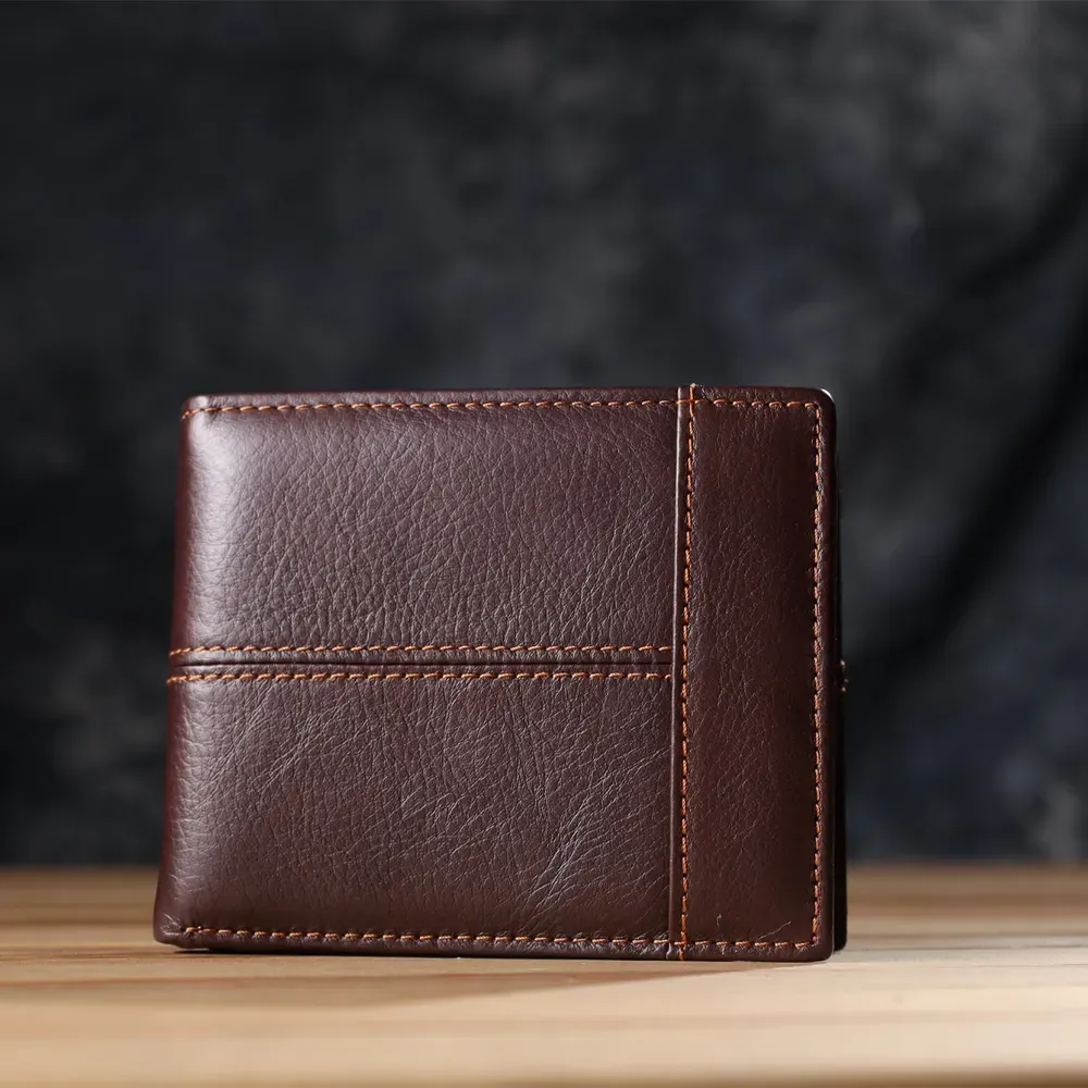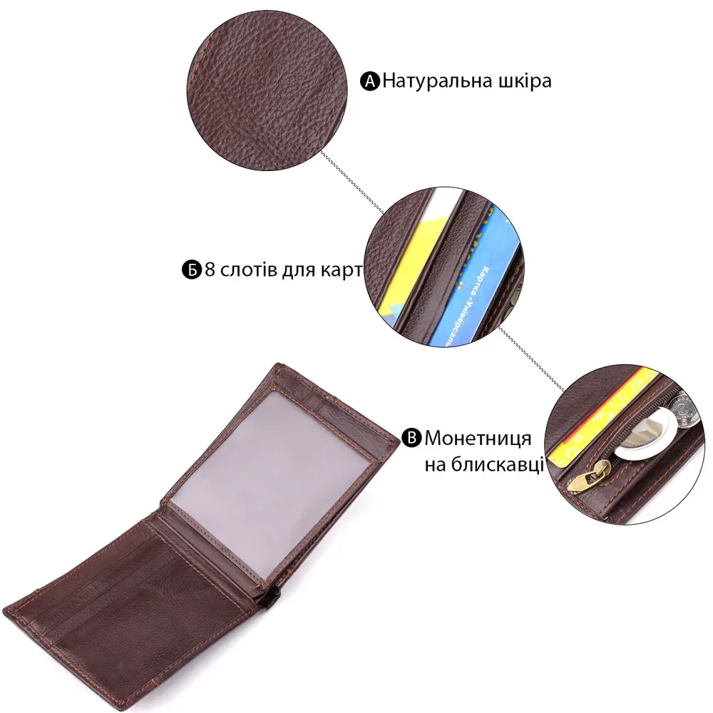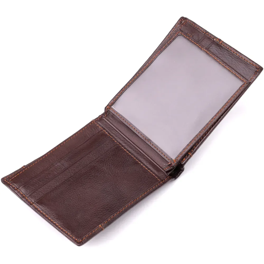 Якісний чоловічий гаманець, виготовлений з натуральної шкіри преміальної якості. Аксесуар акуратно прошитий надміцною коричневою ниткою, що надає виробу додаткову міцність і підкреслює його елегантний зовнішній вигляд. Гаманець приємний на дотик, з продуманою до дрібниць внутрішньою організацією. Компактний та зручний, він легко поміщається в кишеню чи сумку, забезпечуючи швидкий доступ до всіх необхідних речей. Модель складається навпіл і не має застібки, що робить використання ще більш зручним та практичним. Всередині гармонійно поєднуються елементи з натуральної шкіри та щільного текстилю, що збільшує термін служби аксесуара. Гаманець поставляється в білому текстильному чохлі, що робить його відмінним варіантом для подарунка.