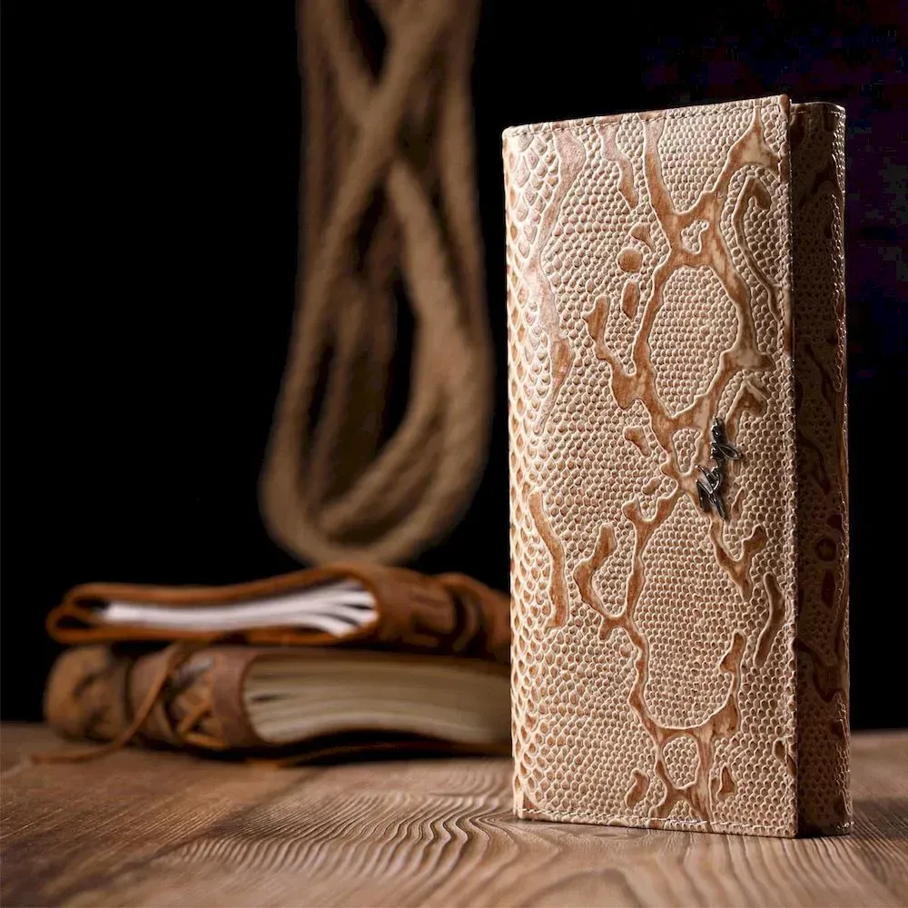 Місткий жіночий гаманець з натуральної лакованої шкіри, з тисненням під рептилію. Складається аксесуар навпіл, закривається клапаном на кнопку. Якісна фурнітура доповнює та прикрашає виріб. Такий гаманець з натуральної шкіри - це ідеальний варіант на кожен день для тих, хто цінує якість, зручність та комфорт, а також чудово доповнюватиме Ваш повсякденний образ. Запакований аксесуар у фірмову коробку та пакет бренду. Вироби з натуральної шкіри завжди будуть чудовим подарунком для близької людини.