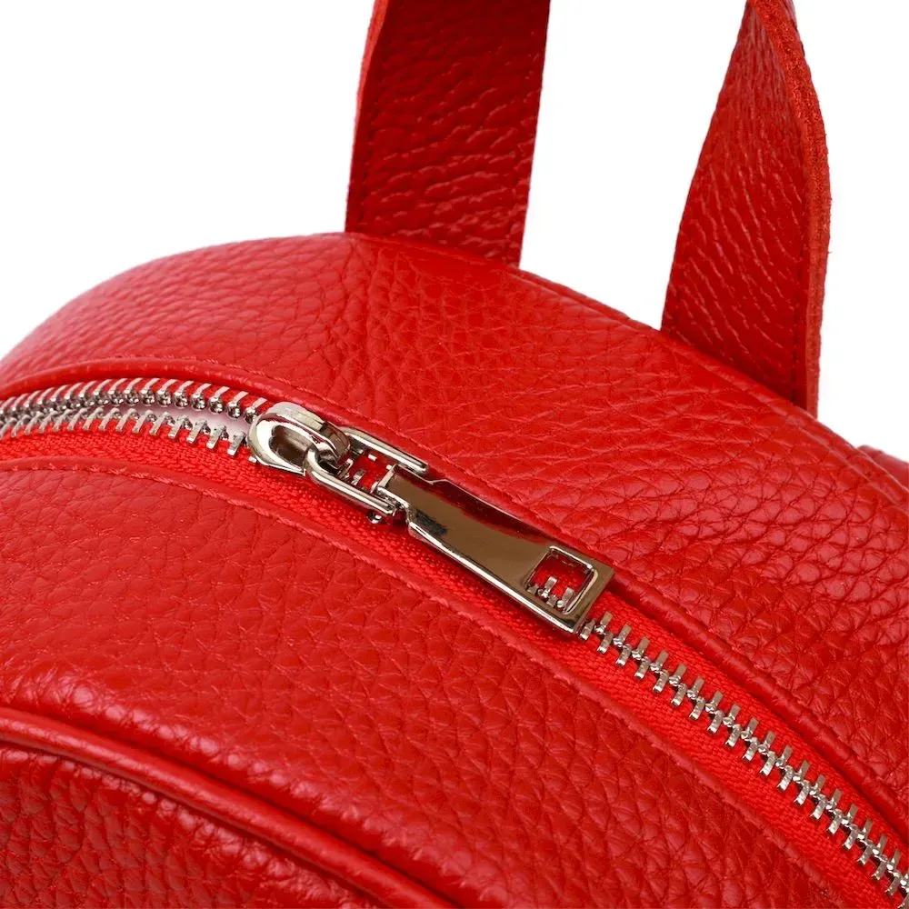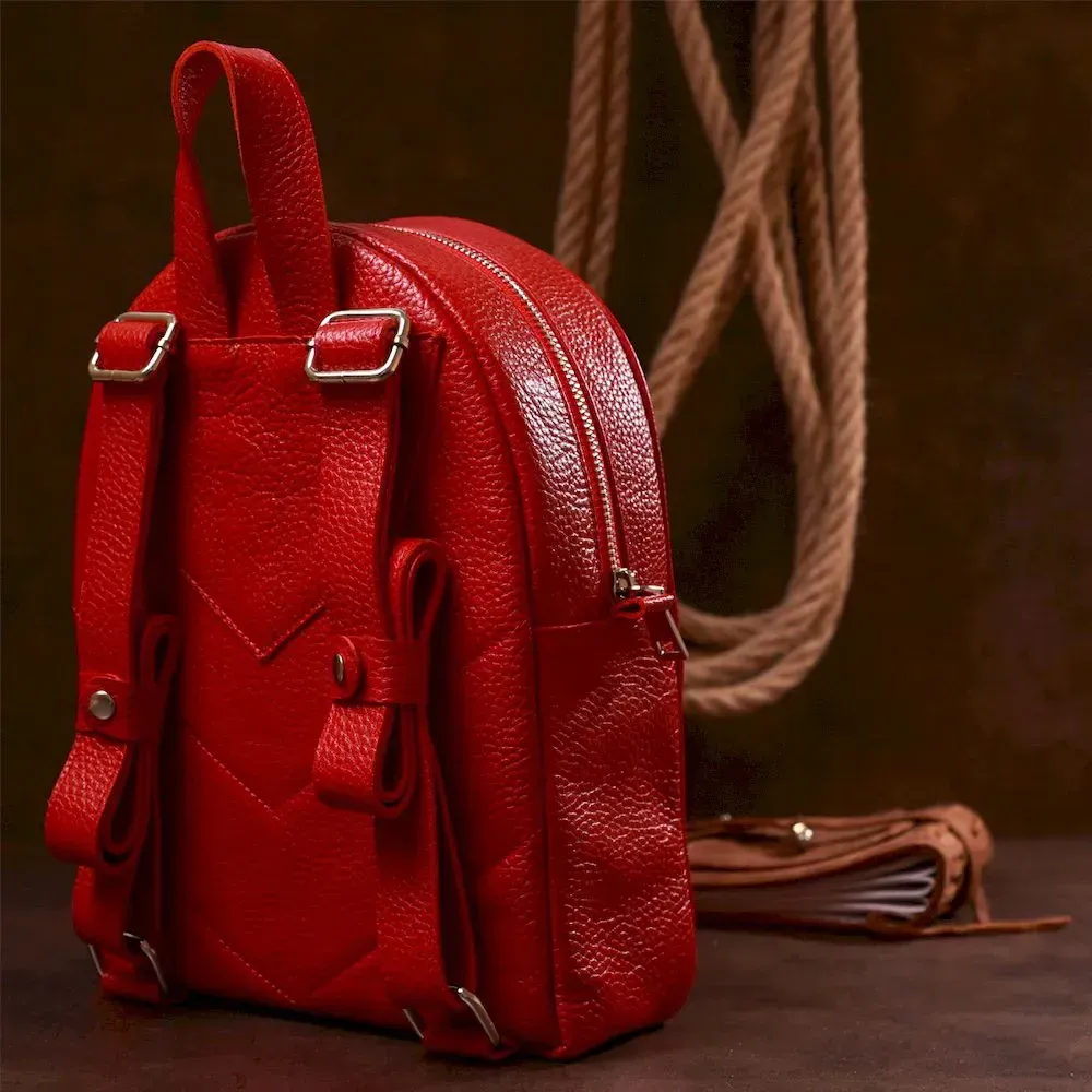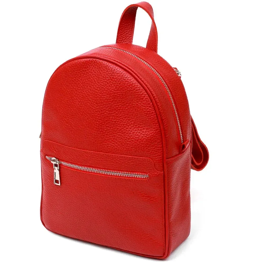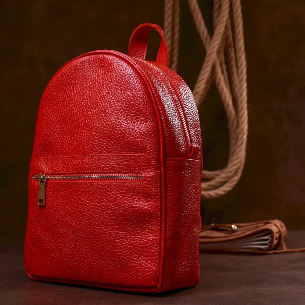 Чудовий жіночий рюкзак невеликого розміру з натуральної висококласної шкіри з покращеними показниками міцності та стійкості до зносу. Внутрішнє наповнення представлене у вигляді просторого основного відділення, двох кишень усередині та одного зовні, що дуже зручно та практично. Колір виробу – насичений червоний, фактура – зерниста і дуже приємна на дотик.