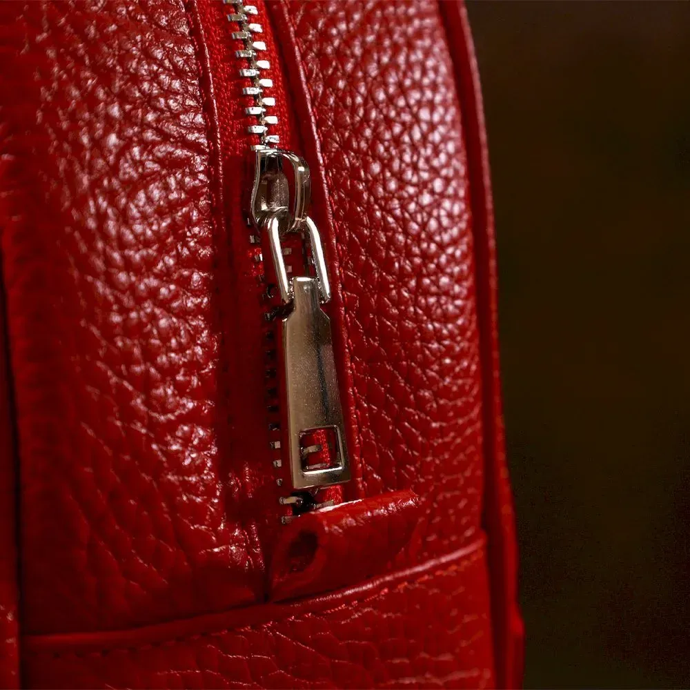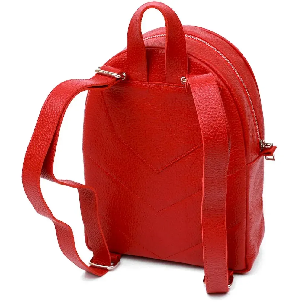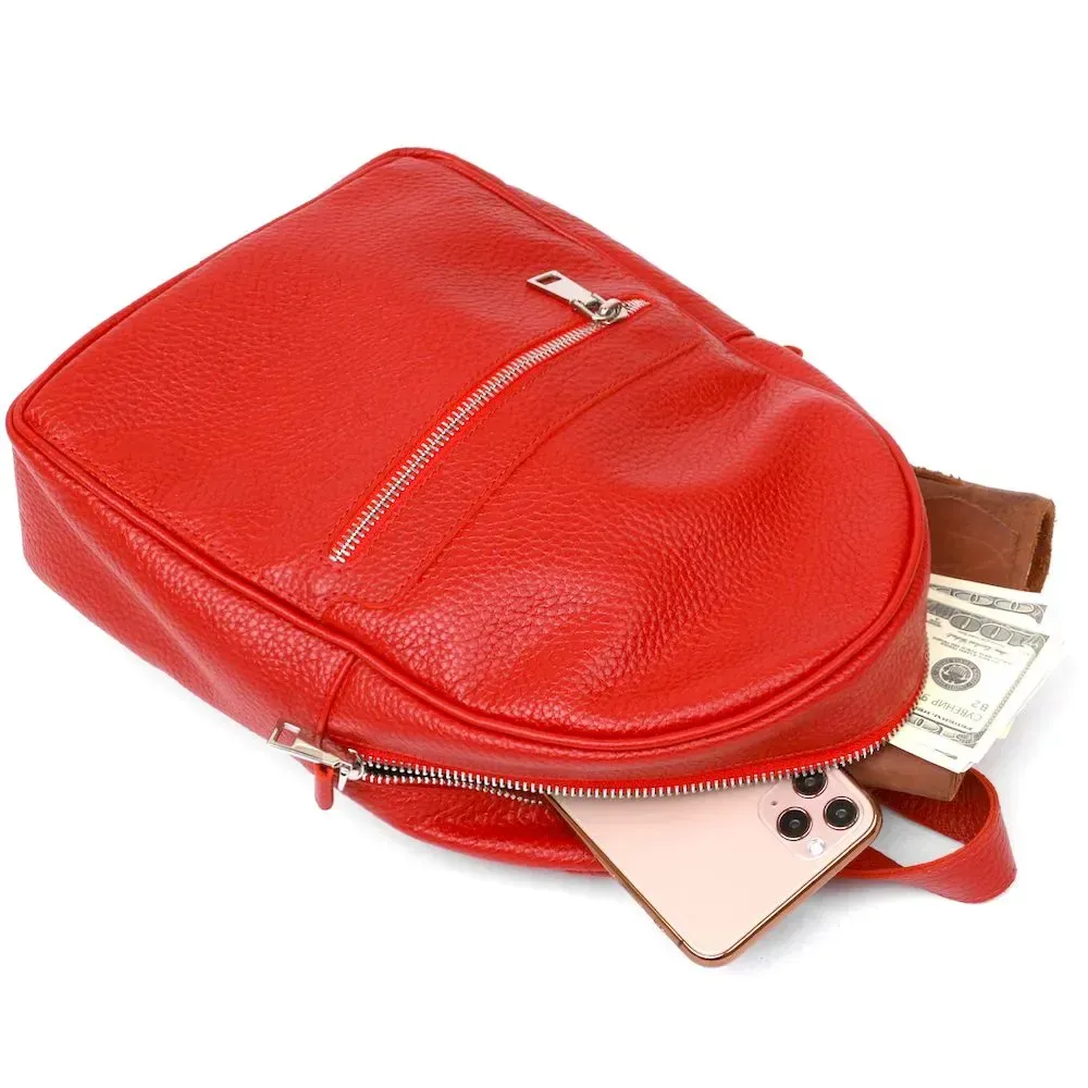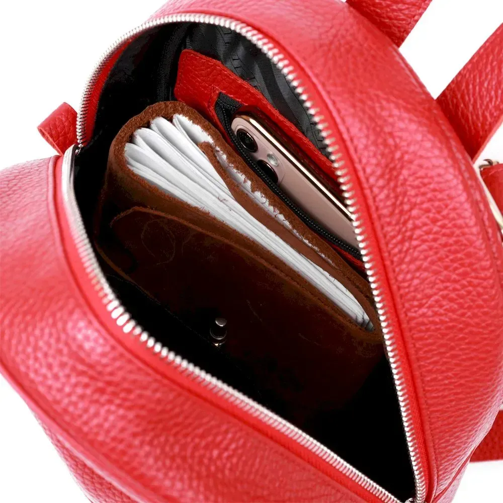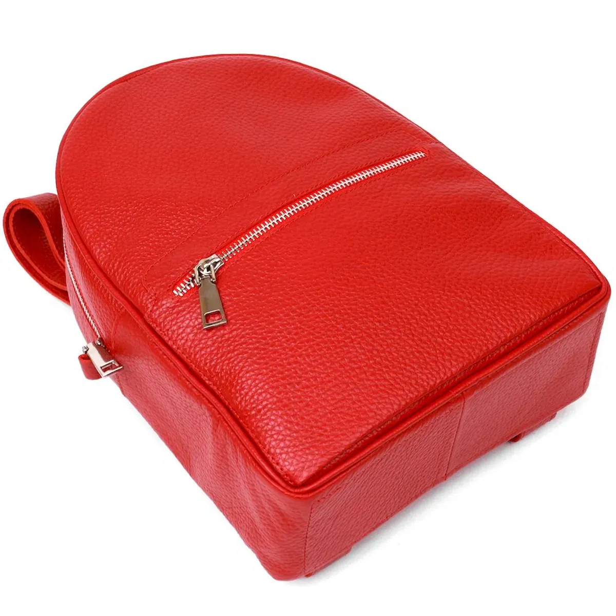 Чудовий жіночий рюкзак невеликого розміру з натуральної висококласної шкіри з покращеними показниками міцності та стійкості до зносу. Внутрішнє наповнення представлене у вигляді просторого основного відділення, двох кишень усередині та одного зовні, що дуже зручно та практично. Колір виробу – насичений червоний, фактура – зерниста і дуже приємна на дотик.