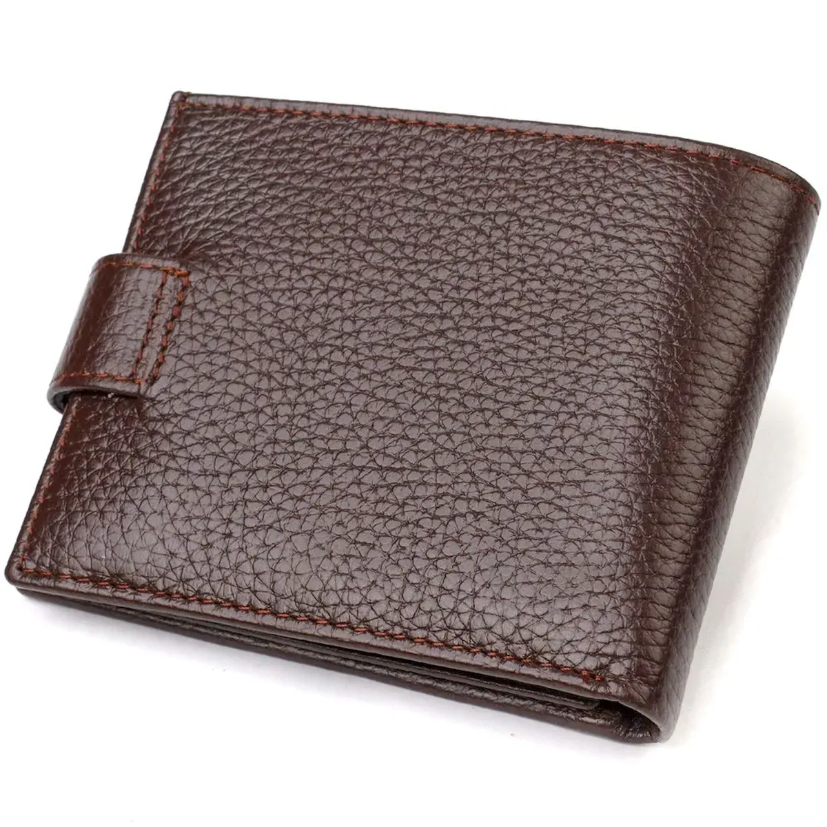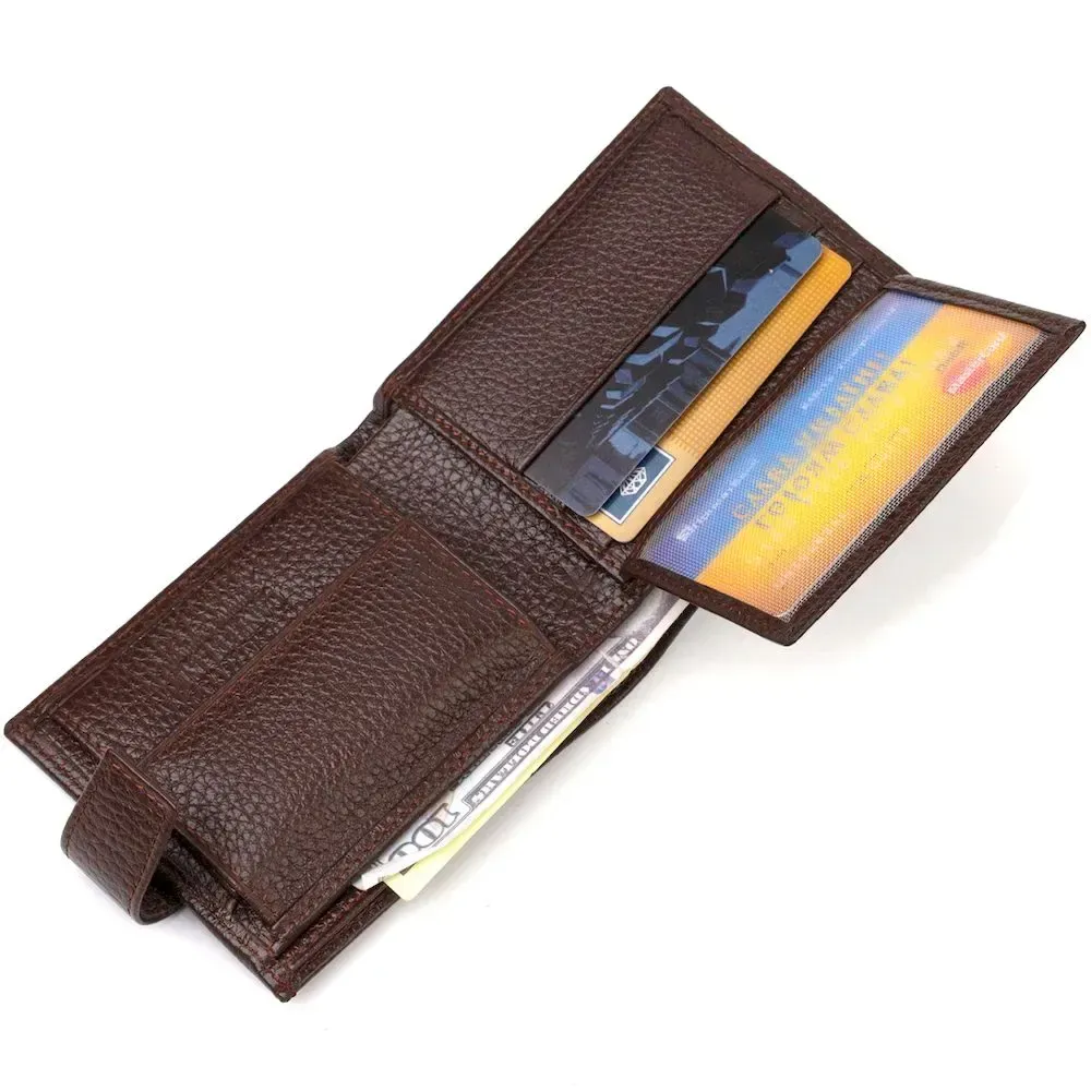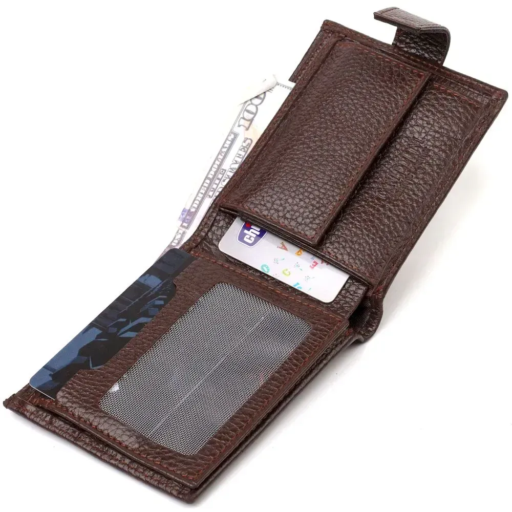Чоловічий портмоне невеликого розміру з натуральної зернистої шкіри. Аксесуар має основне відділення для купюр з перегородкою, три осередки для карток, дві кишені під сіточкою, дві прилеглі кишені та монетницю. Гаманець складається навпіл, закривається хлястиком на кнопку. На лицьовій стороні в правому нижньому кутку розташований металевий логотип компанії виробника. Багатофункціональний чоловічий гаманець з дуже міцної шкіри чудовий вибір подарунка для солідного чоловіка.
