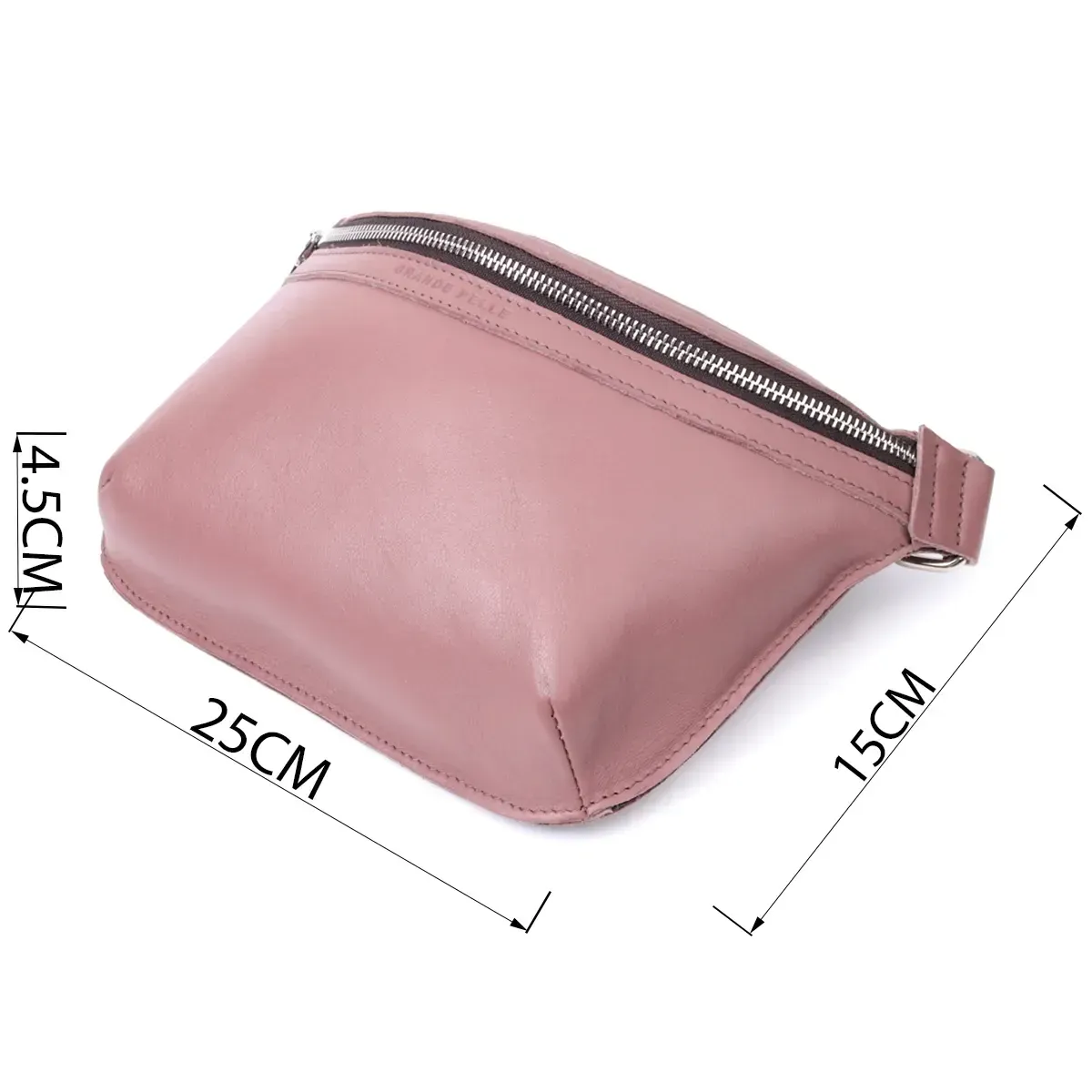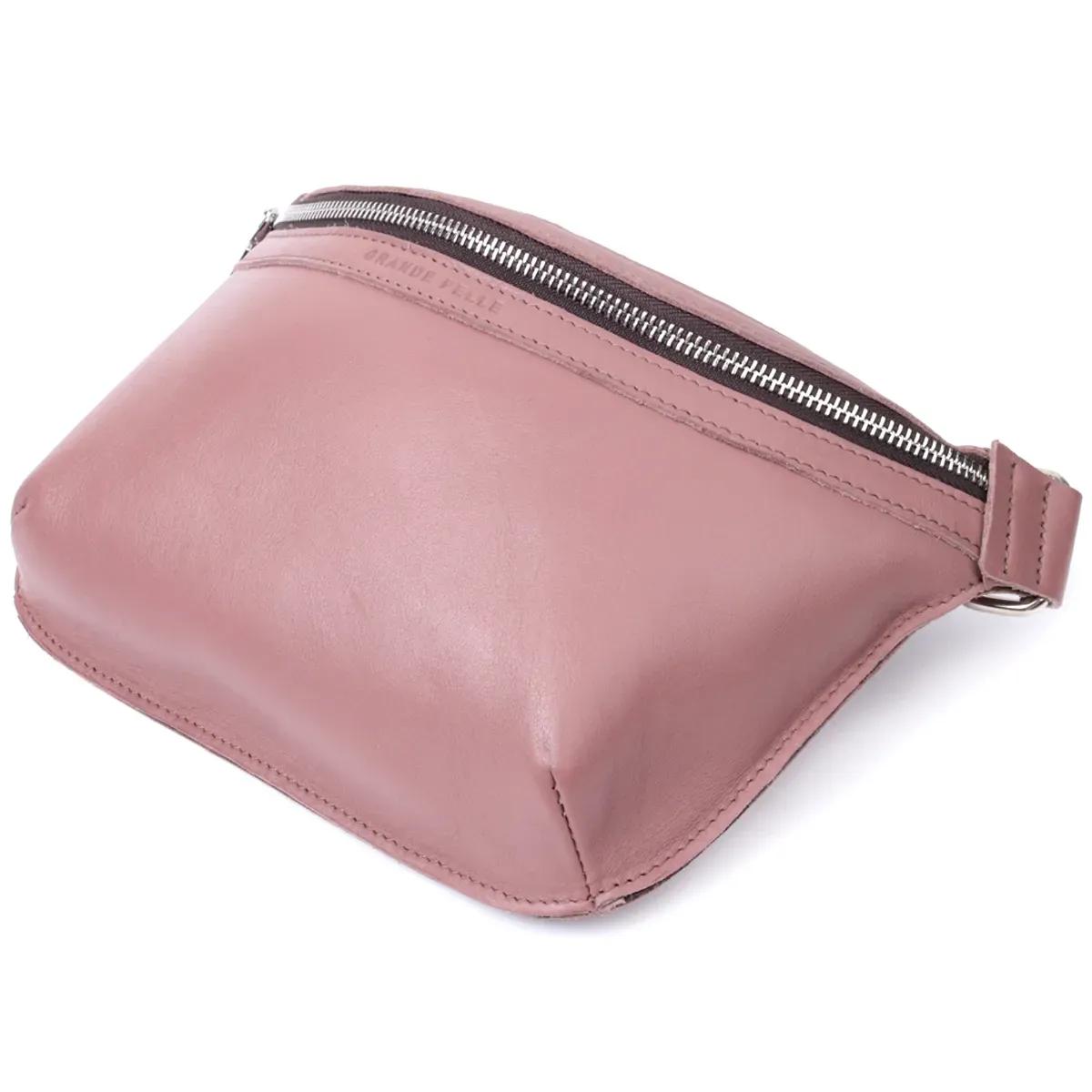 Стильна жіноча поясна сумка з натуральної люксової шкіри, в красивому бежево-рожевому кольорі. Складається модель з одного просторого відділення, в якому знаходиться кишеня відкритого типу та кишені на тильній стороні зовні. Вона виглядає дуже сучасно, завдяки красиво підібраній фурнітурі кольору срібла, елегантним рівним рядкам та якісній шкірі, що переливається на сонці. Ідеальний подарунок для близької людини. Сумочка упакована в якісний фірмовий повстяний чохол.
