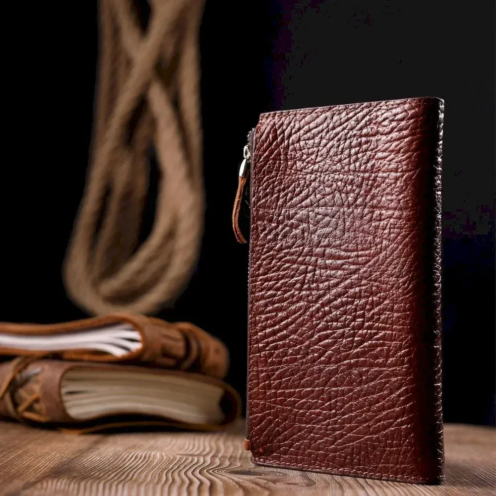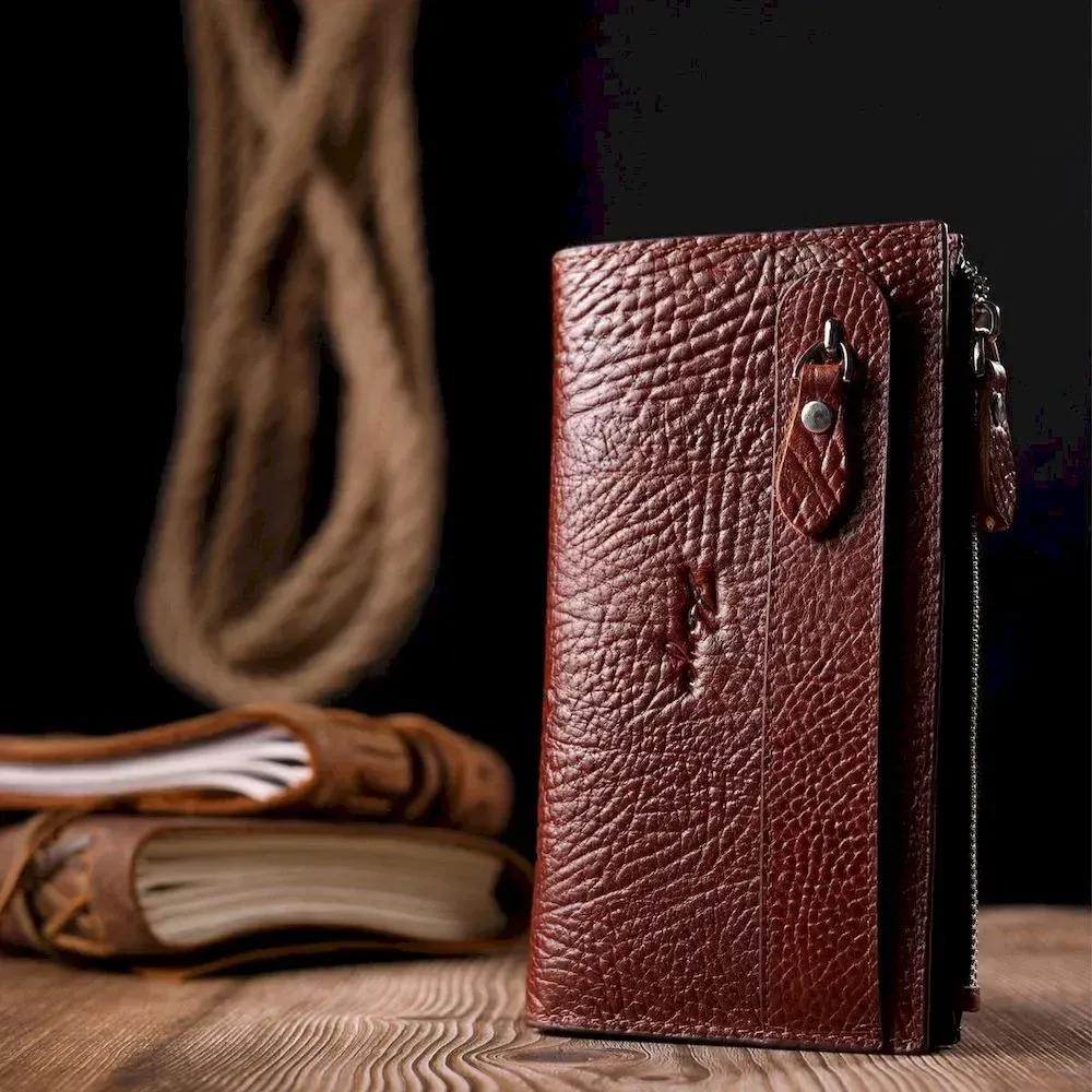 Цікавий гаманець з натуральної шкіри у красивому коричневому кольорі. Складається аксесуар навпіл, закривається на кнопку. Якісна фурнітура доповнює та прикрашає виріб. Такий гаманець з натуральної шкіри - це ідеальний варіант на кожен день для тих, хто цінує якість, зручність та комфорт, а також чудово доповнюватиме Ваш повсякденний образ. Запакований аксесуар у фірмову коробку та пакет бренду. Вироби з натуральної шкіри завжди будуть чудовим подарунком для близької людини.