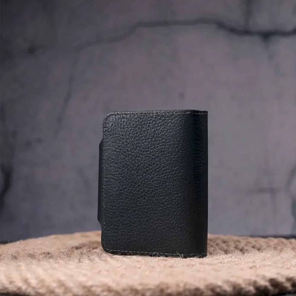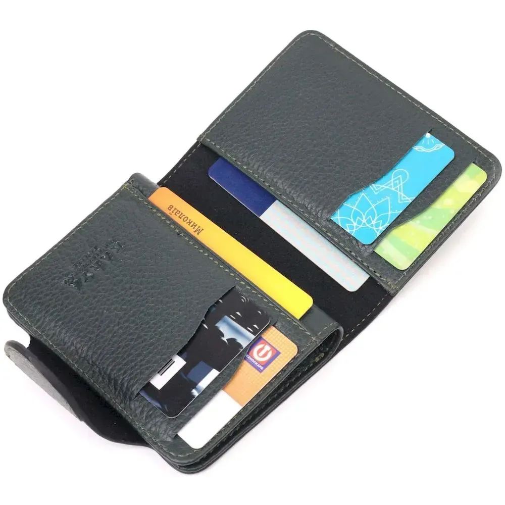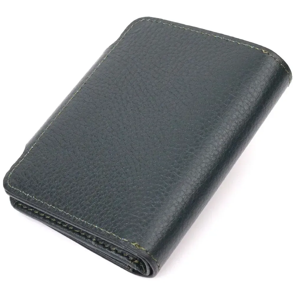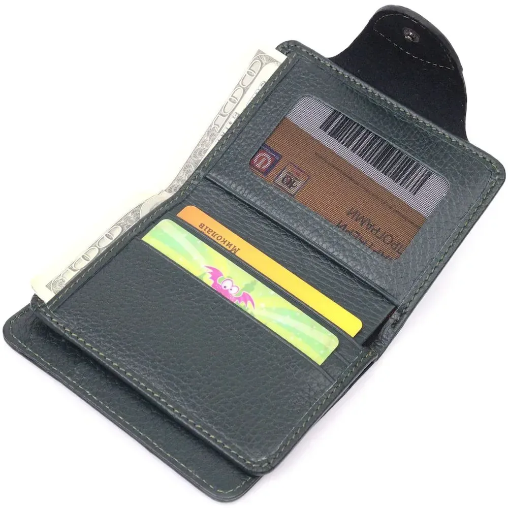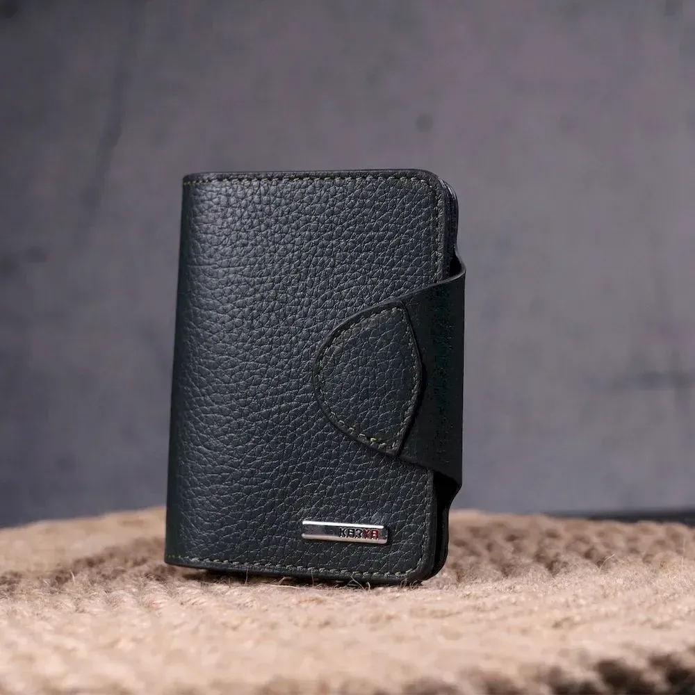 Оригінальний жіночий гаманець з натуральної шкіри в зеленому кольорі. Складається аксесуар навпіл, з фіксацією на хлястик та кнопку. Якісна фурнітура доповнює та прикрашає виріб. Такий гаманець з натуральної шкіри - це ідеальний варіант на кожен день для тих, хто цінує якість, зручність та комфорт, а також чудово доповнюватиме Ваш повсякденний образ.