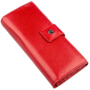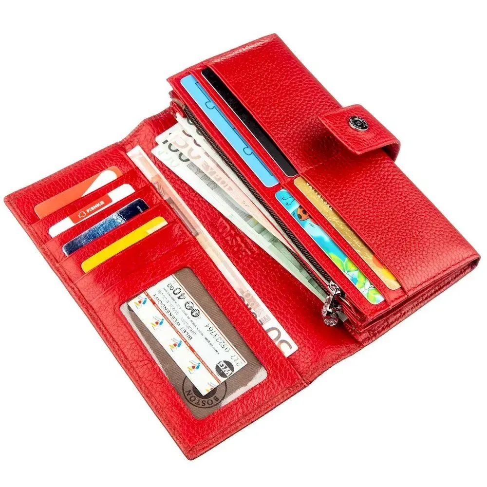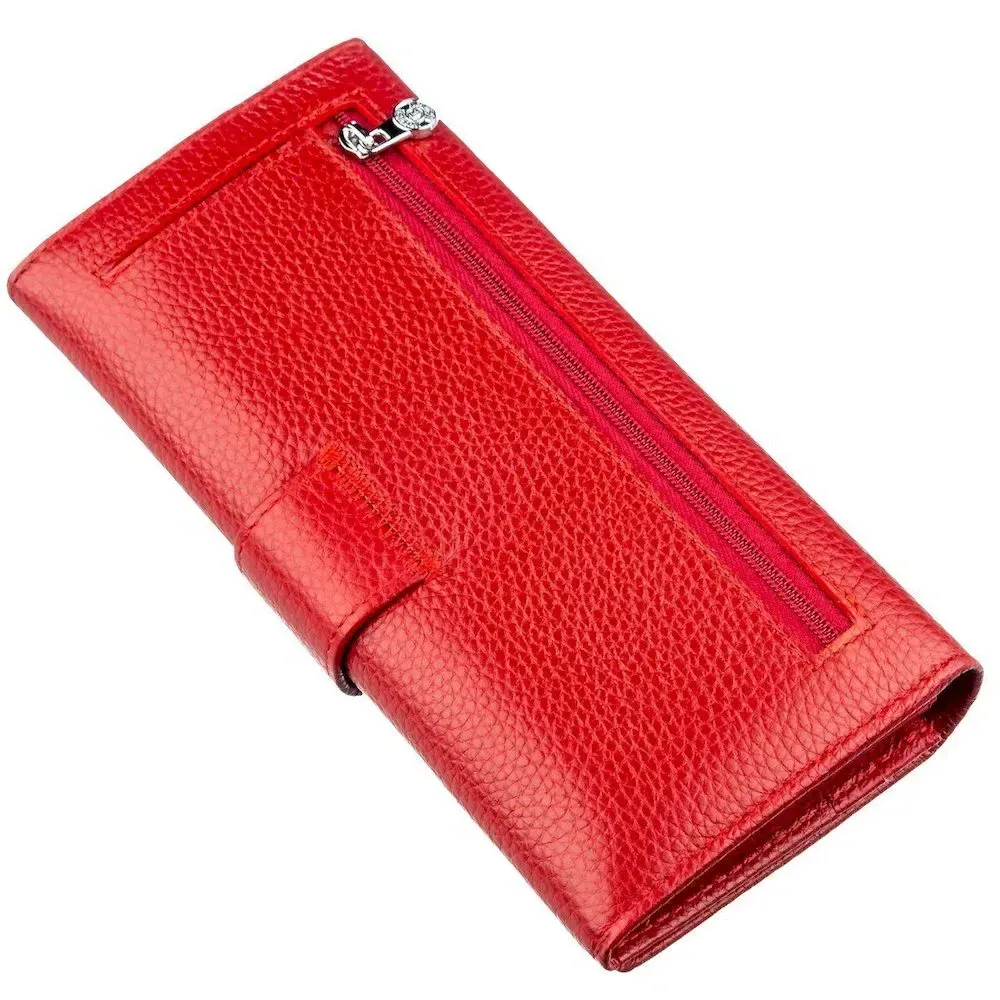Вишуканий жіночий гаманець з натуральної шкіри красивого червоного кольору. Шкіра, яка використана для виготовлення цього гаманця, має зернисту матову фактуру. Вона м'яка та приємна на дотик, має чудові експлуатаційні характеристики, і прослужить Вам довгий час. Власницю даного аксесуара порадує його місткість і практичність, тому що в ньому є велика кількість різних відділень, у тому числі і на блискавці, що запобігає непередбаченому випаданню дрібниць. Також у гаманці передбачено чотирнадцять кишень для візиток, карток та кредиток. Зробіть собі чи іншій близькій людині такий подарунок і він залишиться дуже задоволеним. Запаковано цей виріб у щільну картонну коробку.