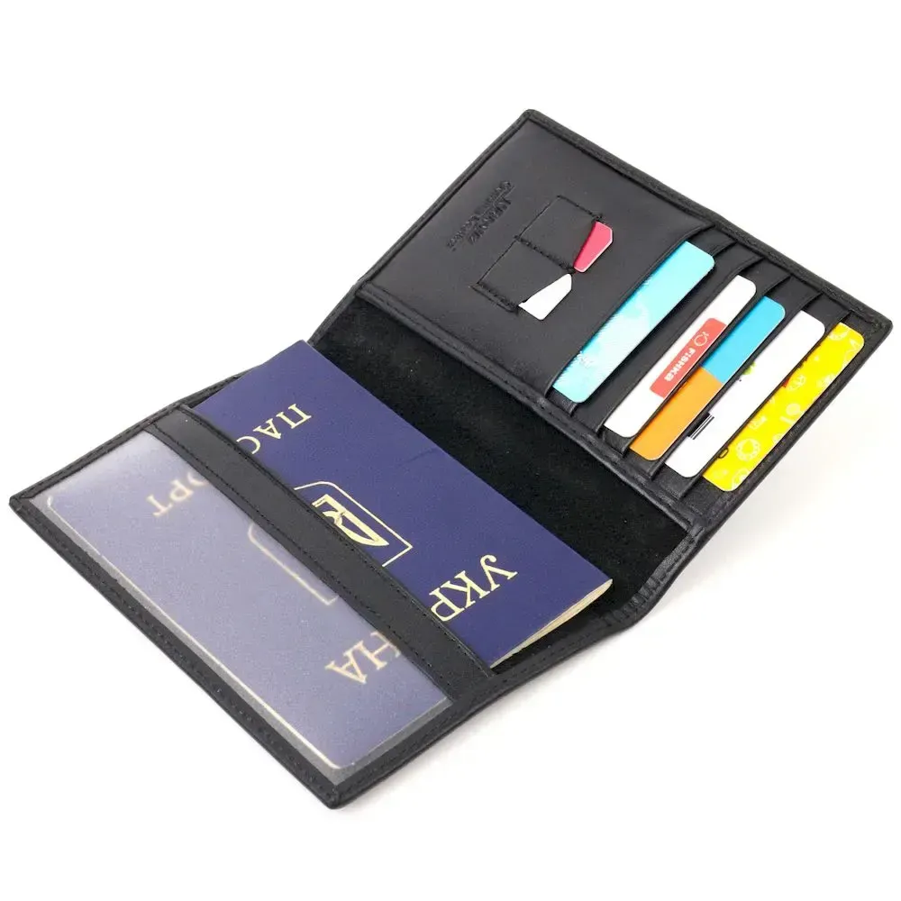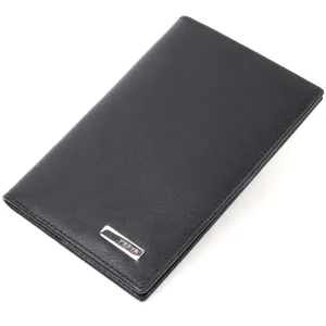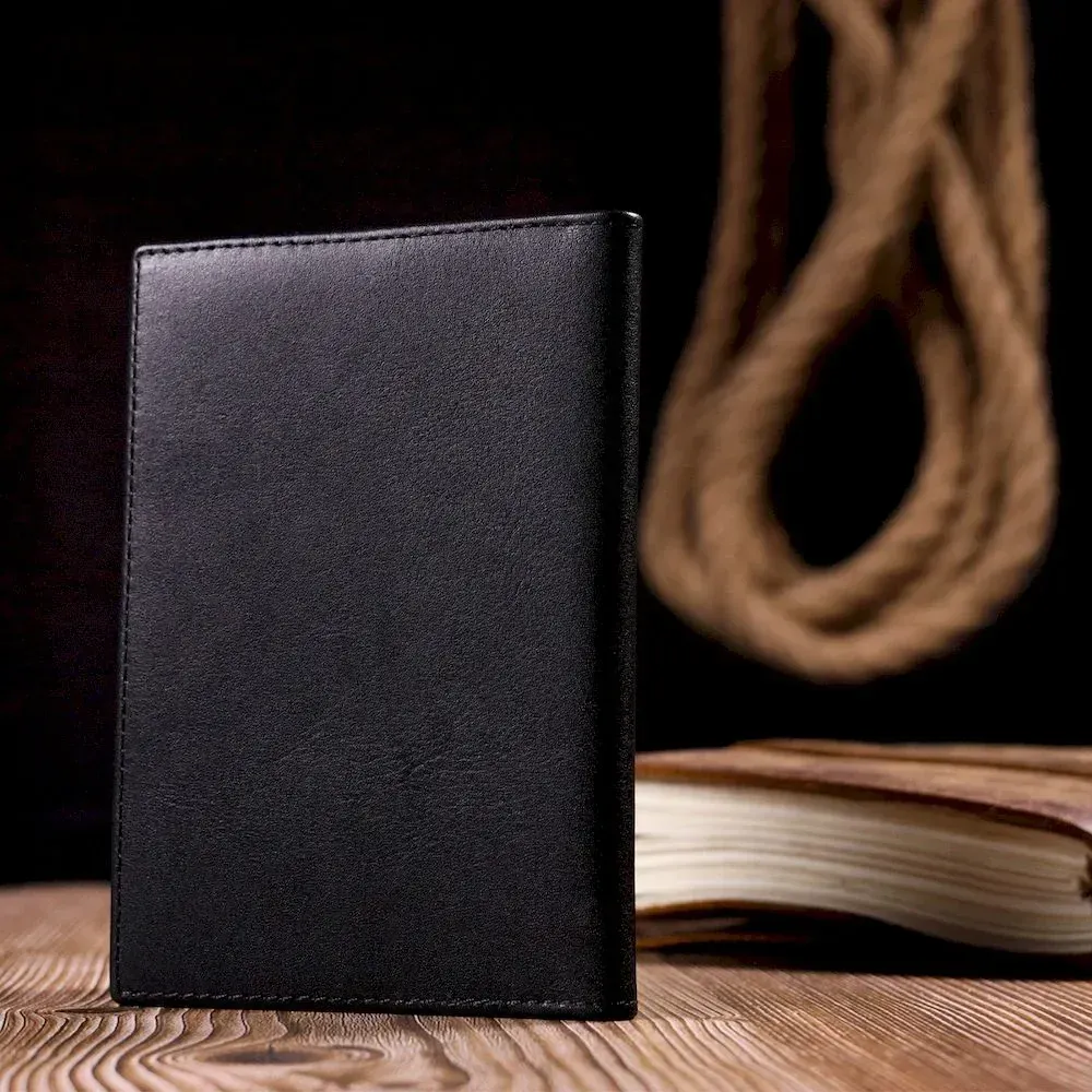 Якісна чорна обкладинка для документів преміум класу. Модель виготовлена з натуральної гладкої шкіри. Сучасний висококласний аксесуар, який стане ідеальним подарунком для близької людини з приводу. Обкладинка упакована у фірмову коробочку.