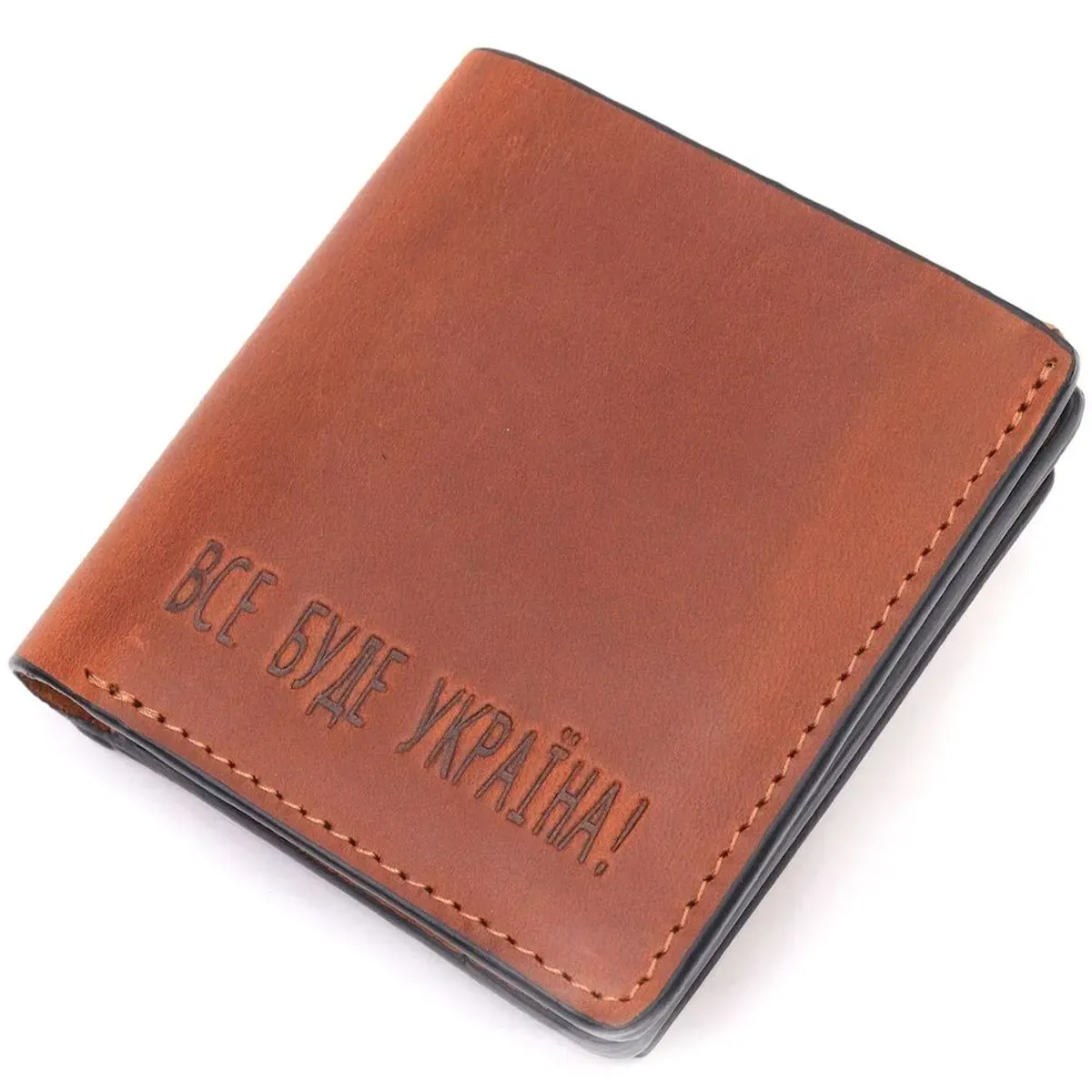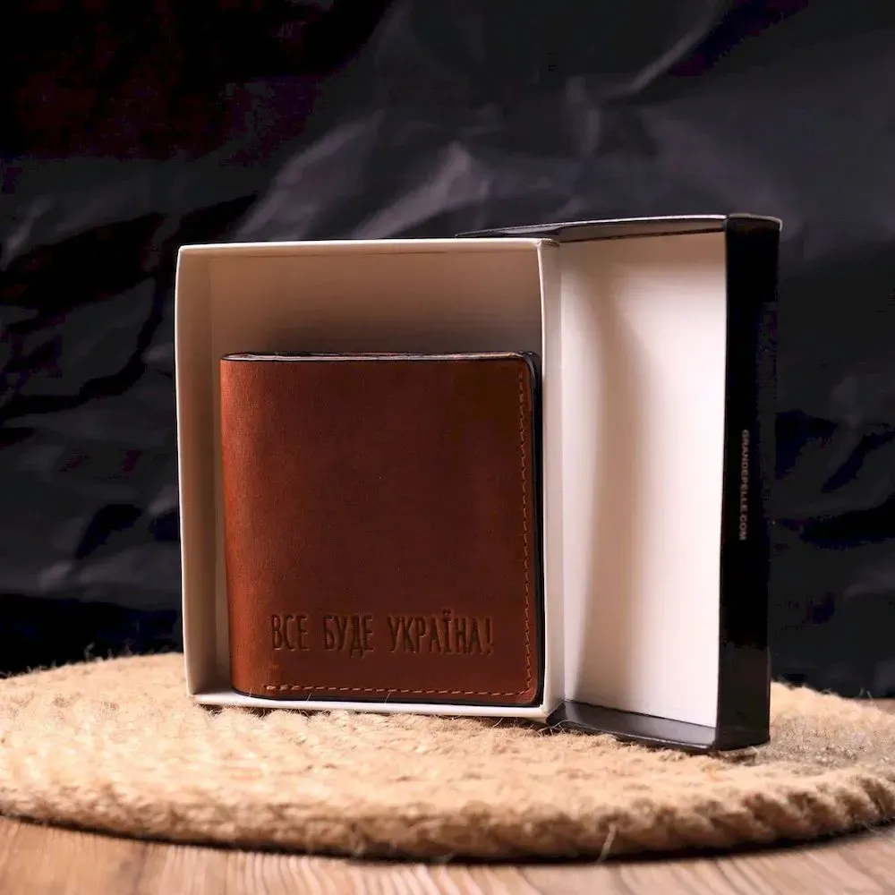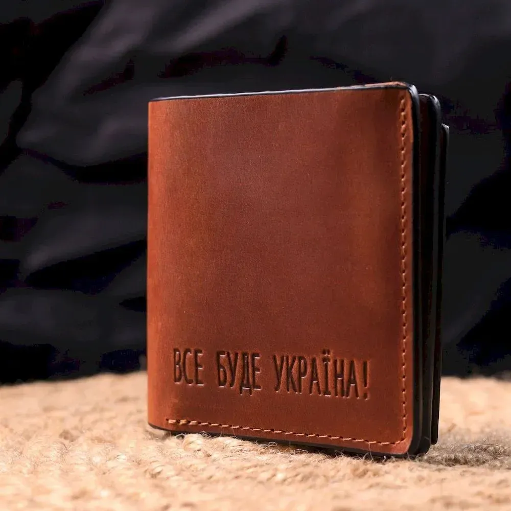 Чудовий шкіряний гаманець у світло-коричневому кольорі з патріотичним написом “Все буде Україна”. Виріб пошитий із якісної гладкої шкіри, з високими показниками зносостійкості. Портмоне має два великих відділення для купюр усіх номіналів, а також достатню кількість відділень для карток та монетницю, застібається виріб на надійний магніт. Шкіряний гаманець стане чудовим подарунком на всі випадки життя.