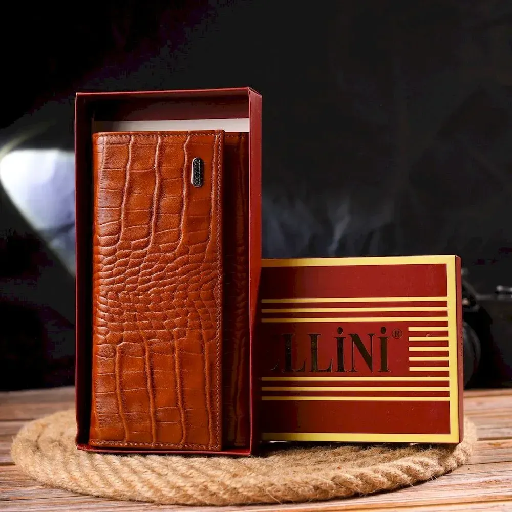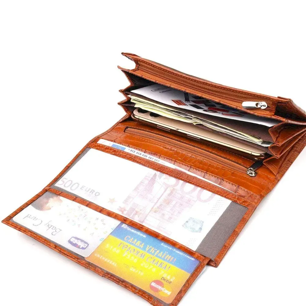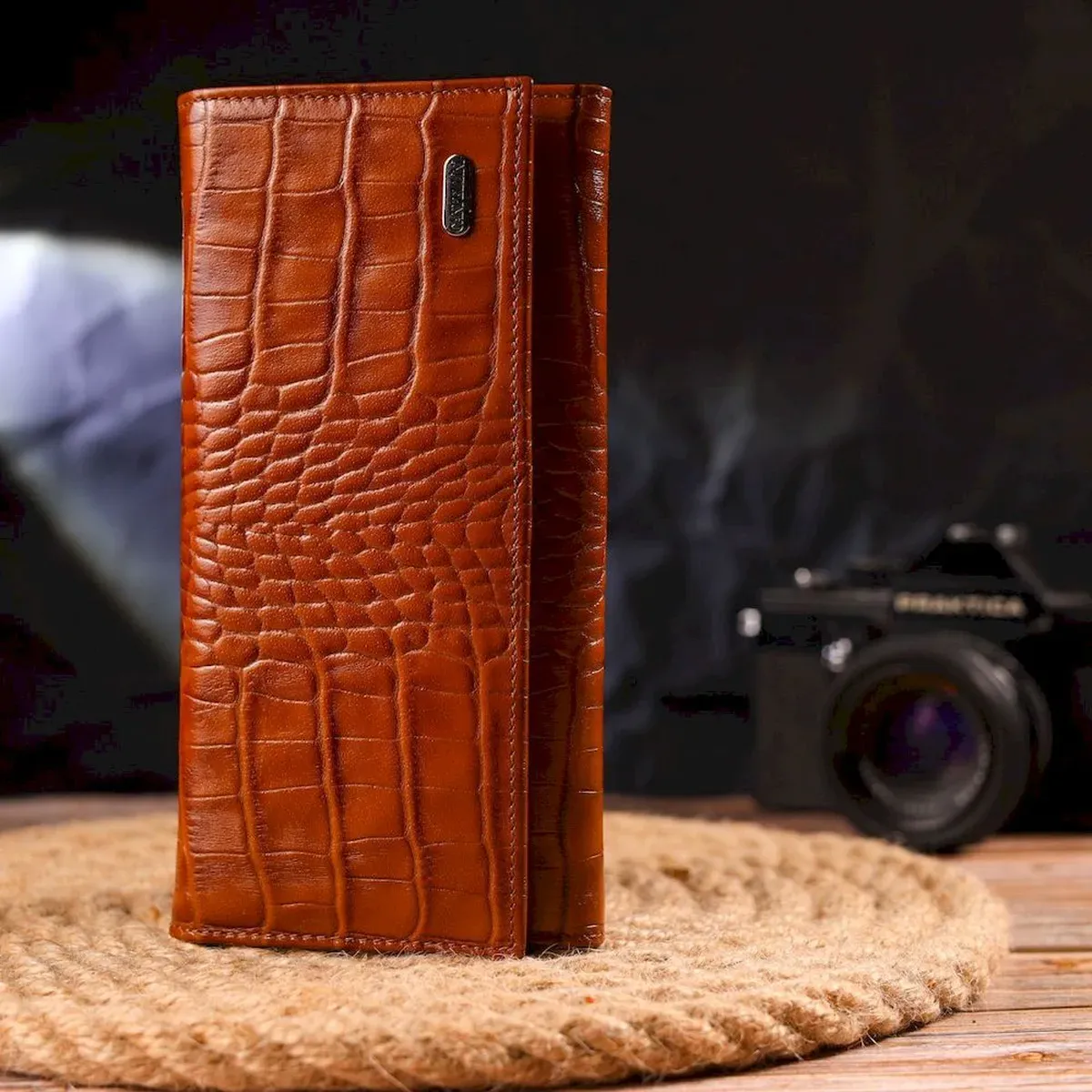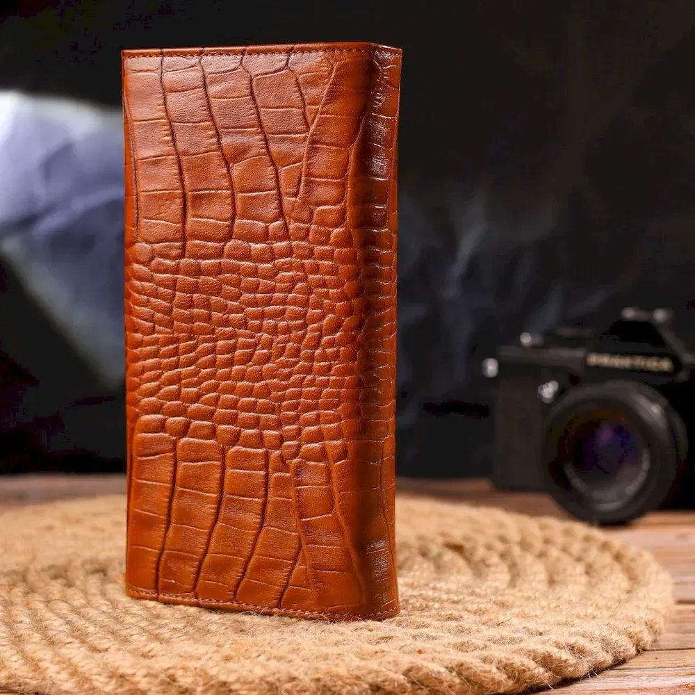 Унікальний горизонтальний жіночий гаманець, із фактурної натуральної шкіри, з тисненням під крокодила. Аксесуар має три великі кишені для купюр, три прилеглі кишені, вісім осередків для карток, три з них під сіточкою, монетницю на блискавці. Виріб закривається клапаном на кнопку. Відмінна ідея для подарунка, яка не залишить байдужою жодну жінку.