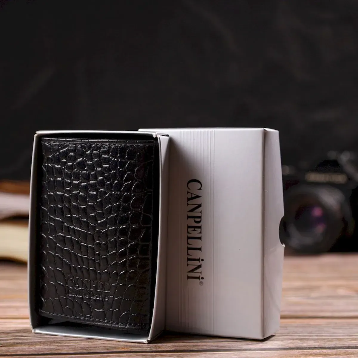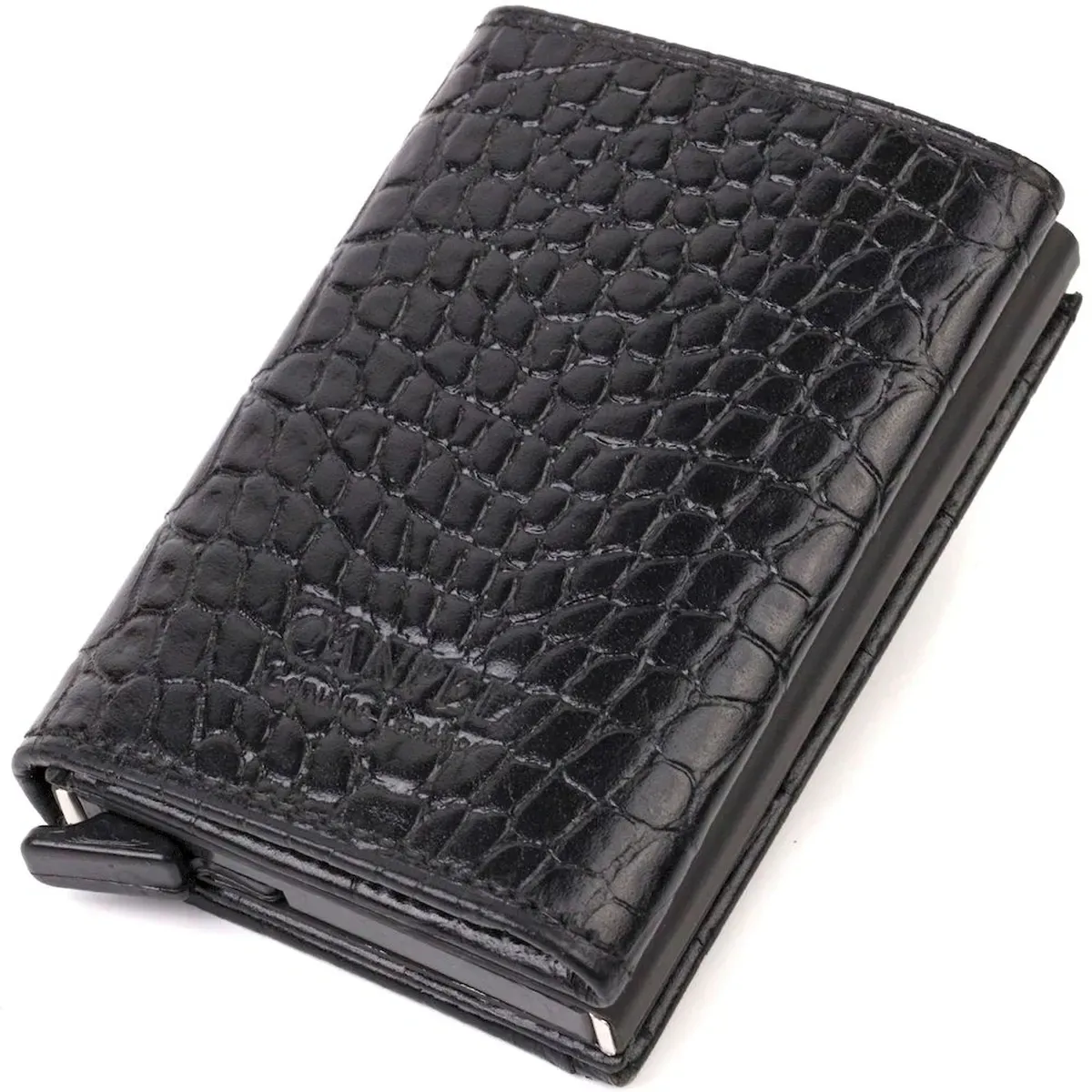 Картхолдер унісекс у три складання з автоматичним механізмом з натуральної шкіри з тисненням під крокодила CANPELLINI 21930 Чорний
