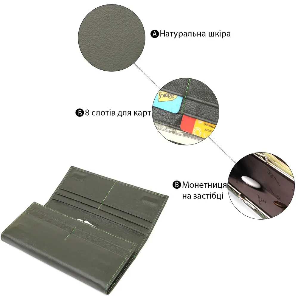 Елегантний жіночий гаманець глибокий зелений колір. Виконано аксесуар із натуральної шкіри. Виглядає дуже модно та стильно. До того ж гаманець ще й дуже практичний, тому що має всі необхідні відділення та кишені для Ваших цінностей. Усередині є три основні великі відділення для купюр, відділення на блискавці для інших цінностей, кишені для кредитних карток і зручна монетниця на металевій клямці. Також є одне зовнішнє містке відділення. Закривається цей гаманець на зручні магніти, які розташовані з обох боків. Запаковано виріб у білу картонну коробку.