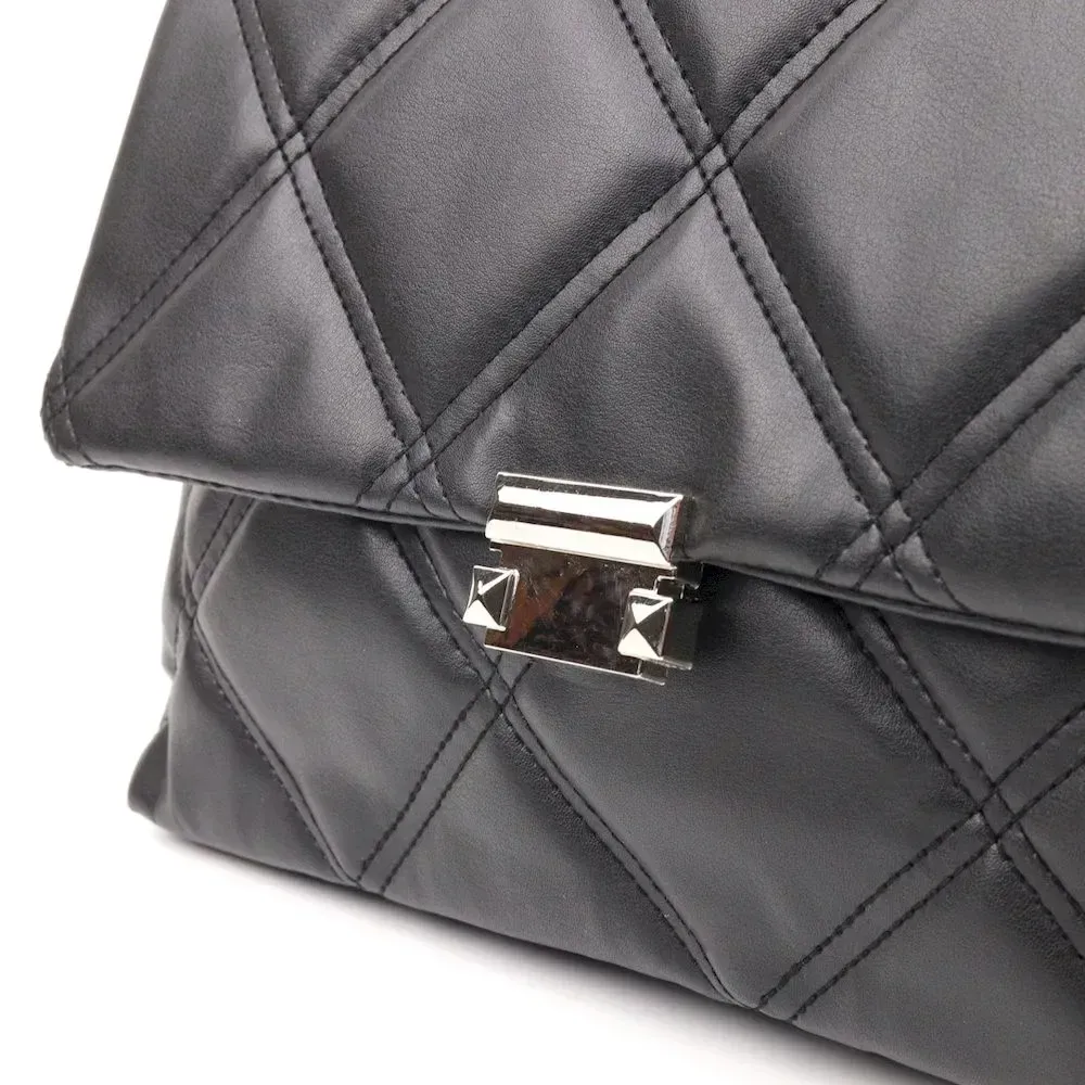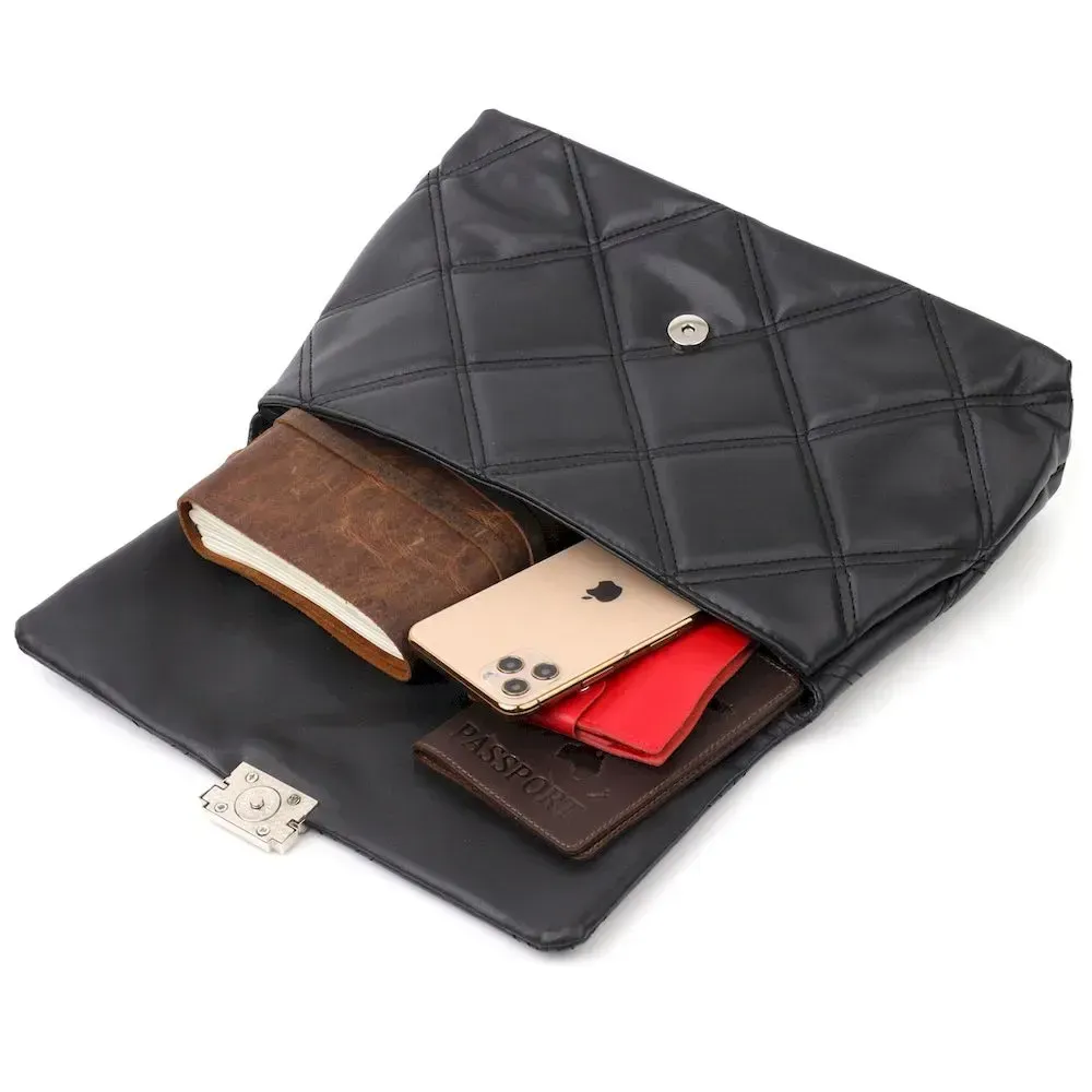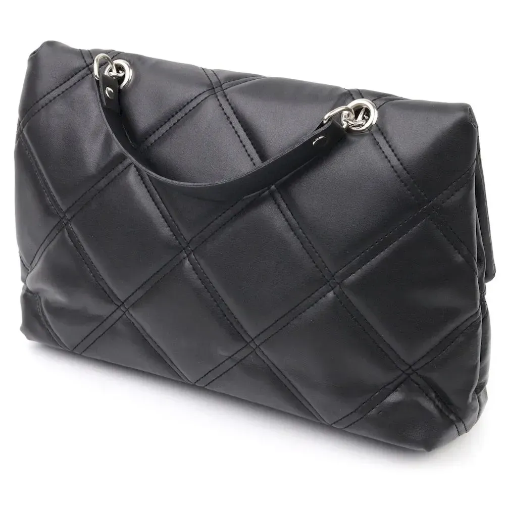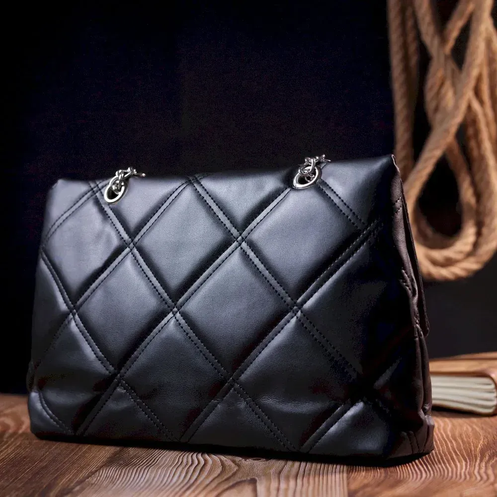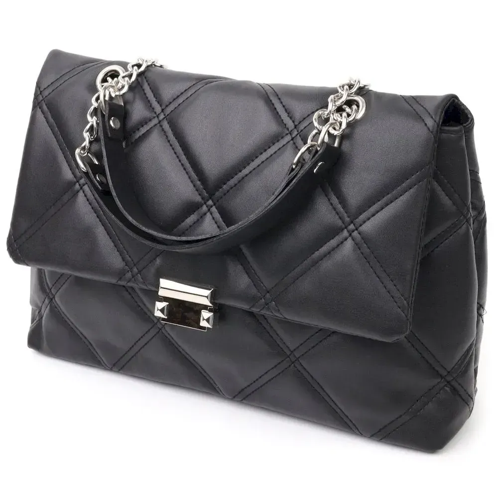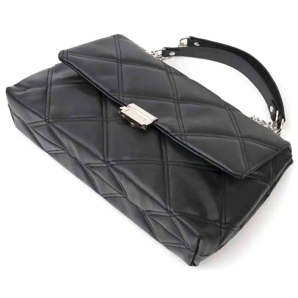 Прекрасна сумка горизонтального типу в класичному чорному кольорі зі стьобаної еко-шкіри. Сумка має стильний дизайн та незвичайну металеву пряжку, сріблястого кольору. Аксесуар виглядає презентабельно та підійде як під вечірній, так і повсякденний образ. Фурнітура в сумці сріблястого кольору, ремінь – поєднання ланцюжка та еко-шкіри. Модель довгий час залишається у ідеальному стані, таку сумку приємно носити. Може бути чудовим варіантом для подарунка близькій людині.